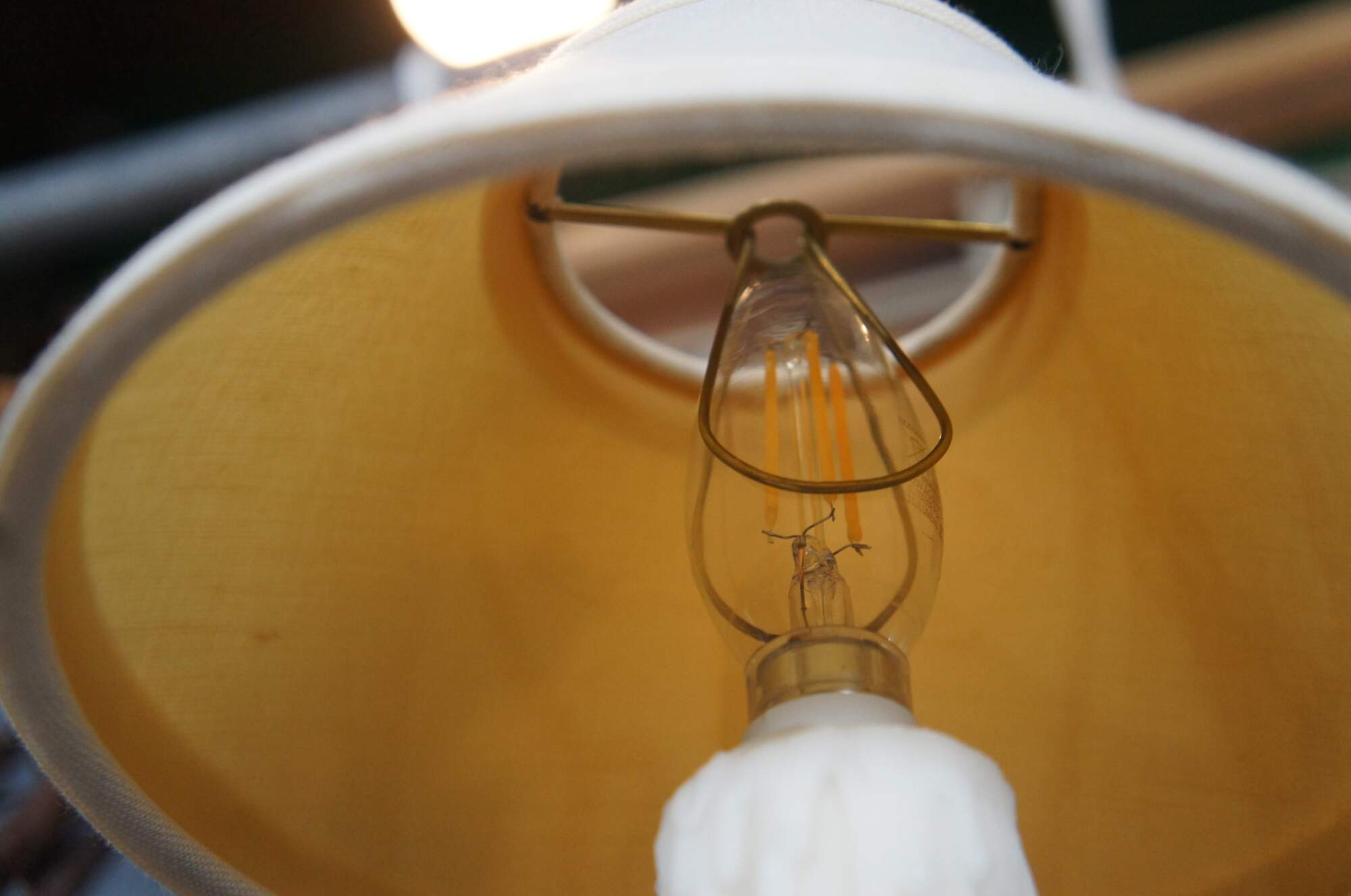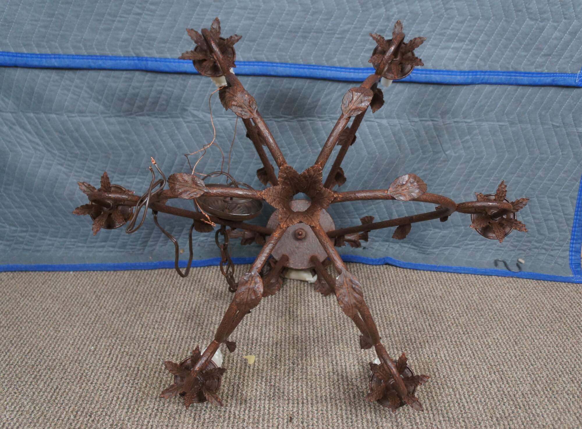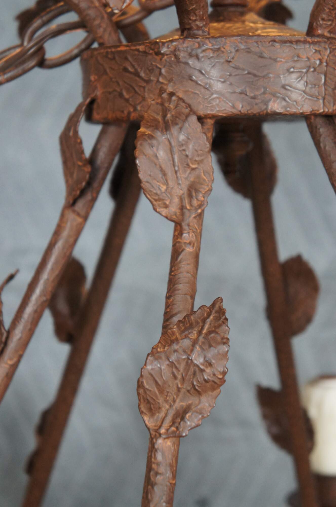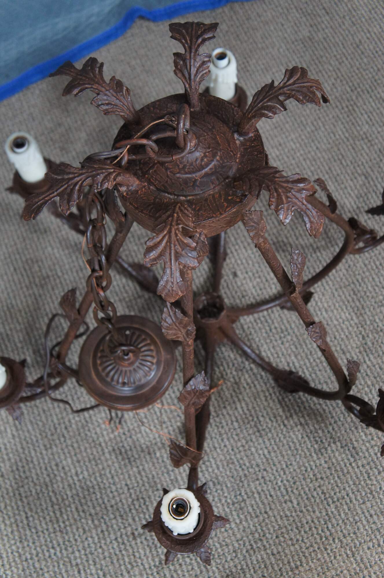 Late 20th century scrolled iron 6 arm chandelier by Dana Creath Designs. Cage like shape of six scrolling arms decorated with acnthus leaves, terminating in wax faux candles. Rough bronze finish. Includes white fabric shades. Hard wired.