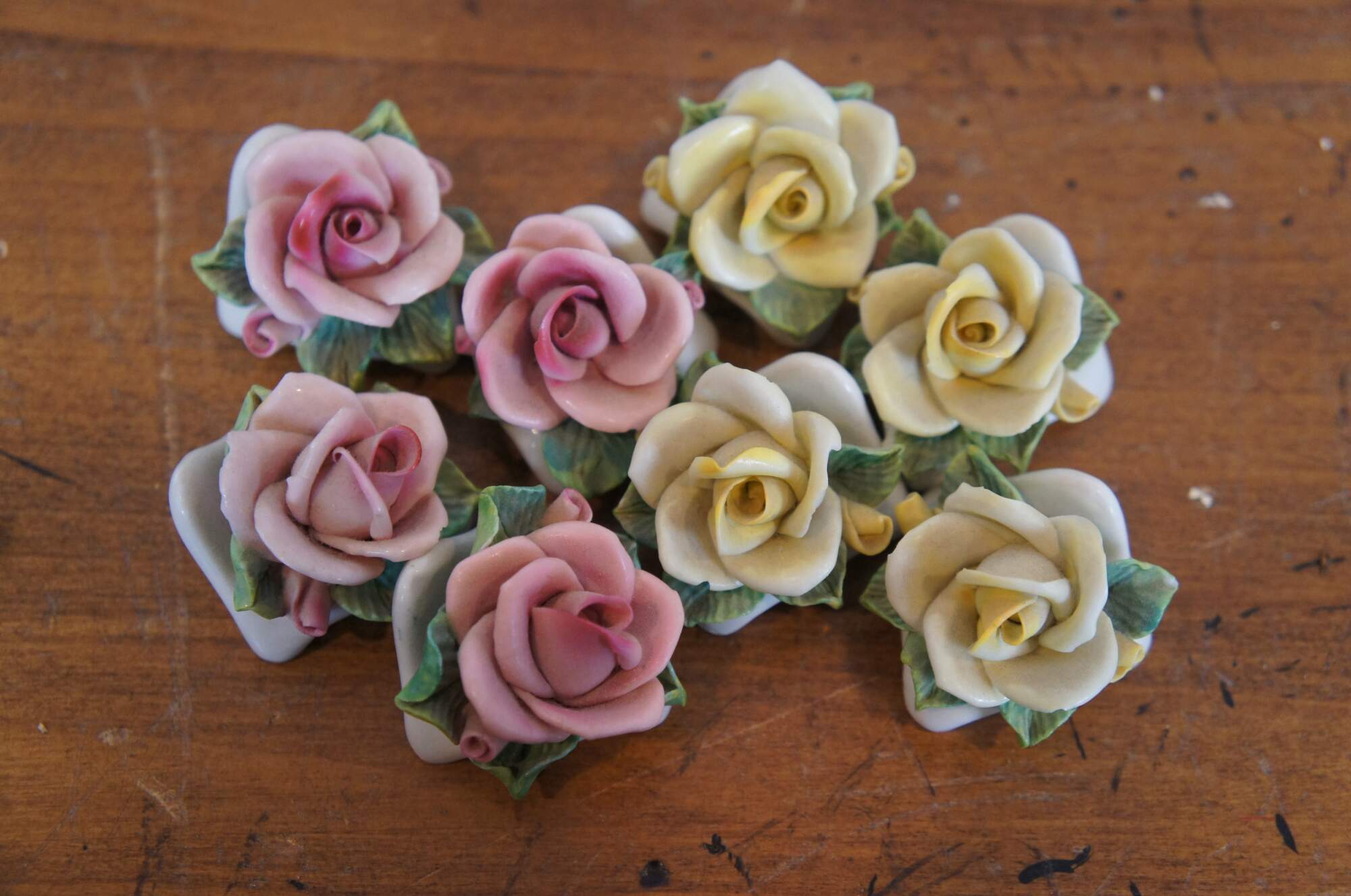 Set of 8 porcelain place card holders by Gerold and Co, in shape of pink and yellow roses on small white stands.