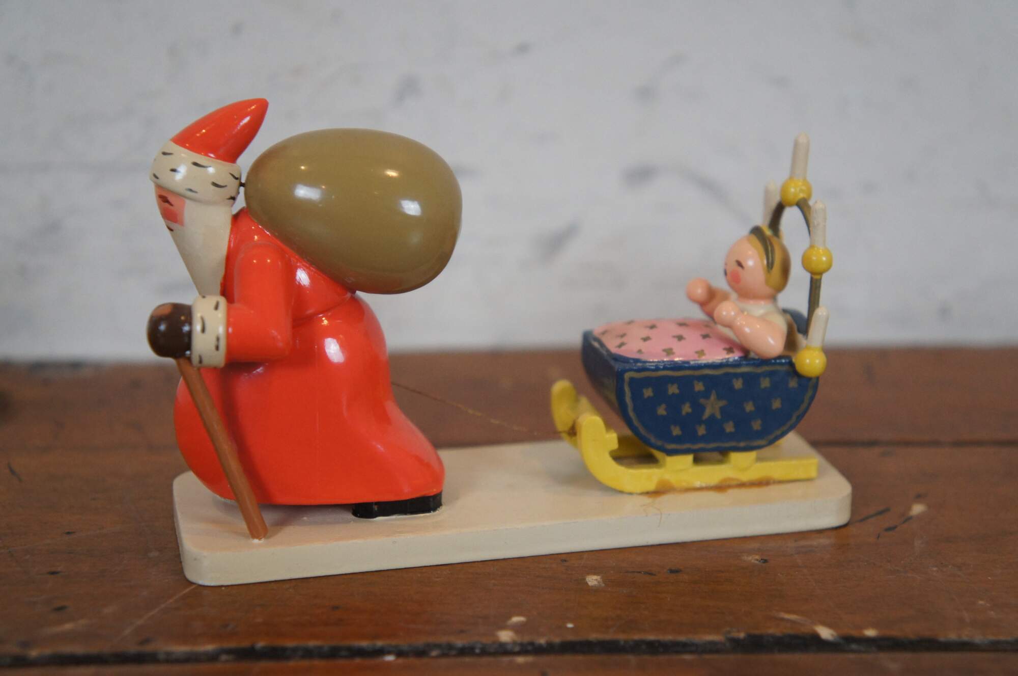 Set of 5 hand crafted wooden Christmas figurines by Wendt and Kuhn under the Expertic label. Set includes: Santa Claus with a child in a candelit sled, Marguerite angel with wagon of gifts, Marguerite angel with sled and tree, Marguerite angel with tree and basket of apples, and one additional Erzgebirge angel in green with cymbals and yellow wings. Made in East Germany.