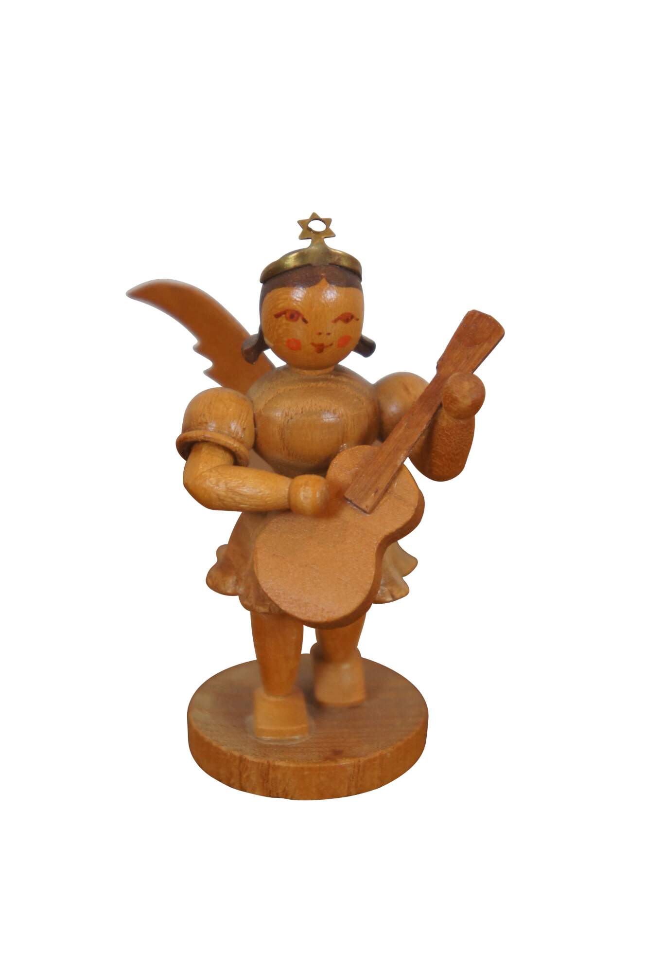 Set of 3 circa mid 20th century miniature wooden angel figurines. Hand crafted from unfinished wood with painted faces and hair, topped with brass star crowns, these angels are part of a larger orchestra, playing harp, guitar, and violin. Likely made in Erzgebirge, Germany.