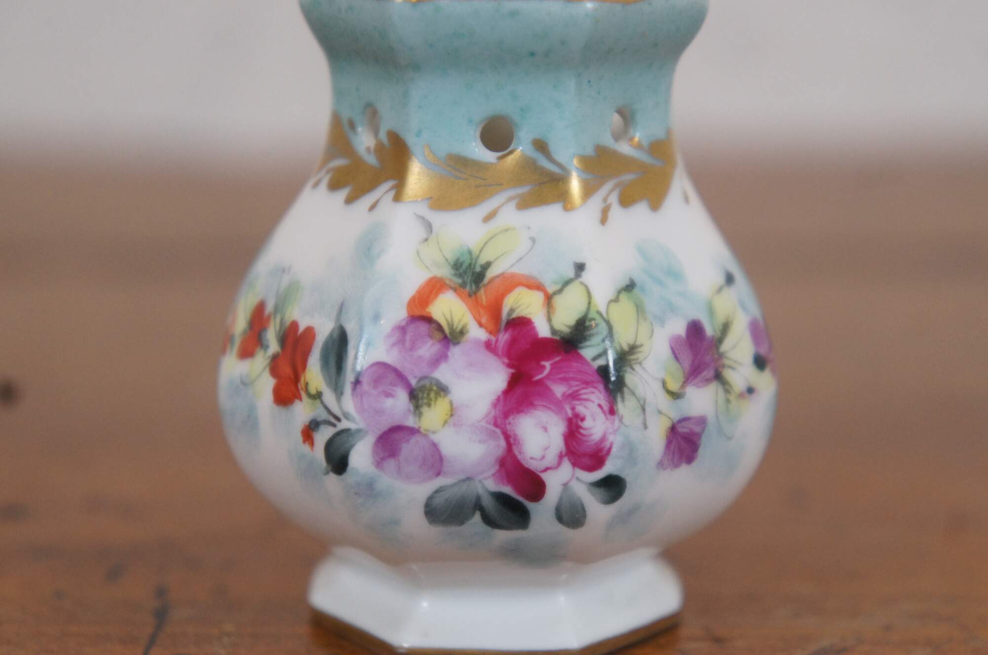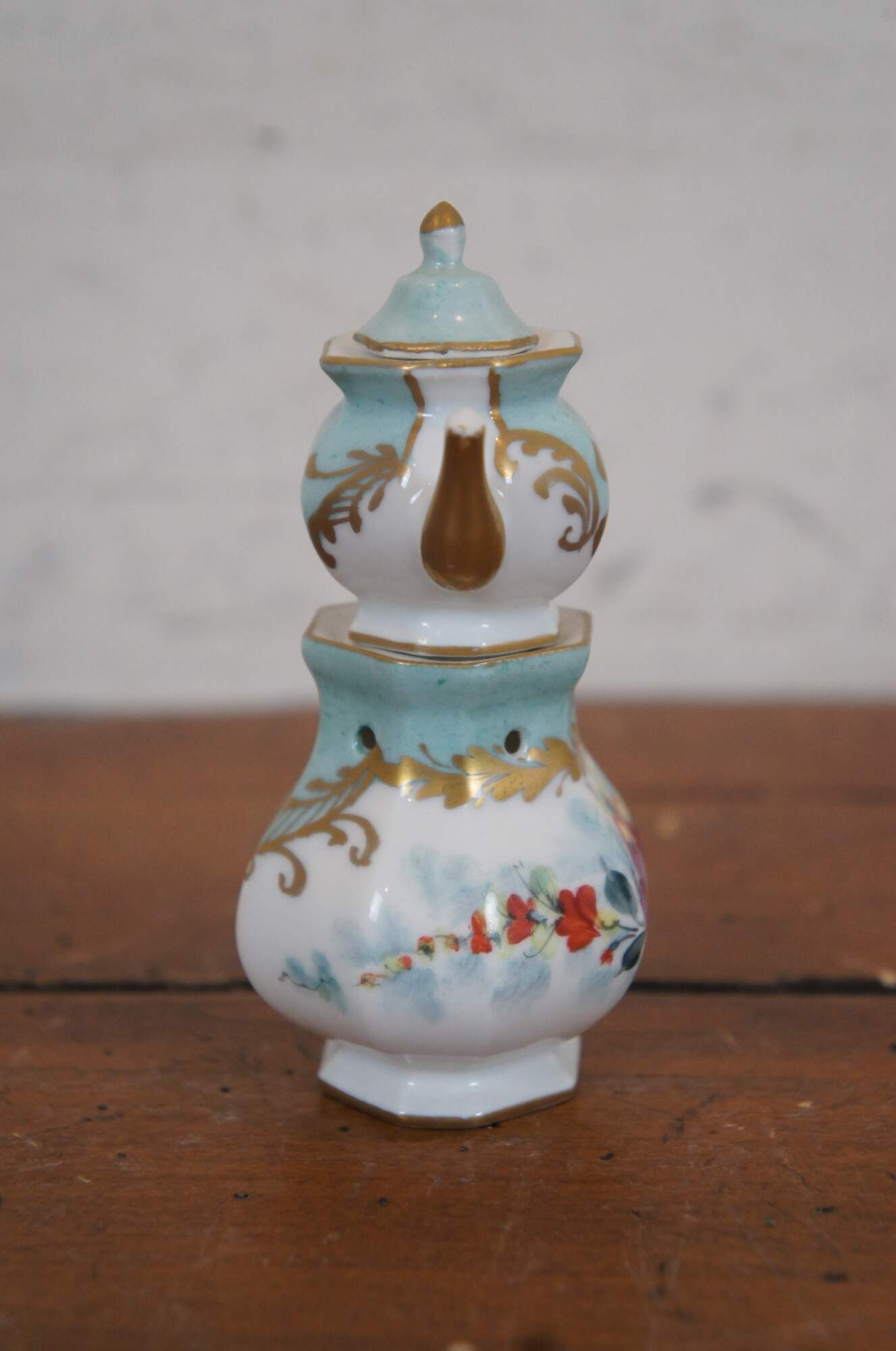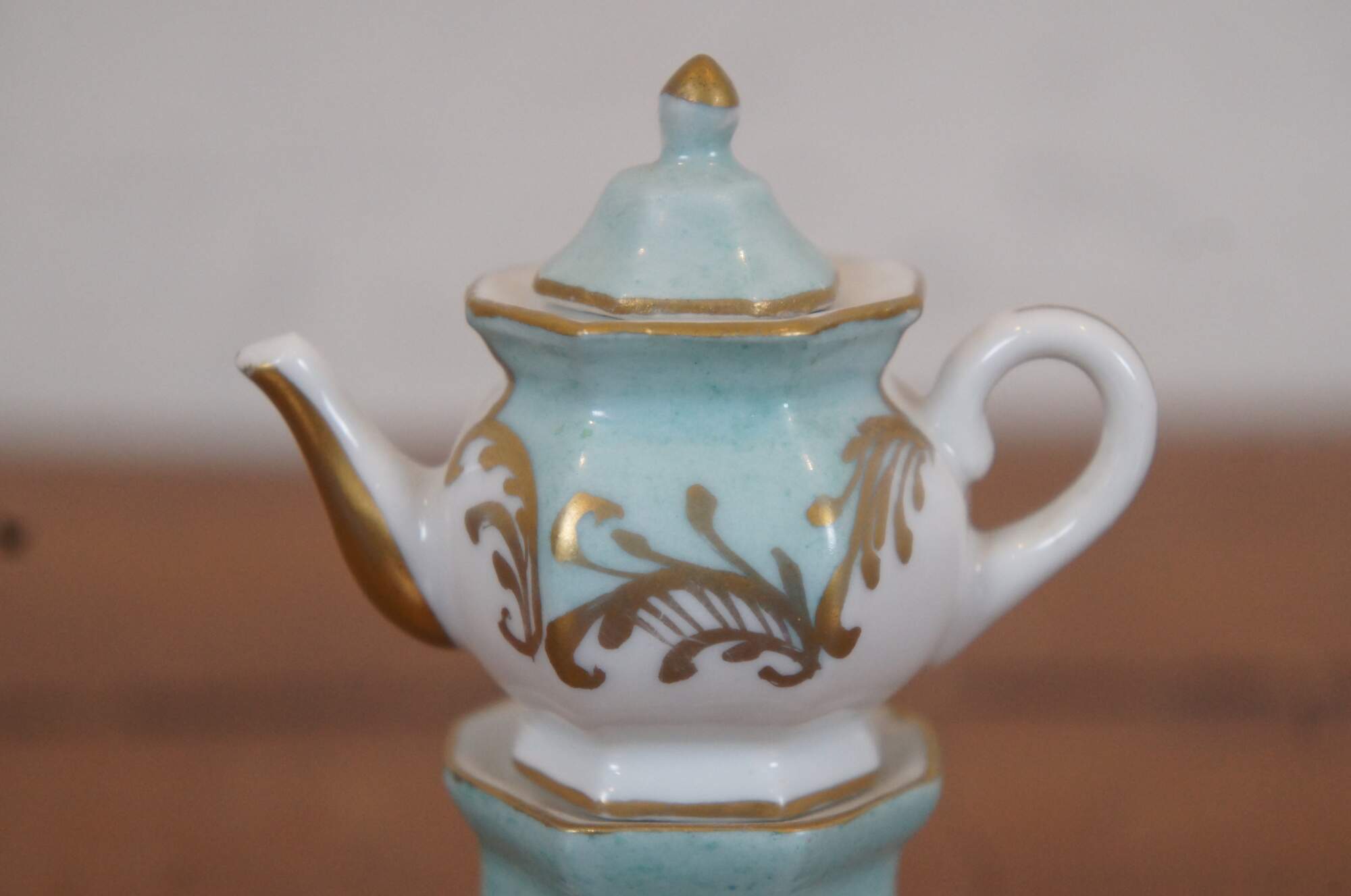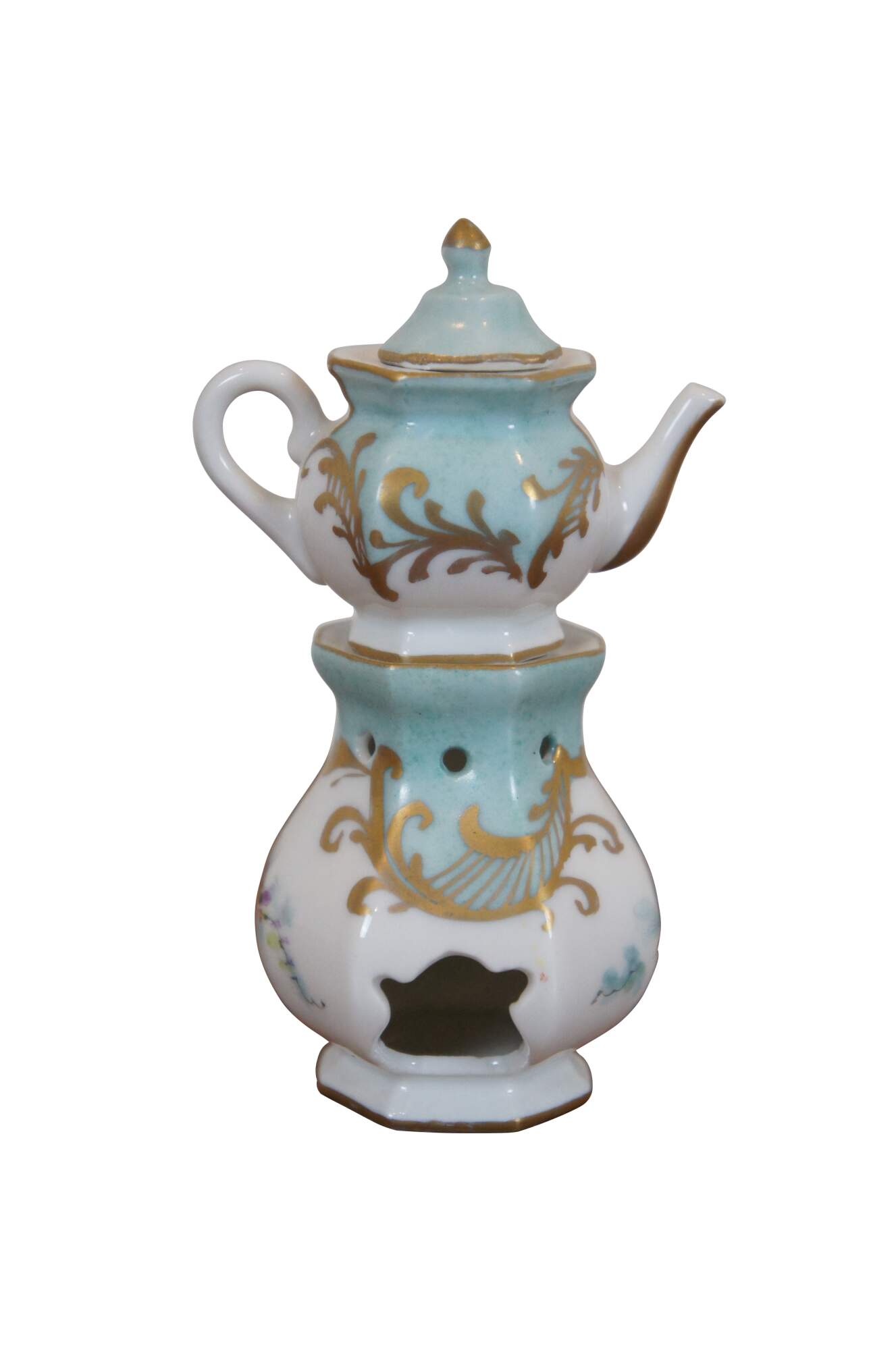 Circa 19th century miniature three piece porcelain Veilleuse Tisaniere / tea warmer / teapot, made by Coalport. White and turquoise with hand painted flowers and gilded accents.