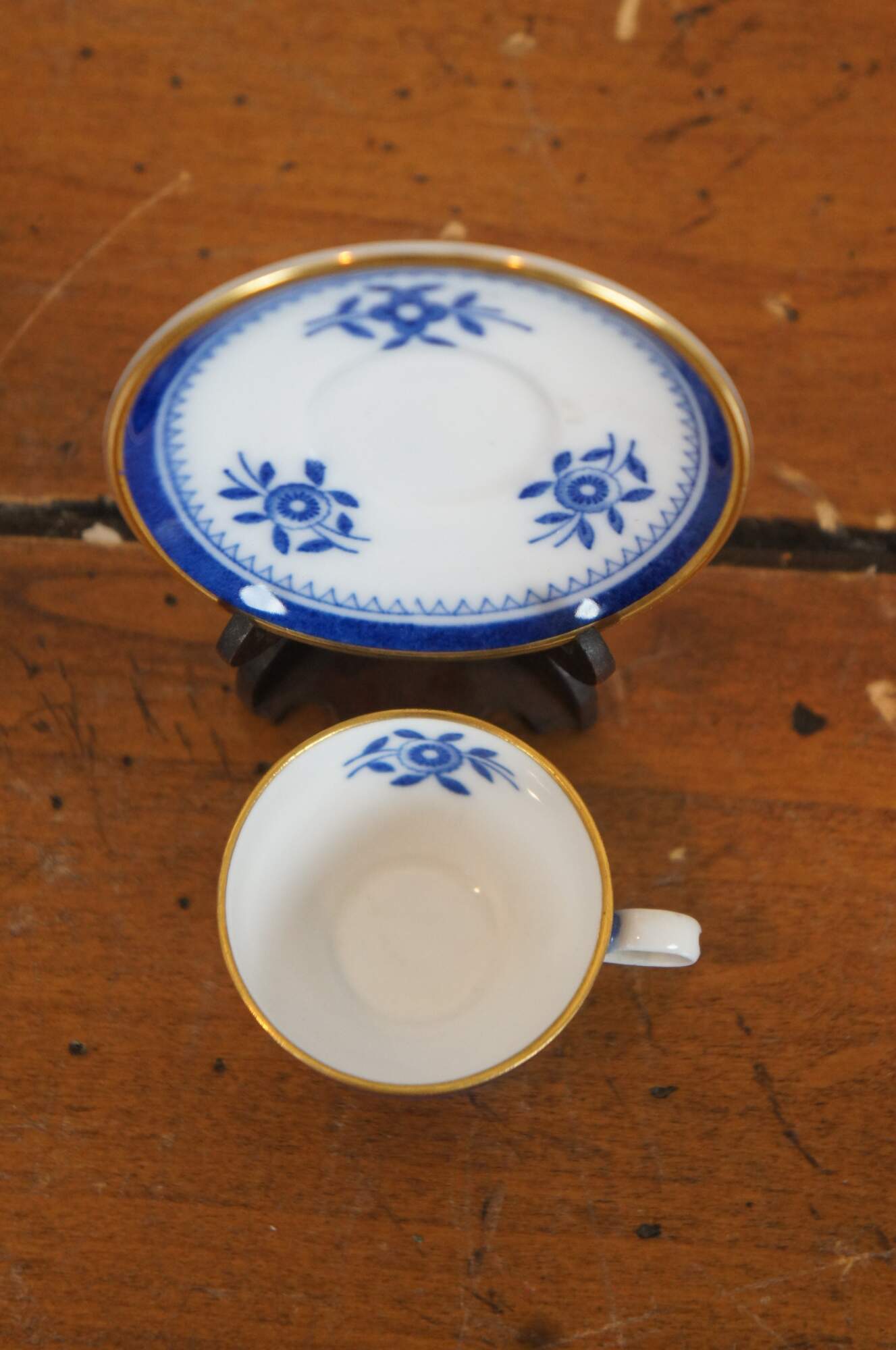 Vintage Copeland's Spode miniature teacup and saucer, marked 13 and Y6135, possibly a variation of the Gloucester pattern. Features a simple design of folk art style flowers and sawtooth blue border, with gilded accents. Includes wooden display stand.