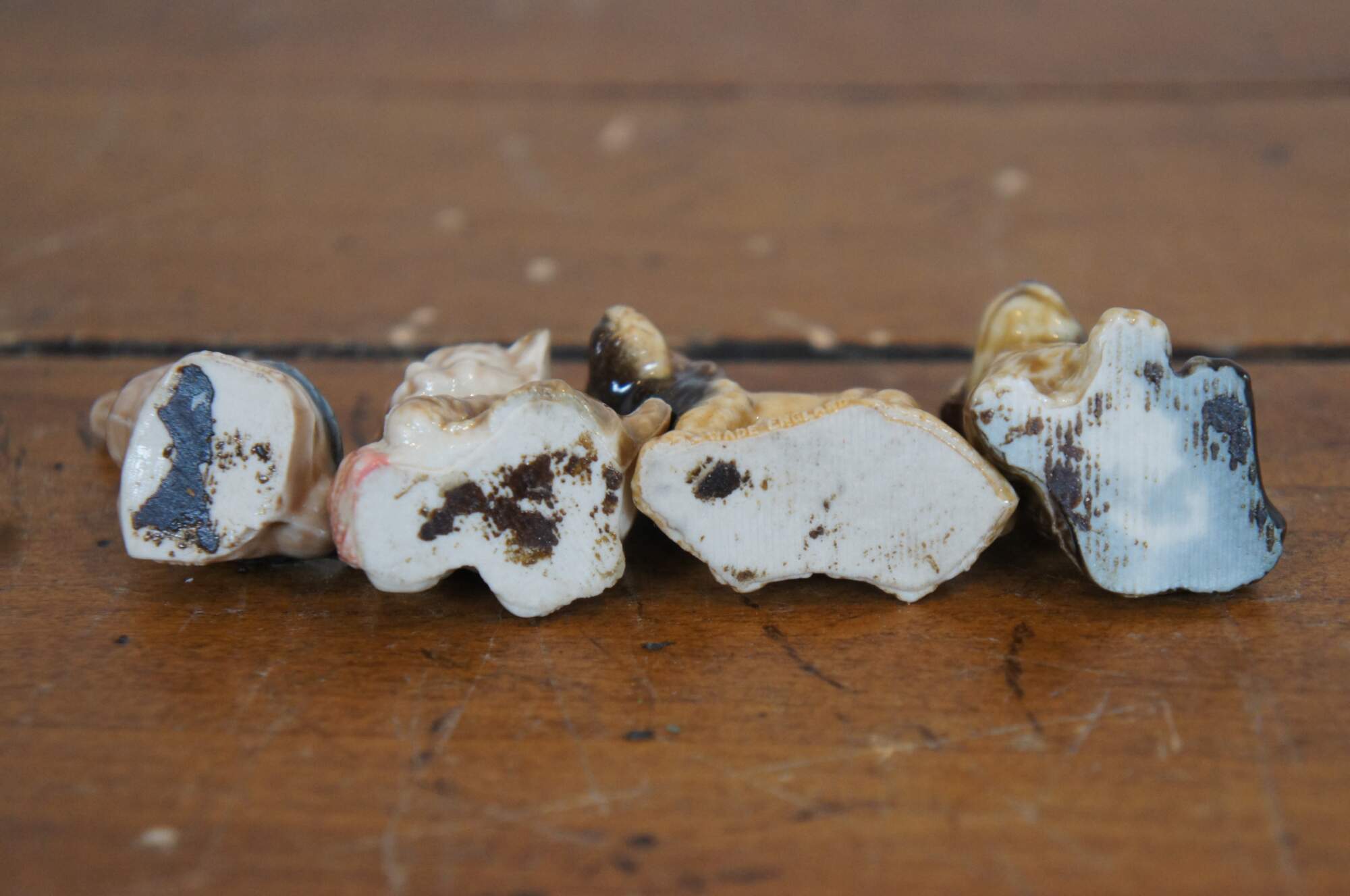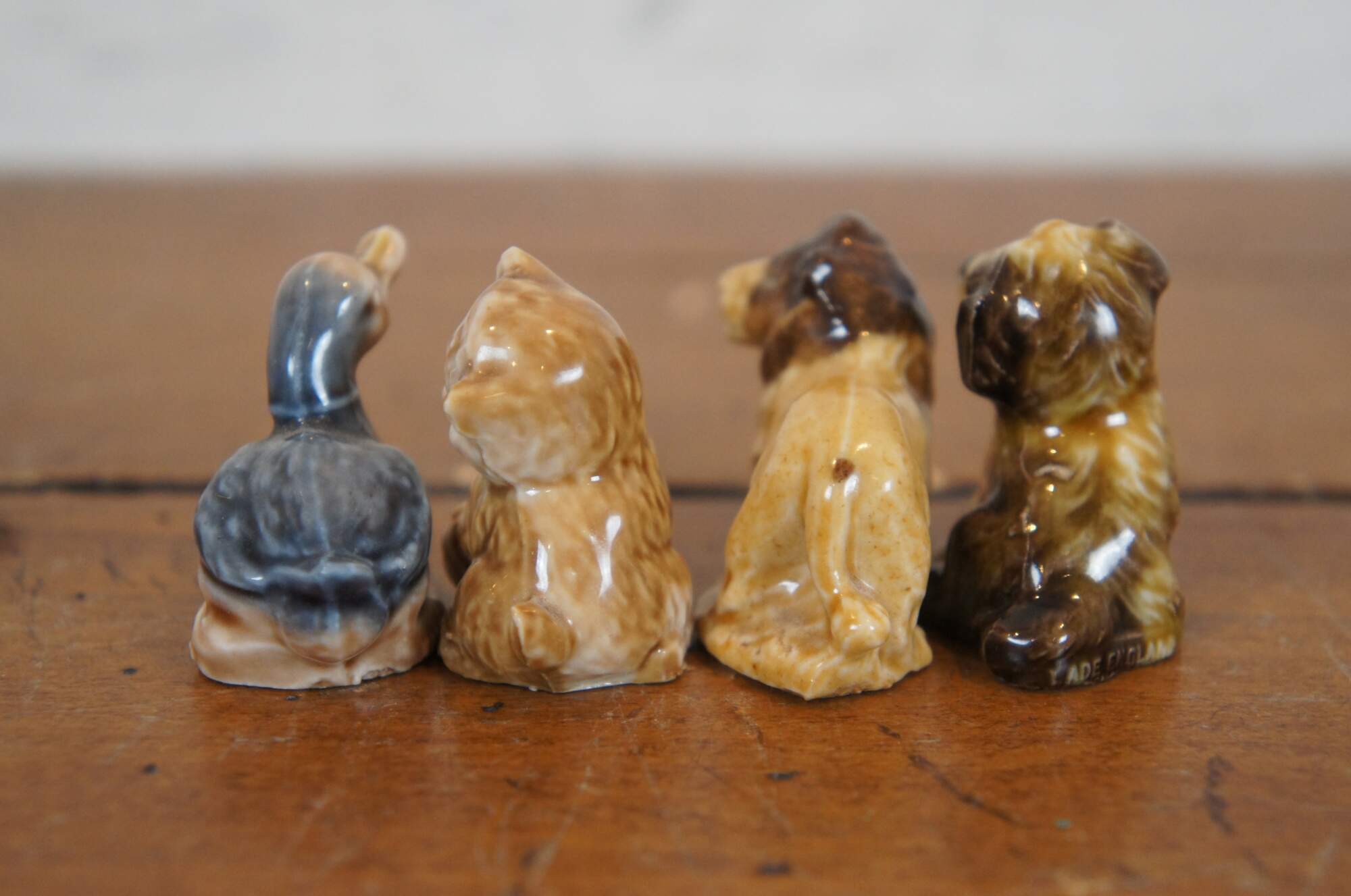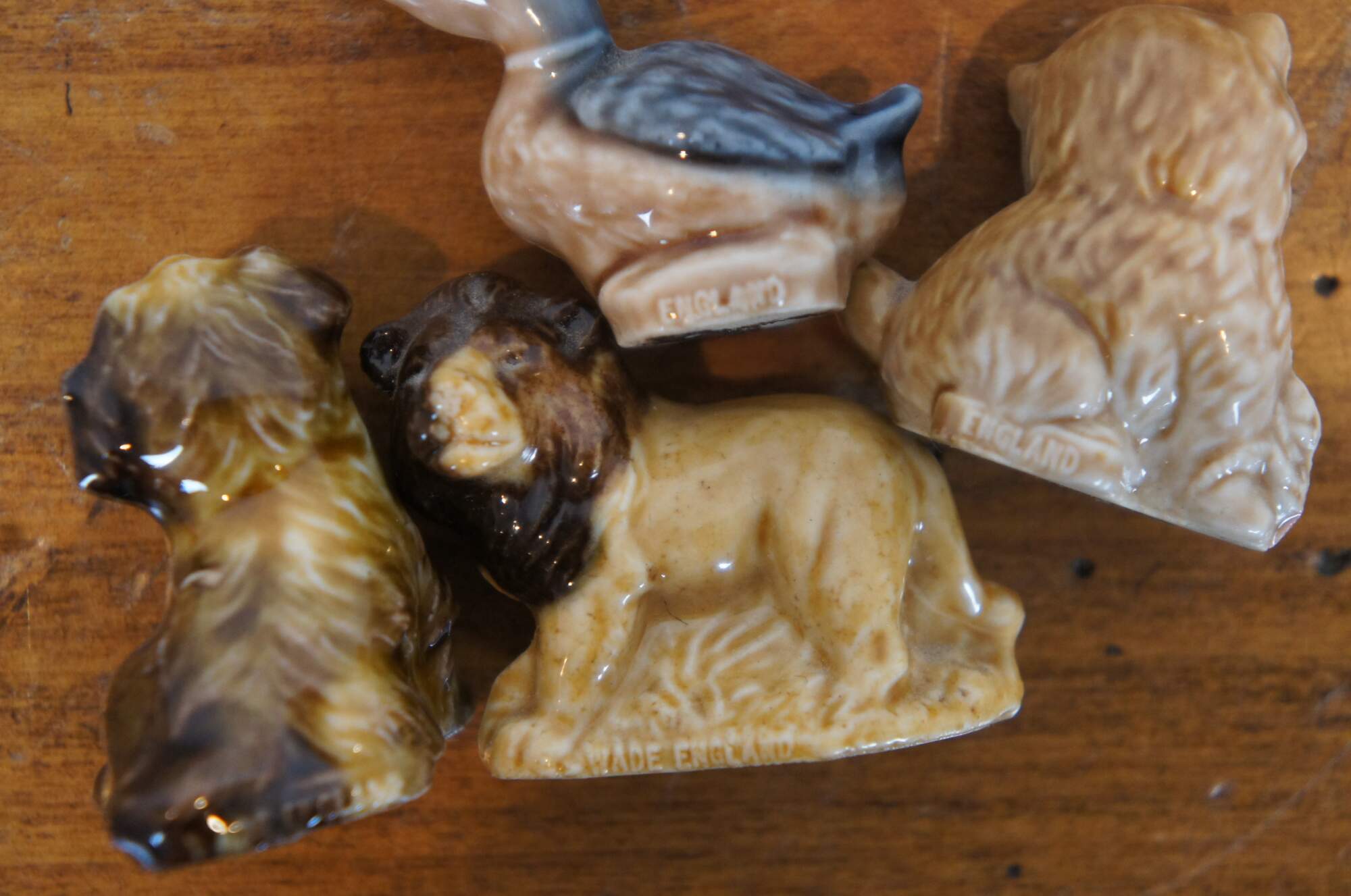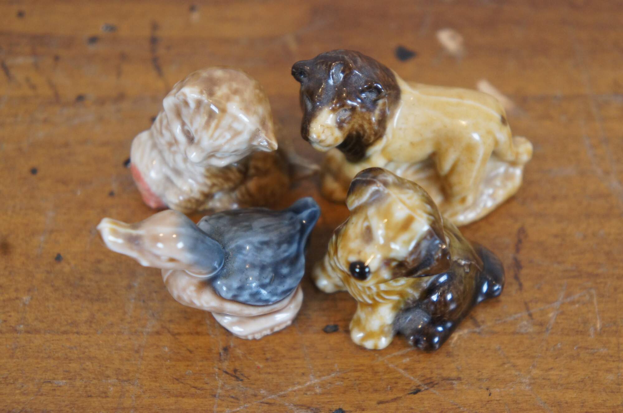 Lot of 4 vintage Wade Whimsies porcelain animal figurines including: a duck, kitten with ball of yarn, lion, and puppy.