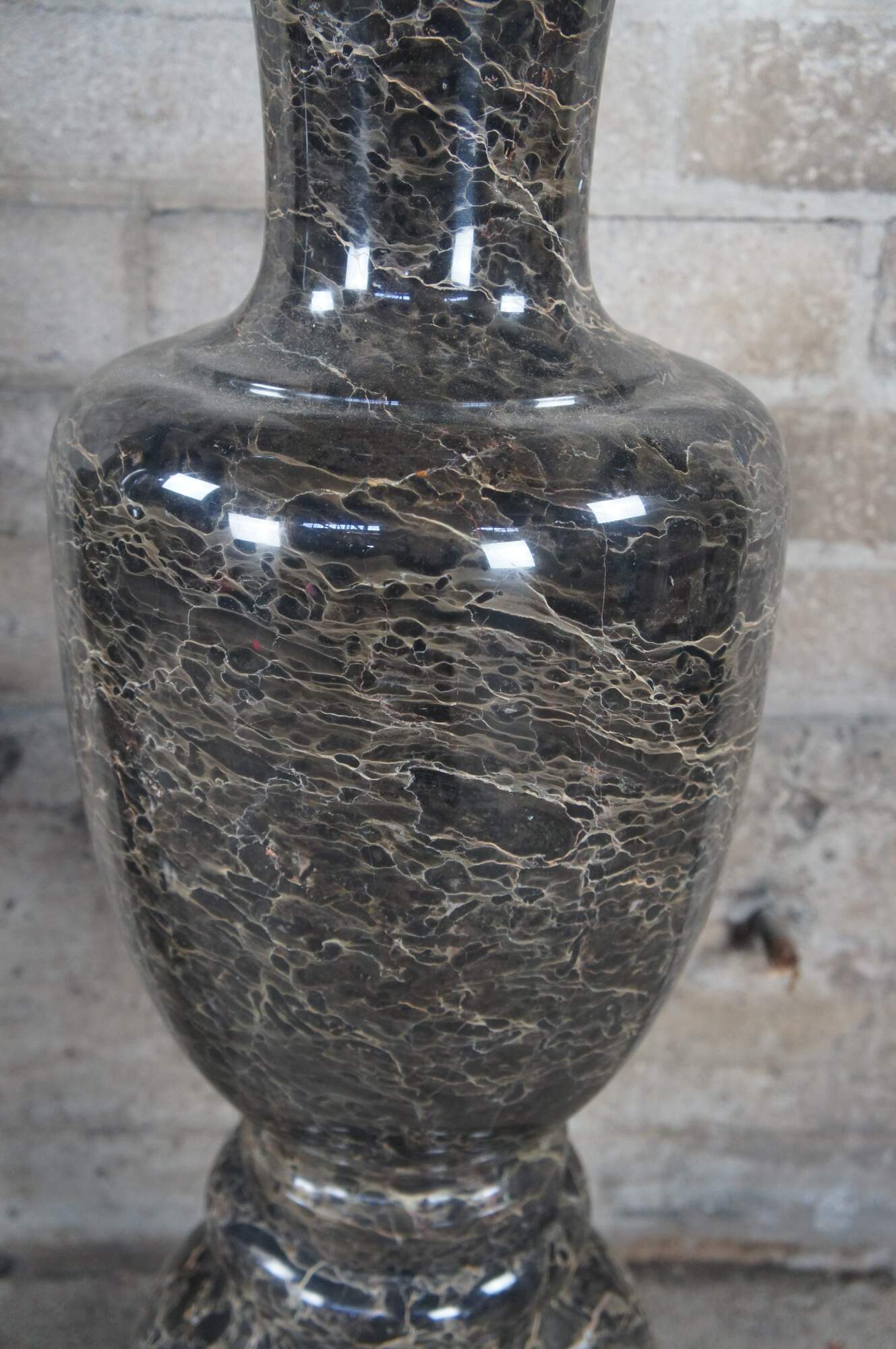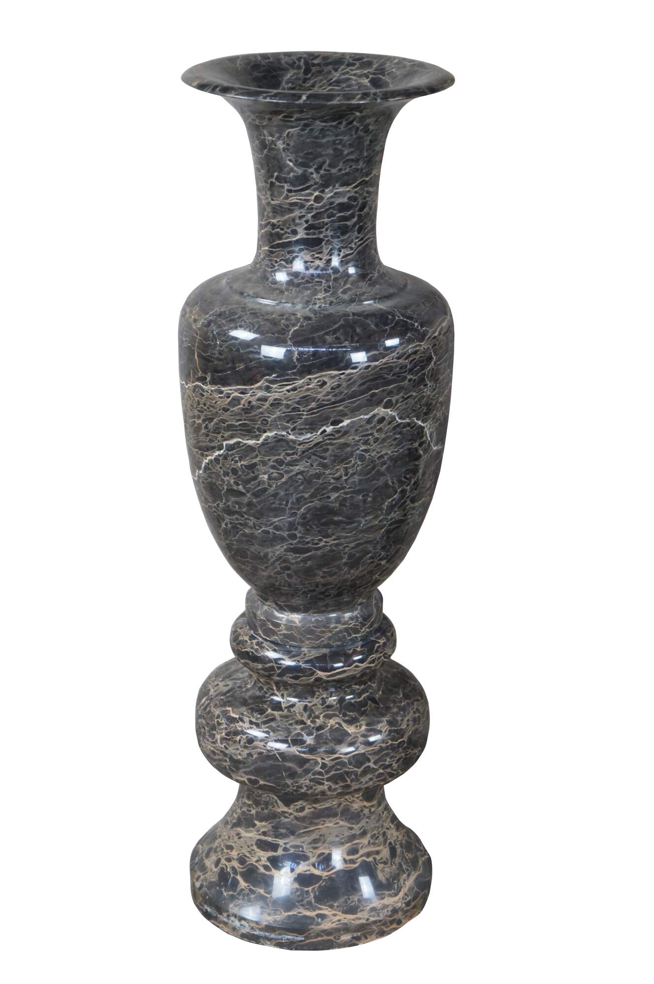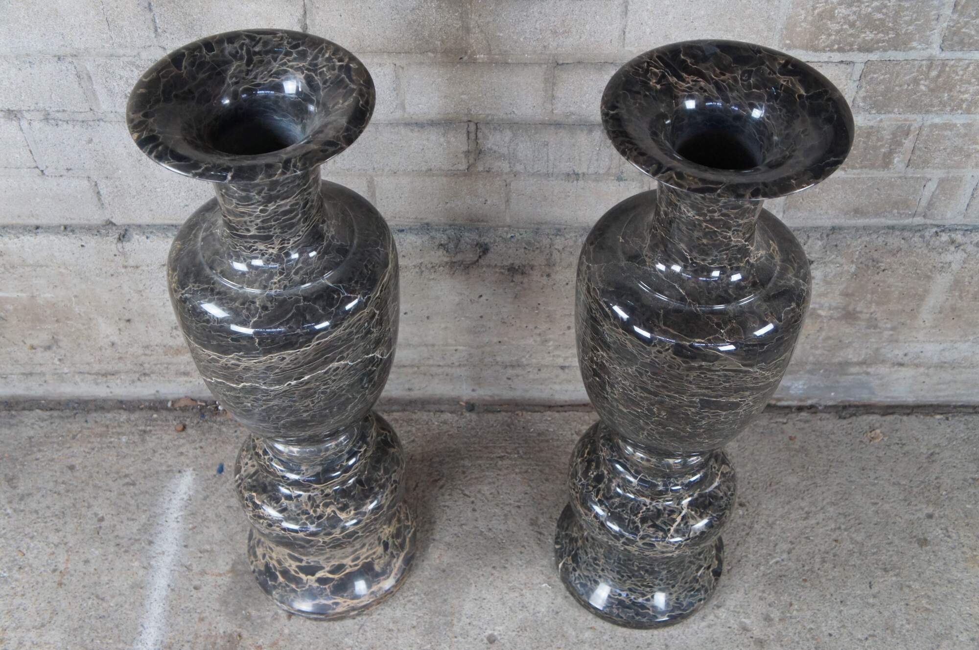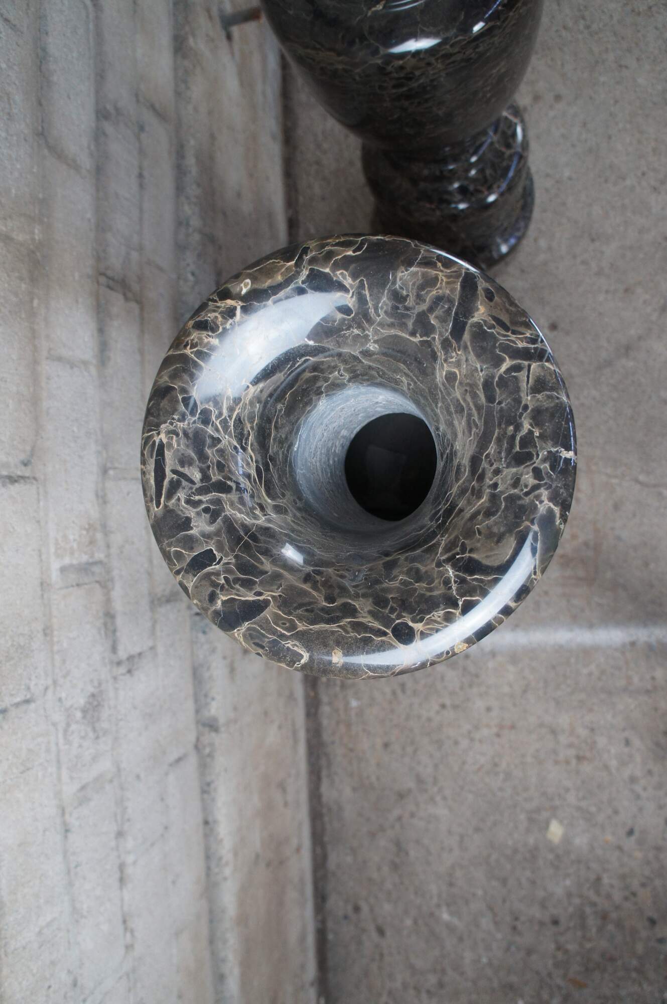 An impressive pair of Italian marble floor vases from the second half of the 20th century. Black with gray and beige veines. Features a traditional form with flared mouth on a bulbous stand. Great for use in an entry, living space or flanking a fireplace. The sleek designs blends well in any contemporary, post modern, or traditional setting.