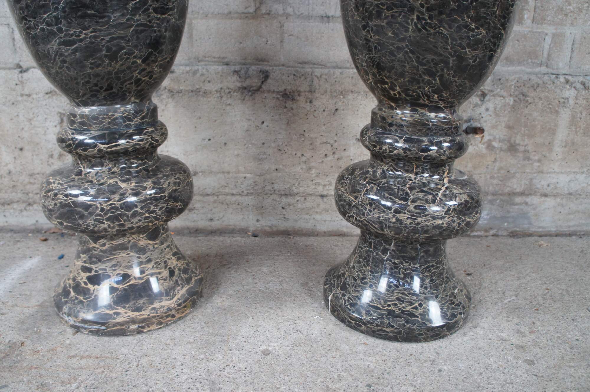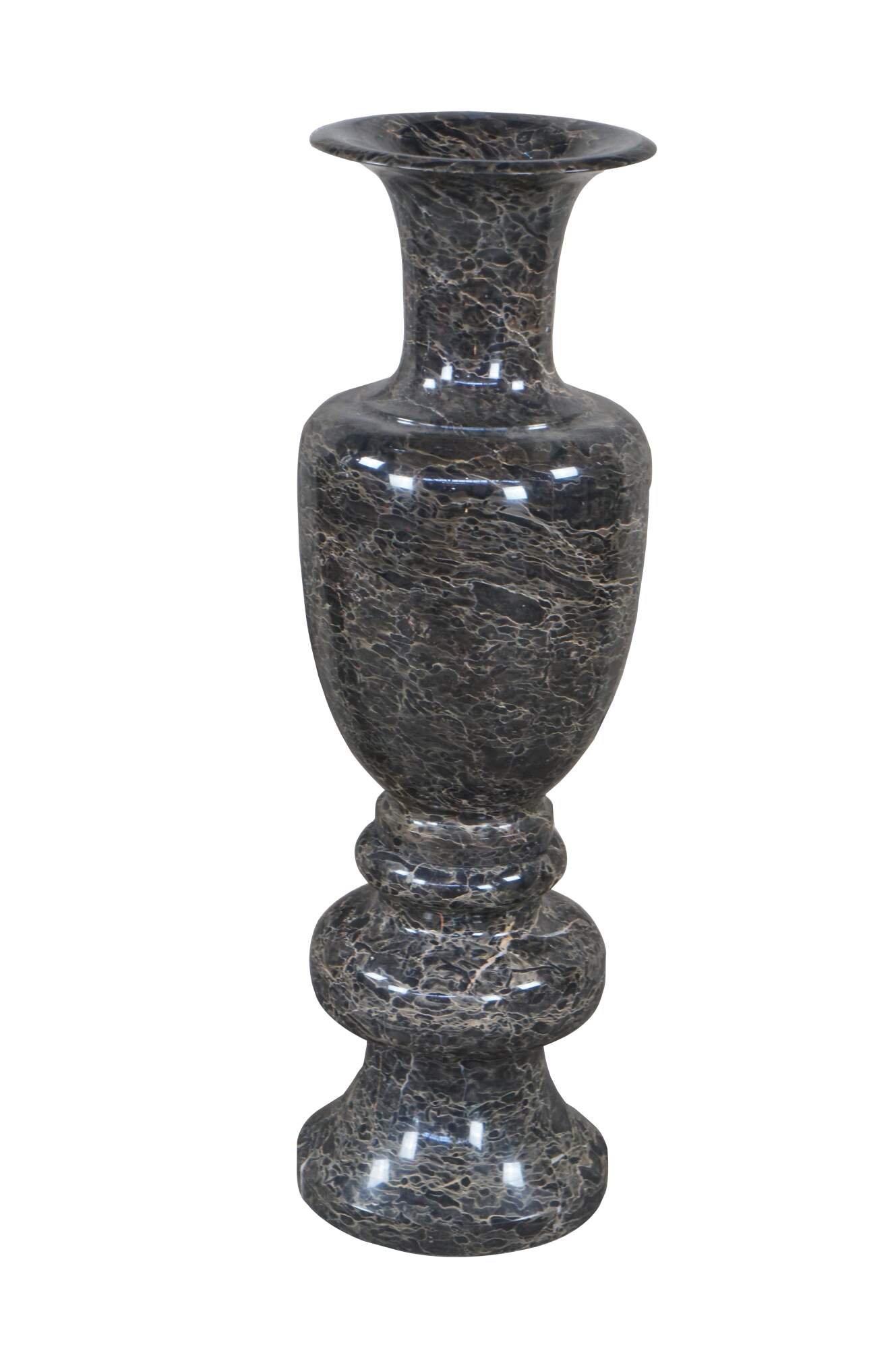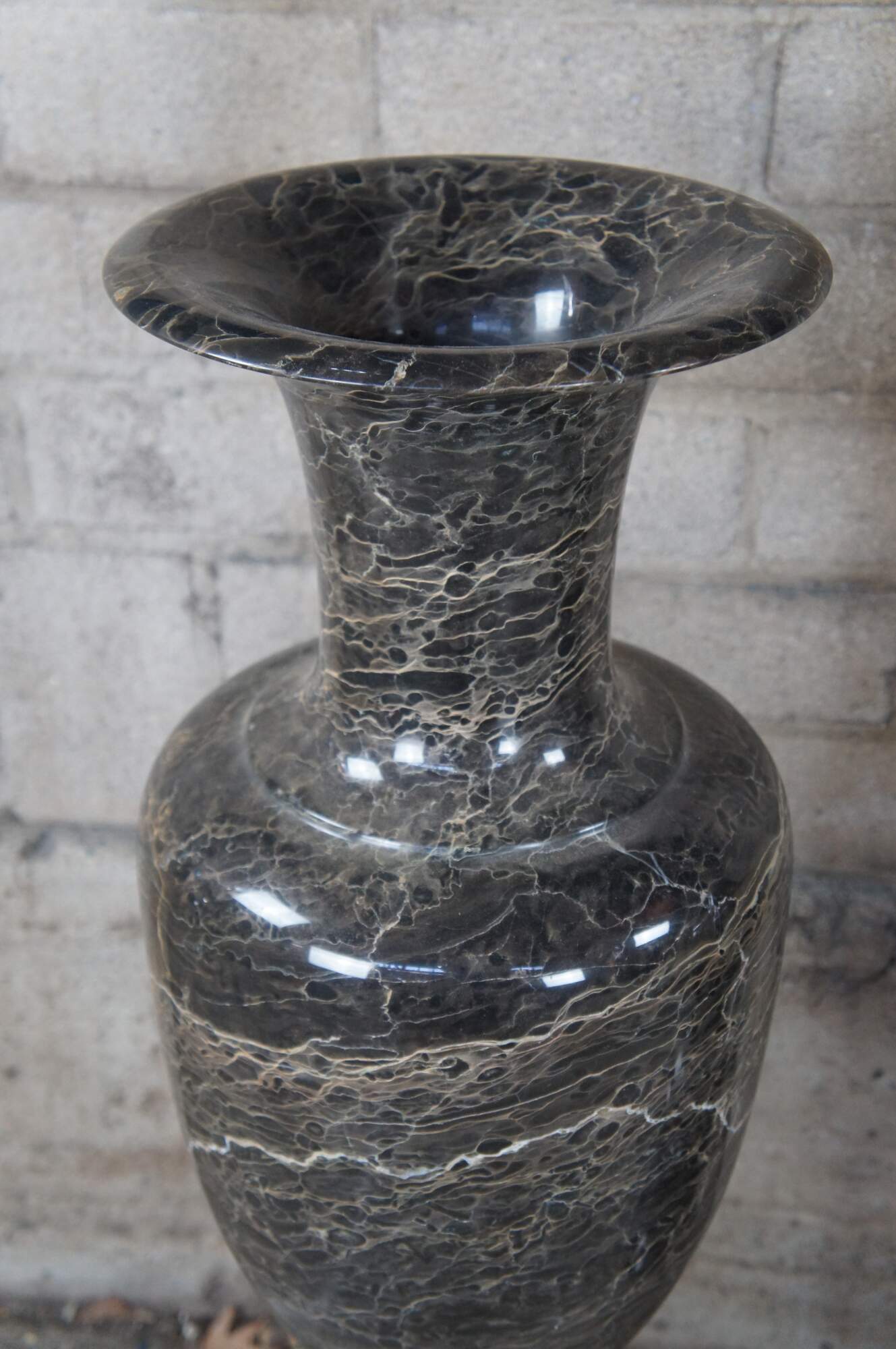An impressive pair of Italian marble floor vases from the second half of the 20th century. Black with gray and beige veines. Features a traditional form with flared mouth on a bulbous stand. Great for use in an entry, living space or flanking a fireplace. The sleek designs blends well in any contemporary, post modern, or traditional setting.