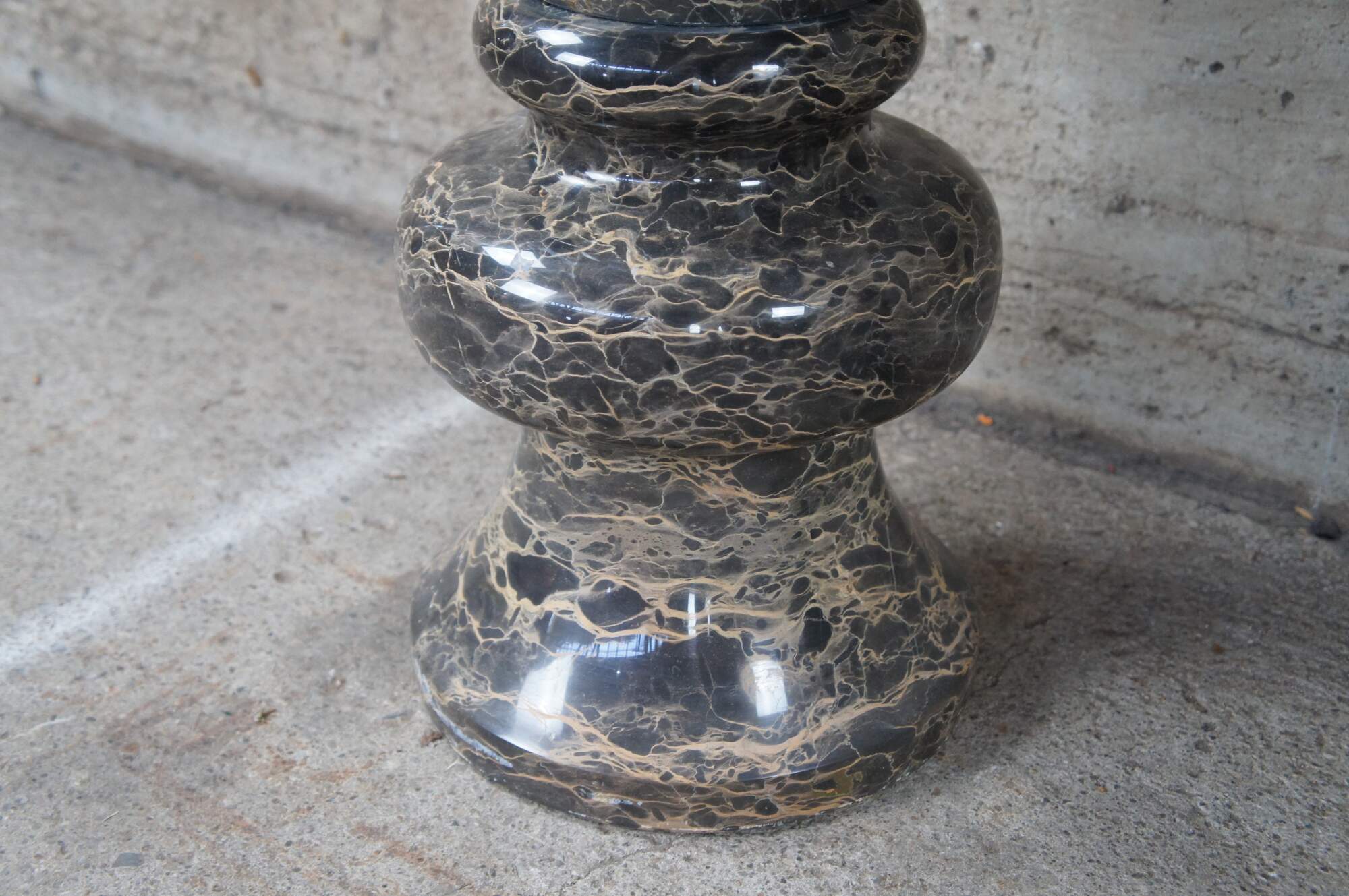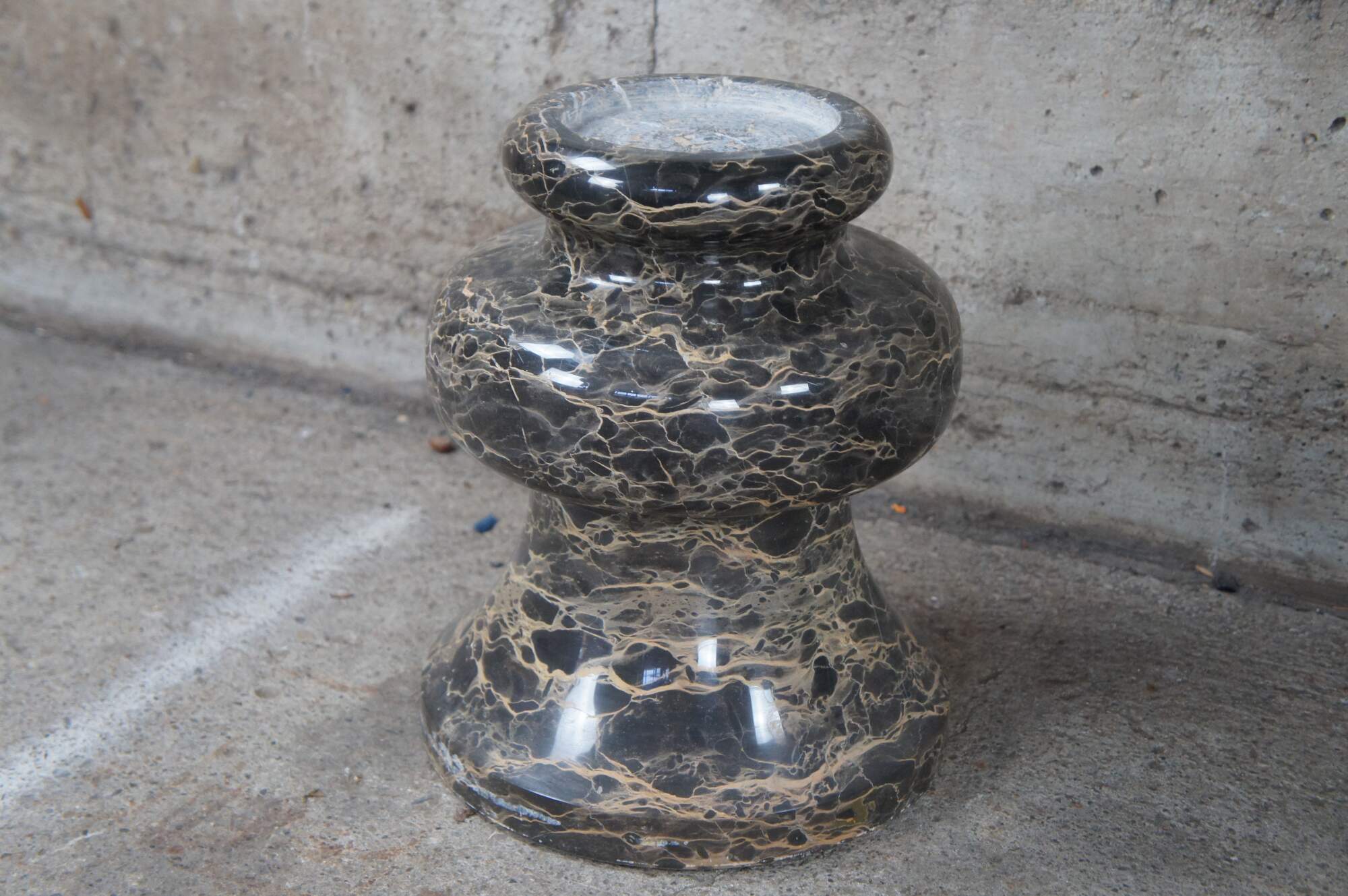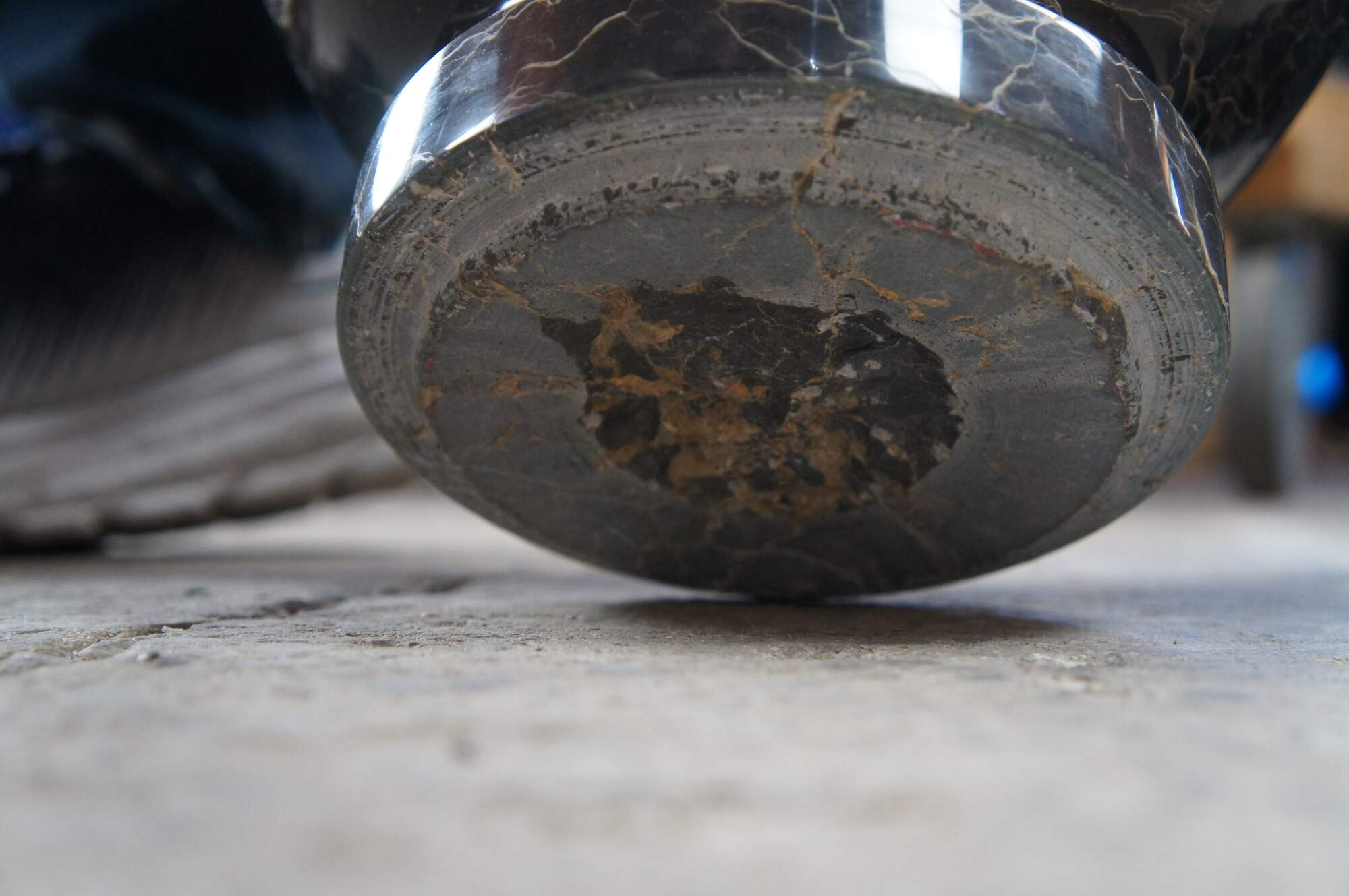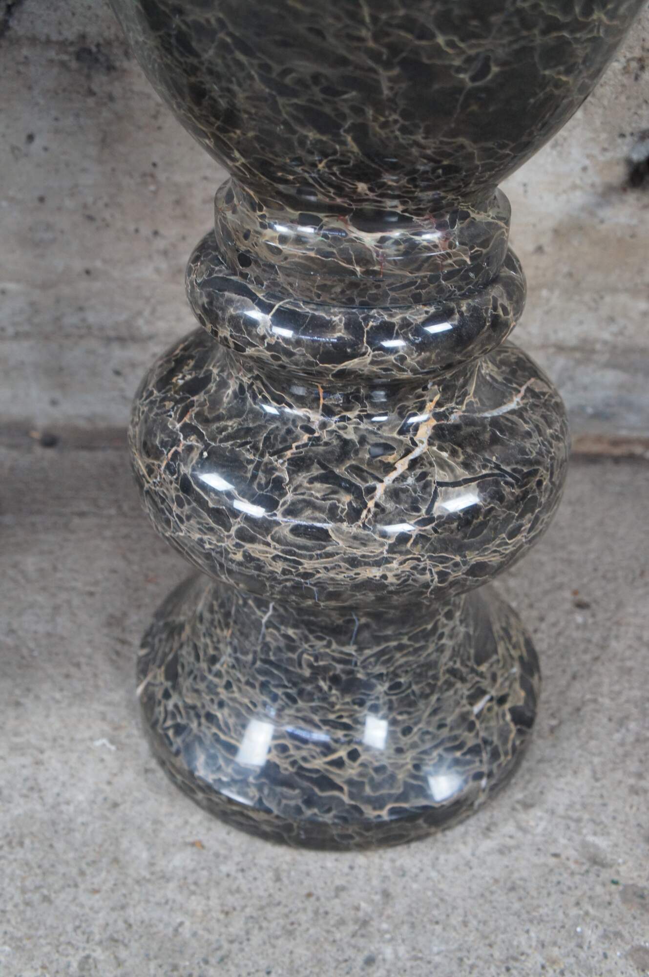 An impressive pair of Italian marble floor vases from the second half of the 20th century. Black with gray and beige veines. Features a traditional form with flared mouth on a bulbous stand. Great for use in an entry, living space or flanking a fireplace. The sleek designs blends well in any contemporary, post modern, or traditional setting.
