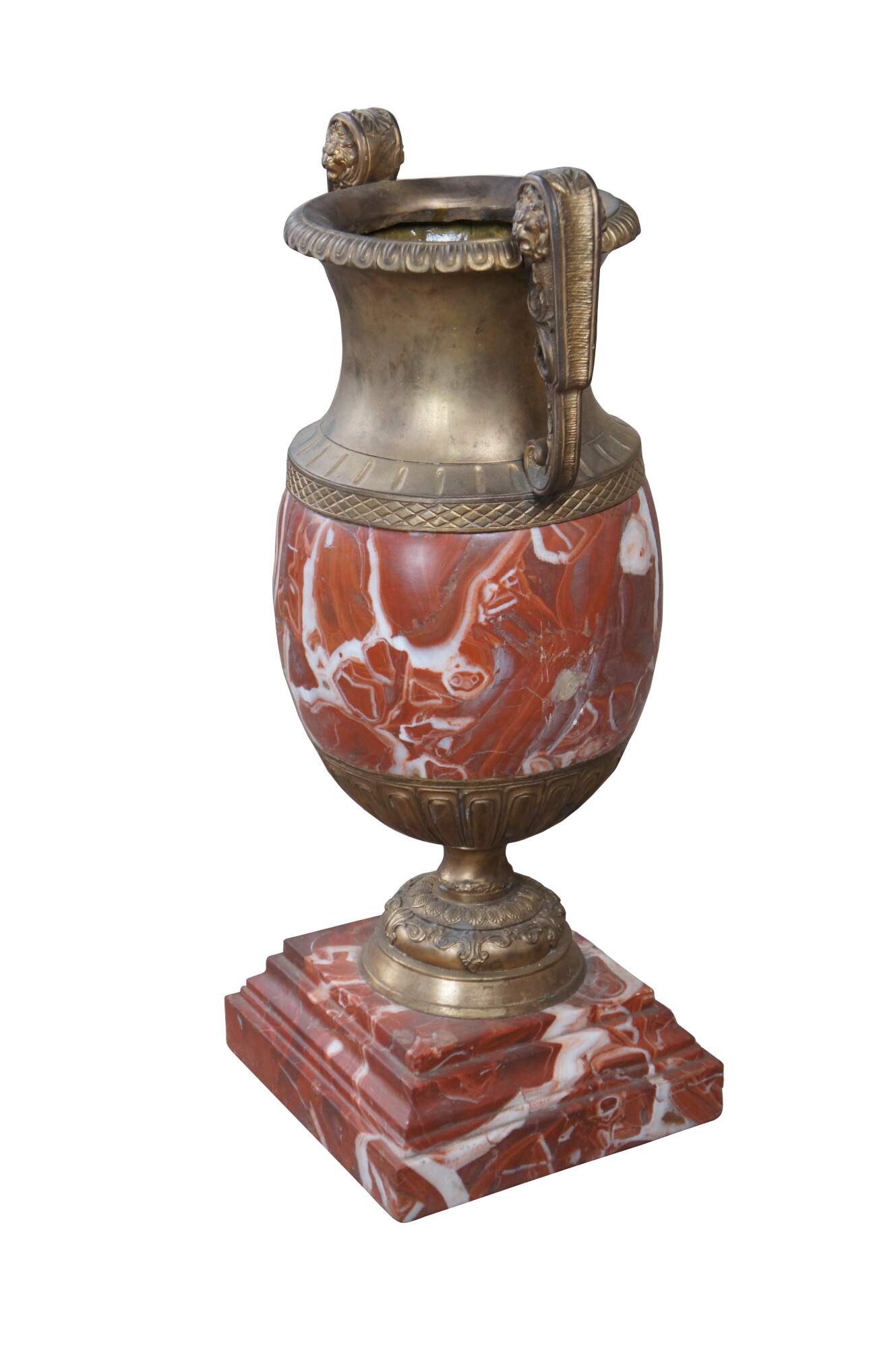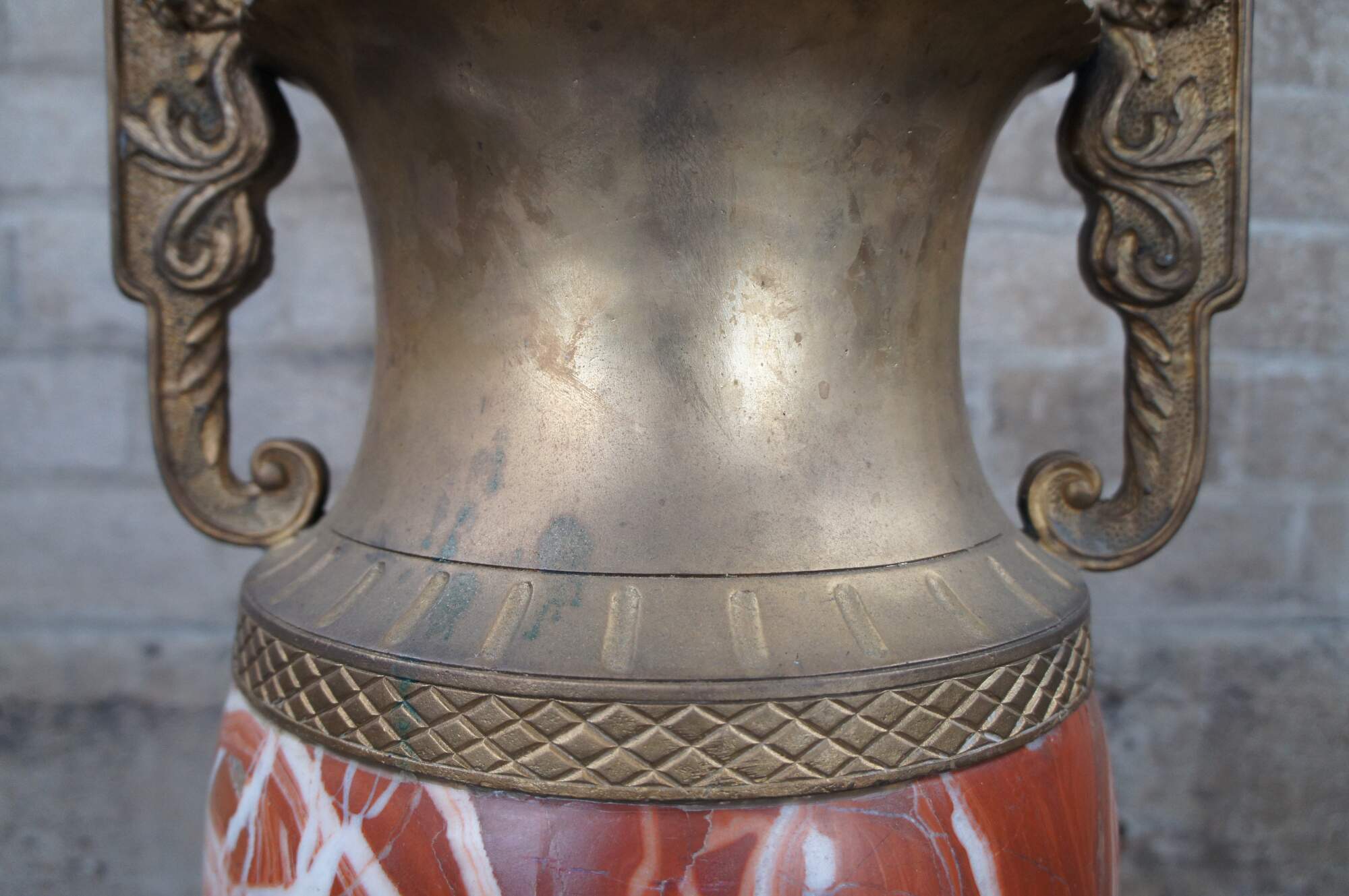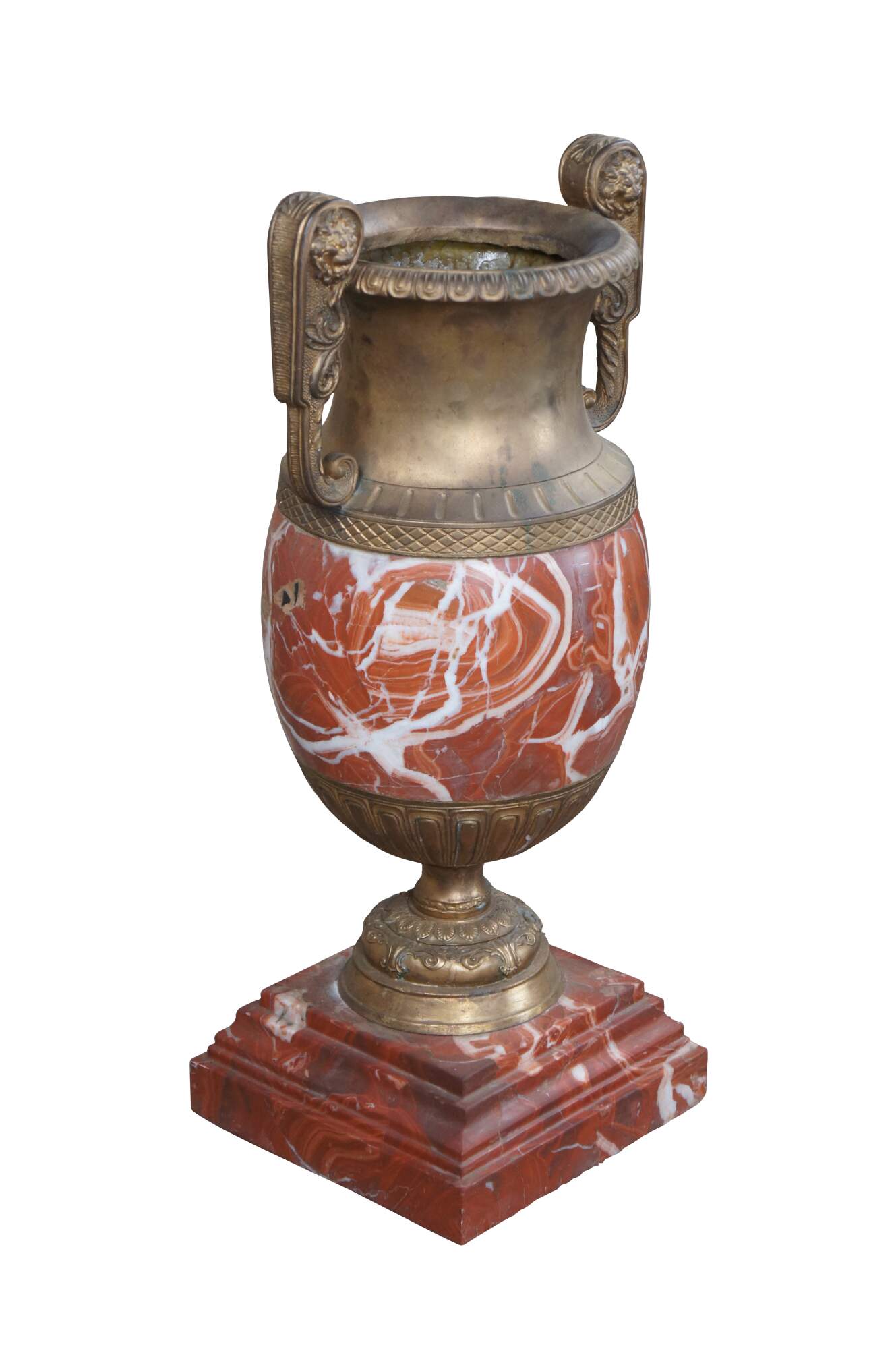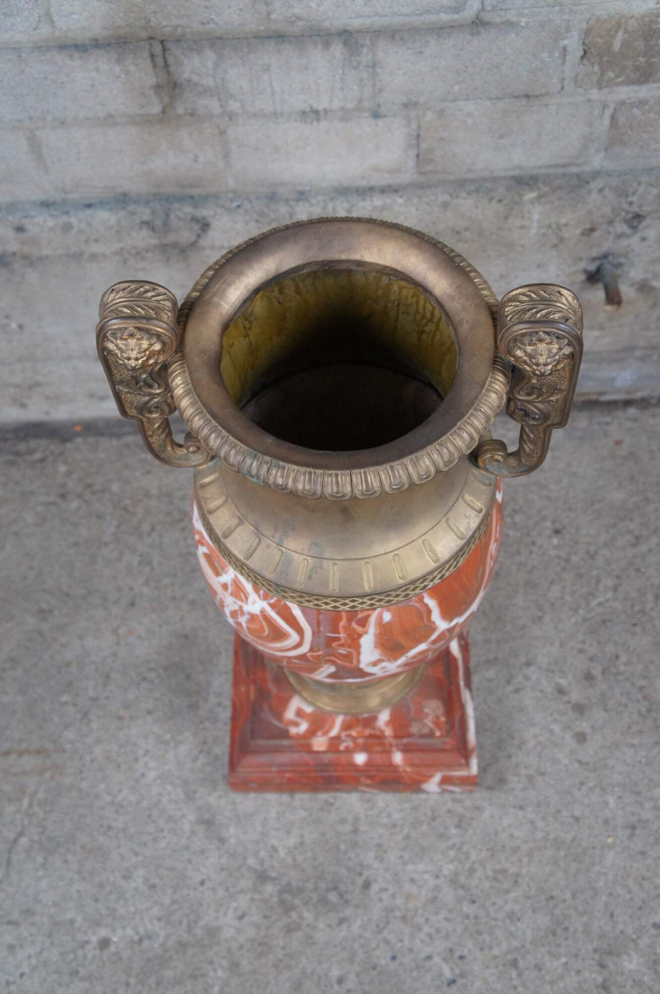 An eye catching late 19th century antique French rouge marble floor or mantel vase. Features a traditional urn shape with bronze mouth accented by ornate lion head mounted handles. Lower side of vase showcases gadrooning over an ornate foliate base. The urn is mounted to a stepped plinth base.