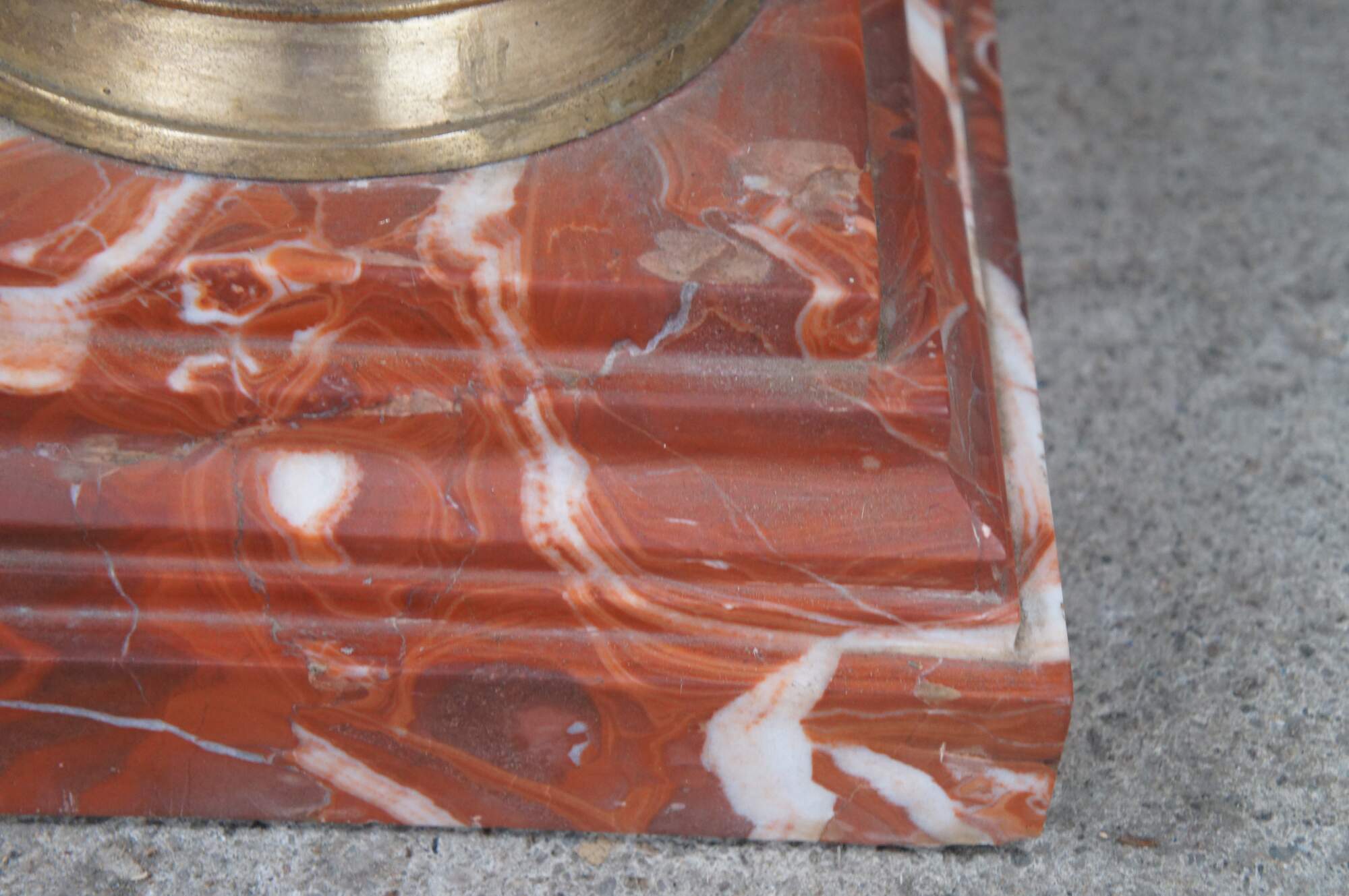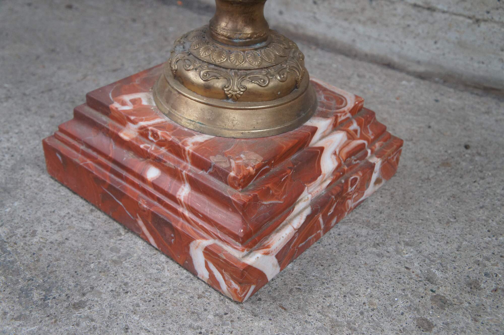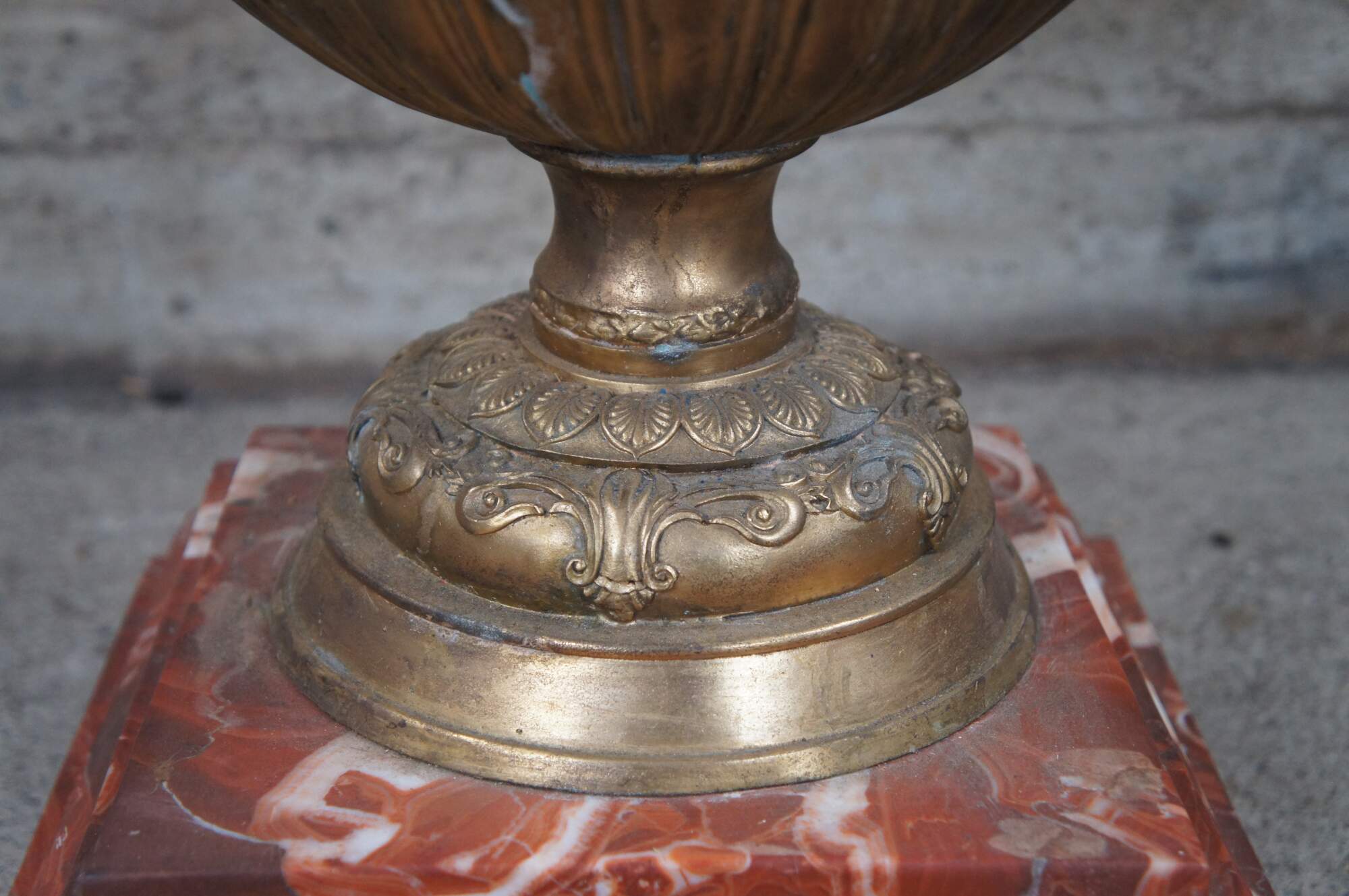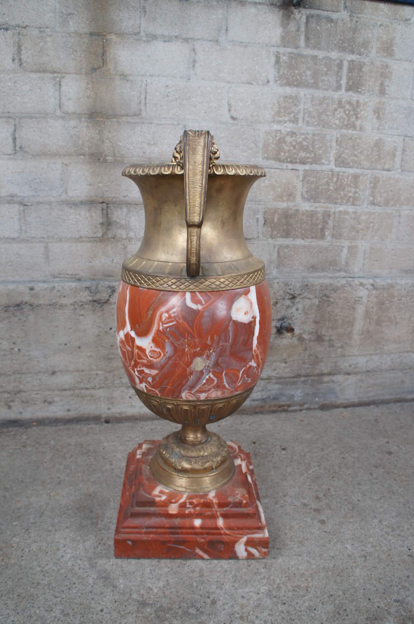 An eye catching late 19th century antique French rouge marble floor or mantel vase. Features a traditional urn shape with bronze mouth accented by ornate lion head mounted handles. Lower side of vase showcases gadrooning over an ornate foliate base. The urn is mounted to a stepped plinth base.