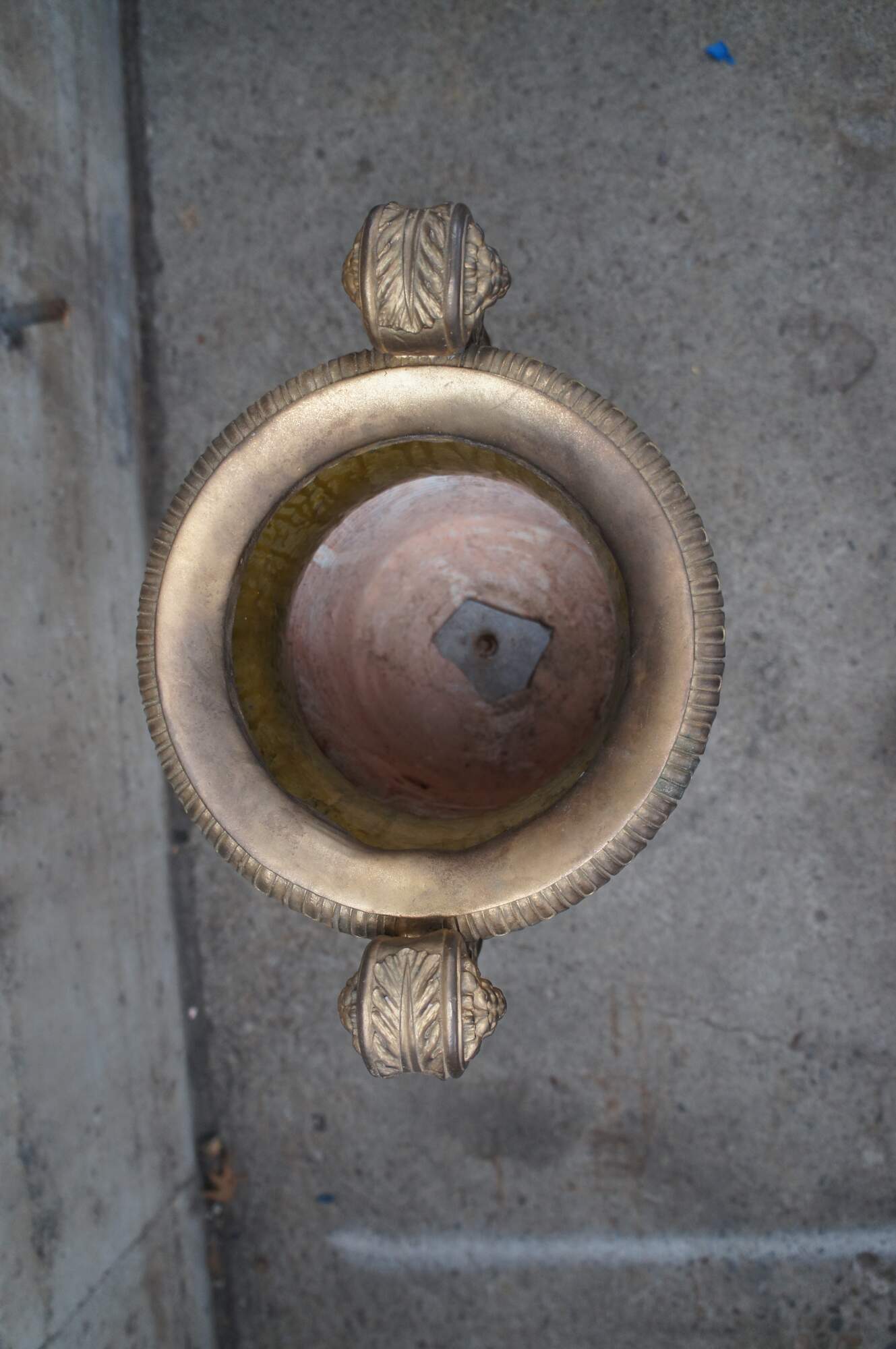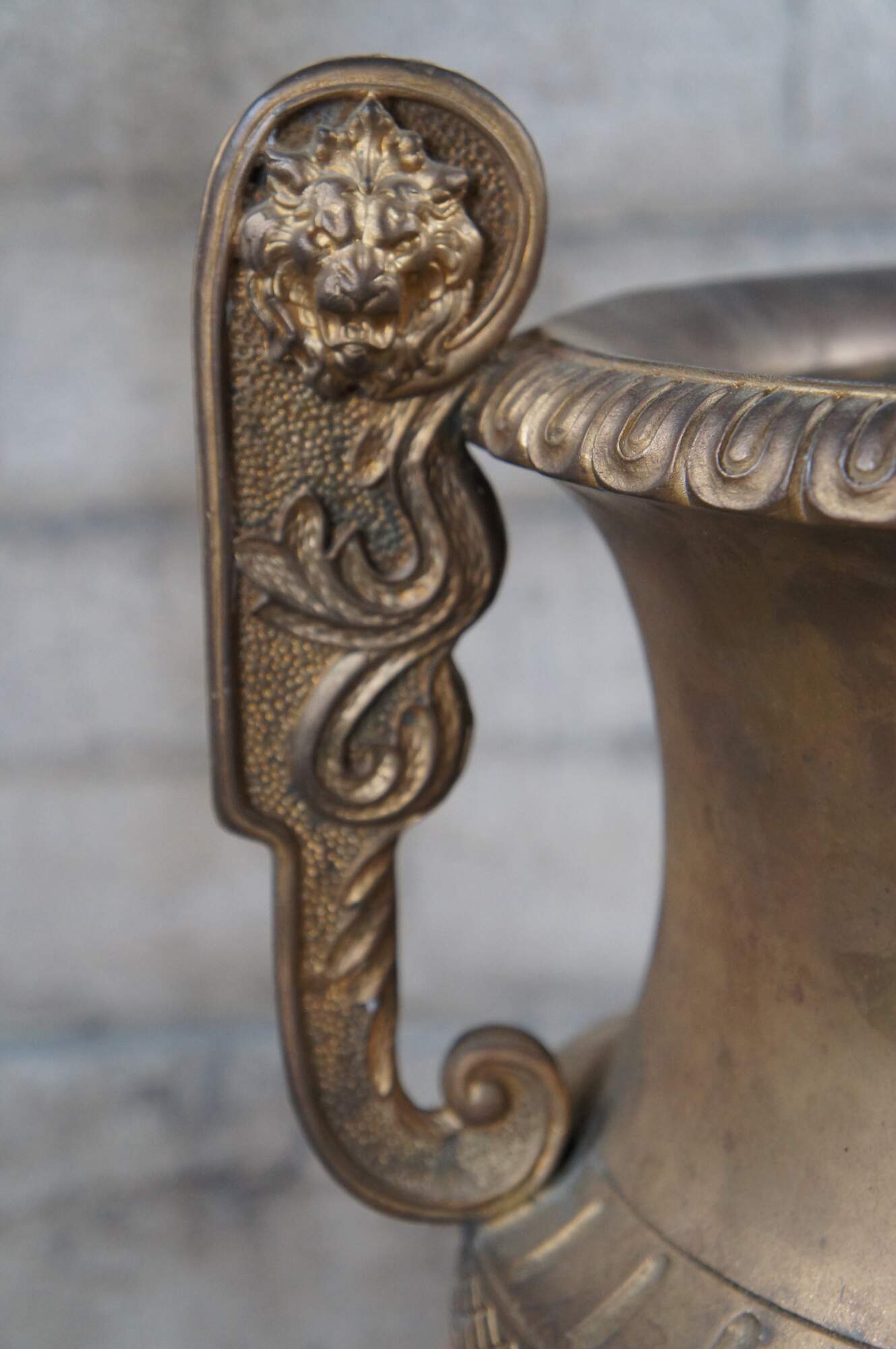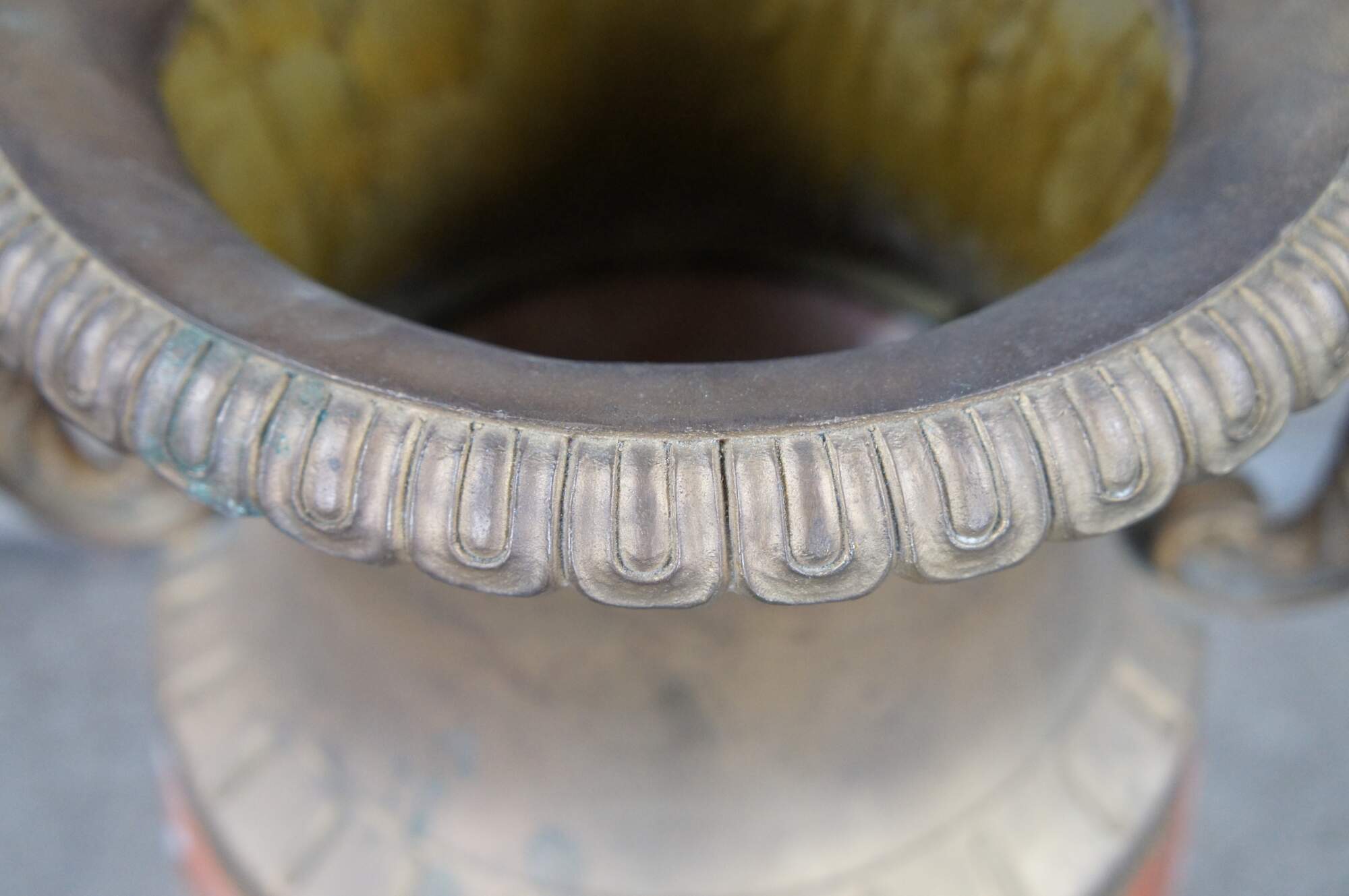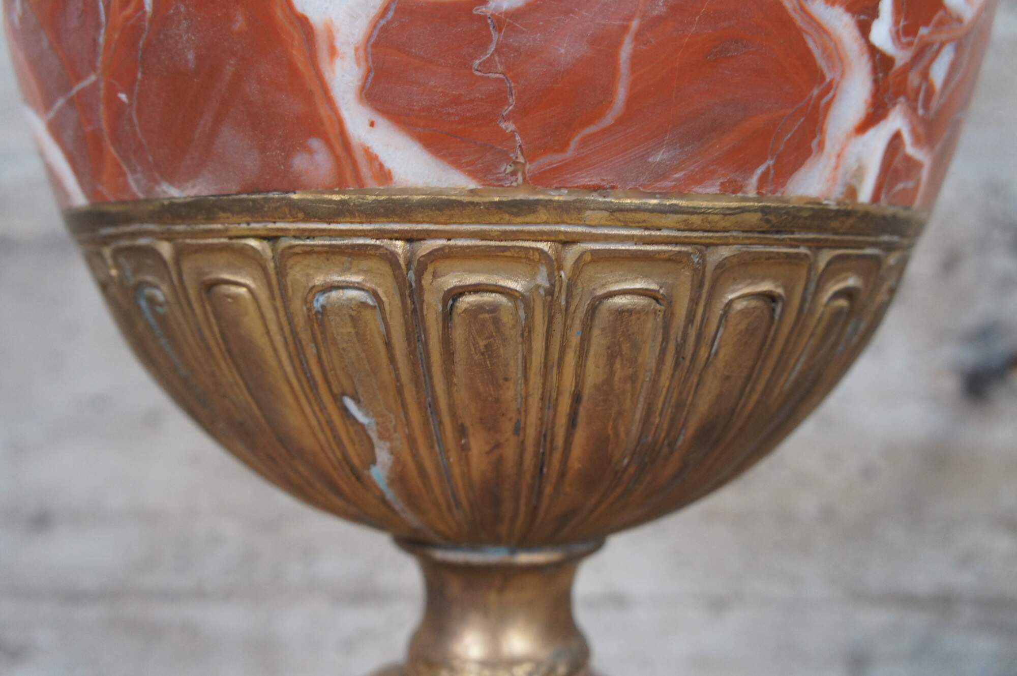 An eye catching late 19th century antique French rouge marble floor or mantel vase. Features a traditional urn shape with bronze mouth accented by ornate lion head mounted handles. Lower side of vase showcases gadrooning over an ornate foliate base. The urn is mounted to a stepped plinth base.