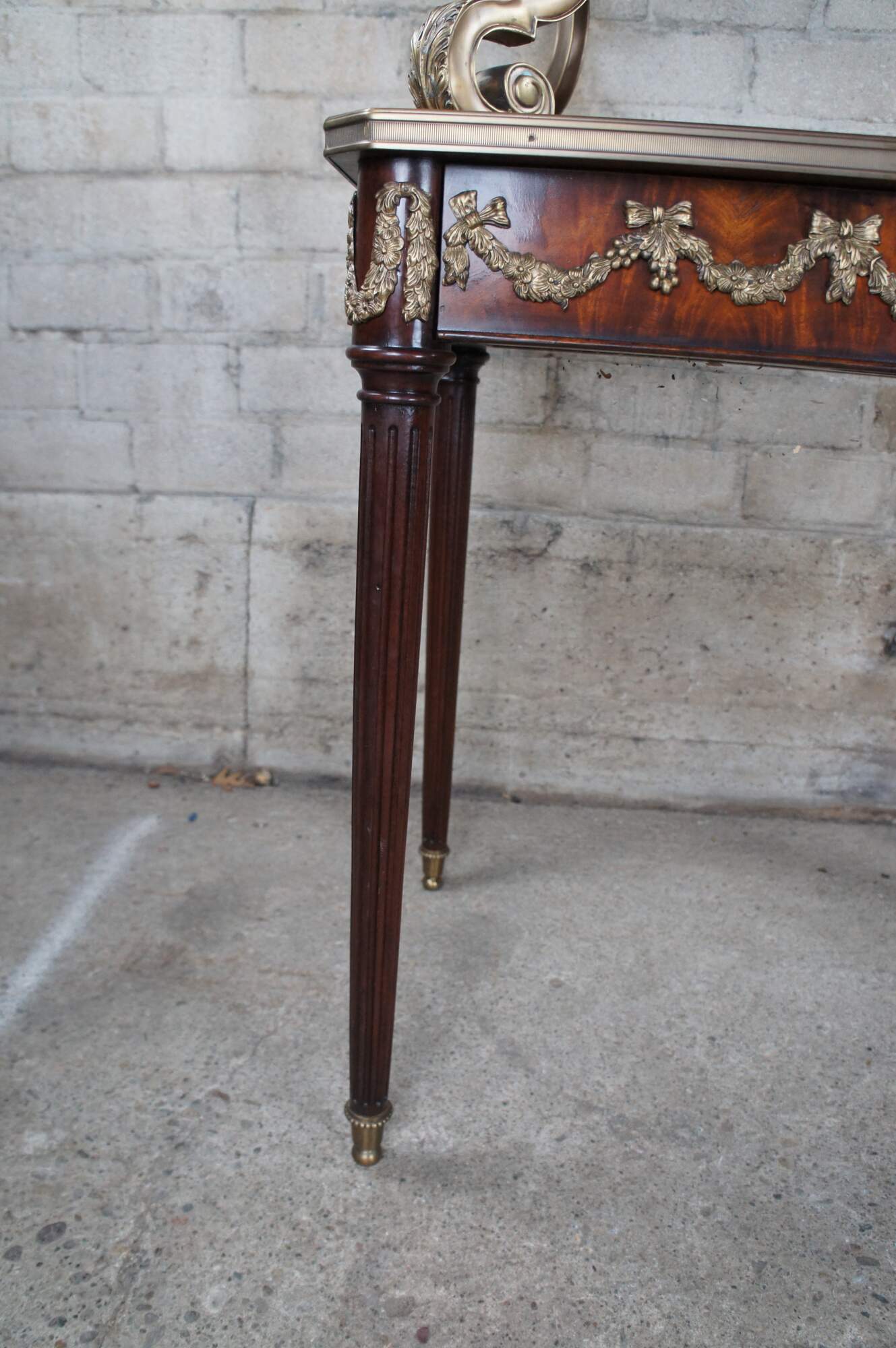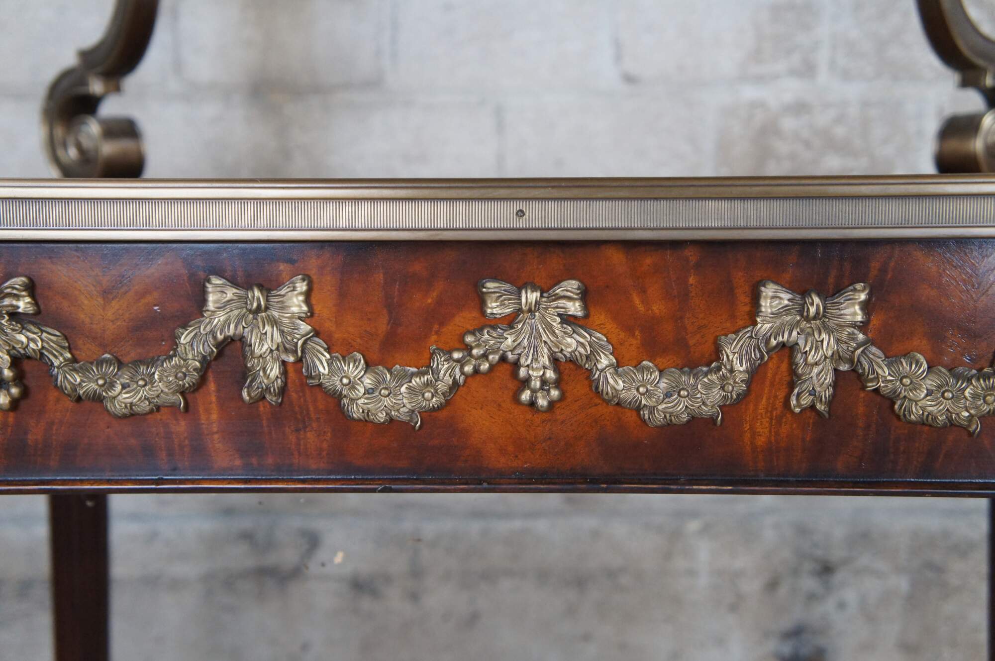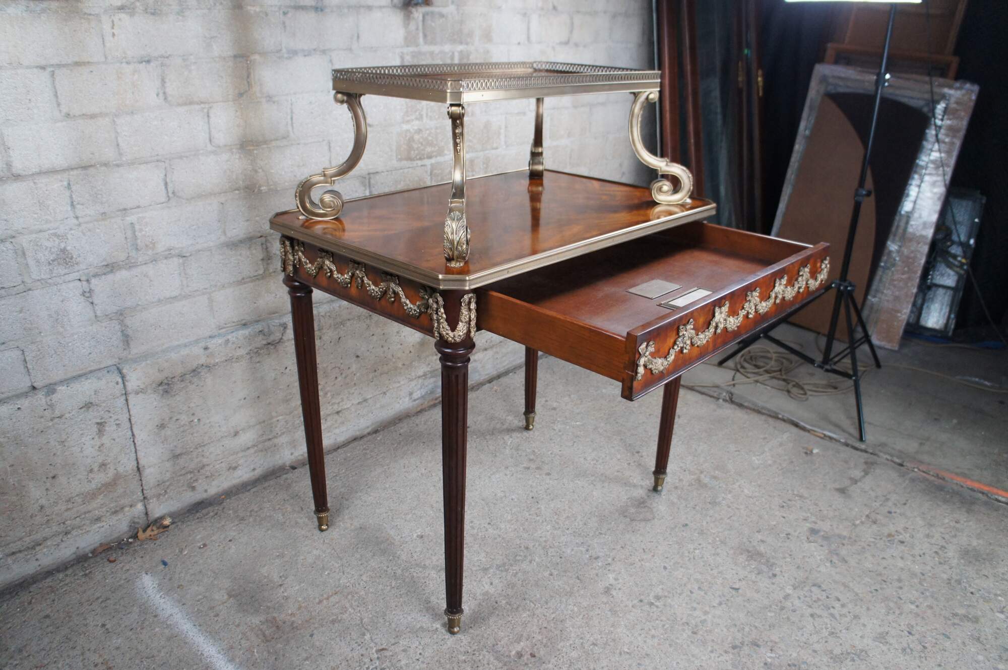 Late 20th century Louis XVI table by Theodore Alexander. Part of their Replica Collection. The original dating to 1780. A two tier crotch mahogany frame with drawer, the pierced brass galleried tier on leaf vast brass scroll supports trailing to the larger top with intricately cast brass swag and ribbon tied mounted frieze, on turned, fluted and tapering legs terminating in brass capping's and ball feet.