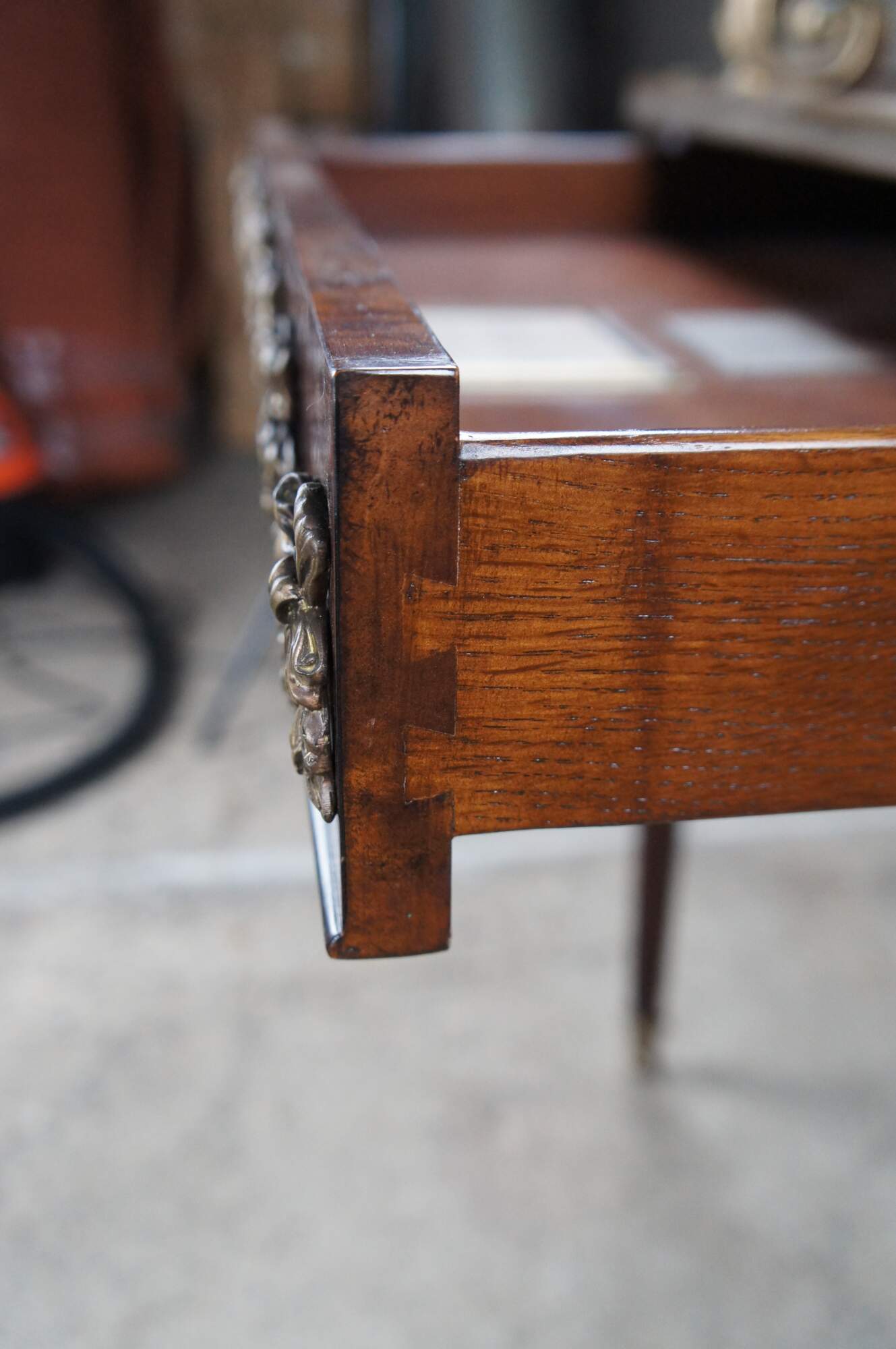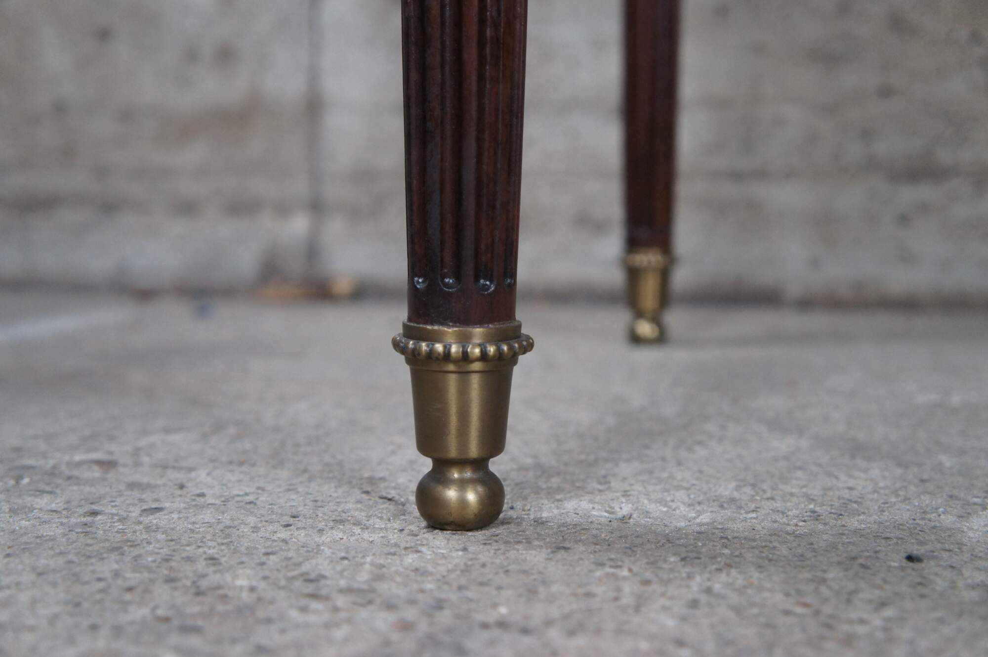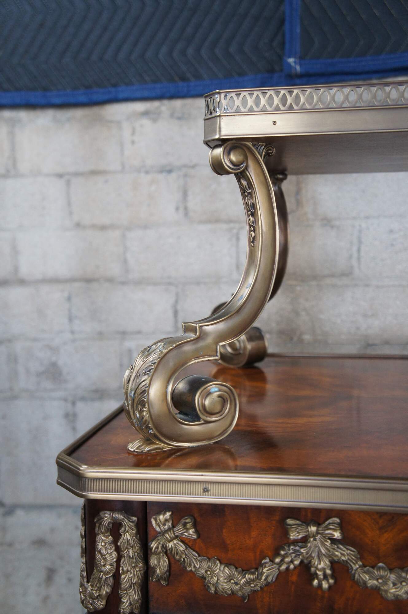 Late 20th century Louis XVI table by Theodore Alexander. Part of their Replica Collection. The original dating to 1780. A two tier crotch mahogany frame with drawer, the pierced brass galleried tier on leaf vast brass scroll supports trailing to the larger top with intricately cast brass swag and ribbon tied mounted frieze, on turned, fluted and tapering legs terminating in brass capping's and ball feet.