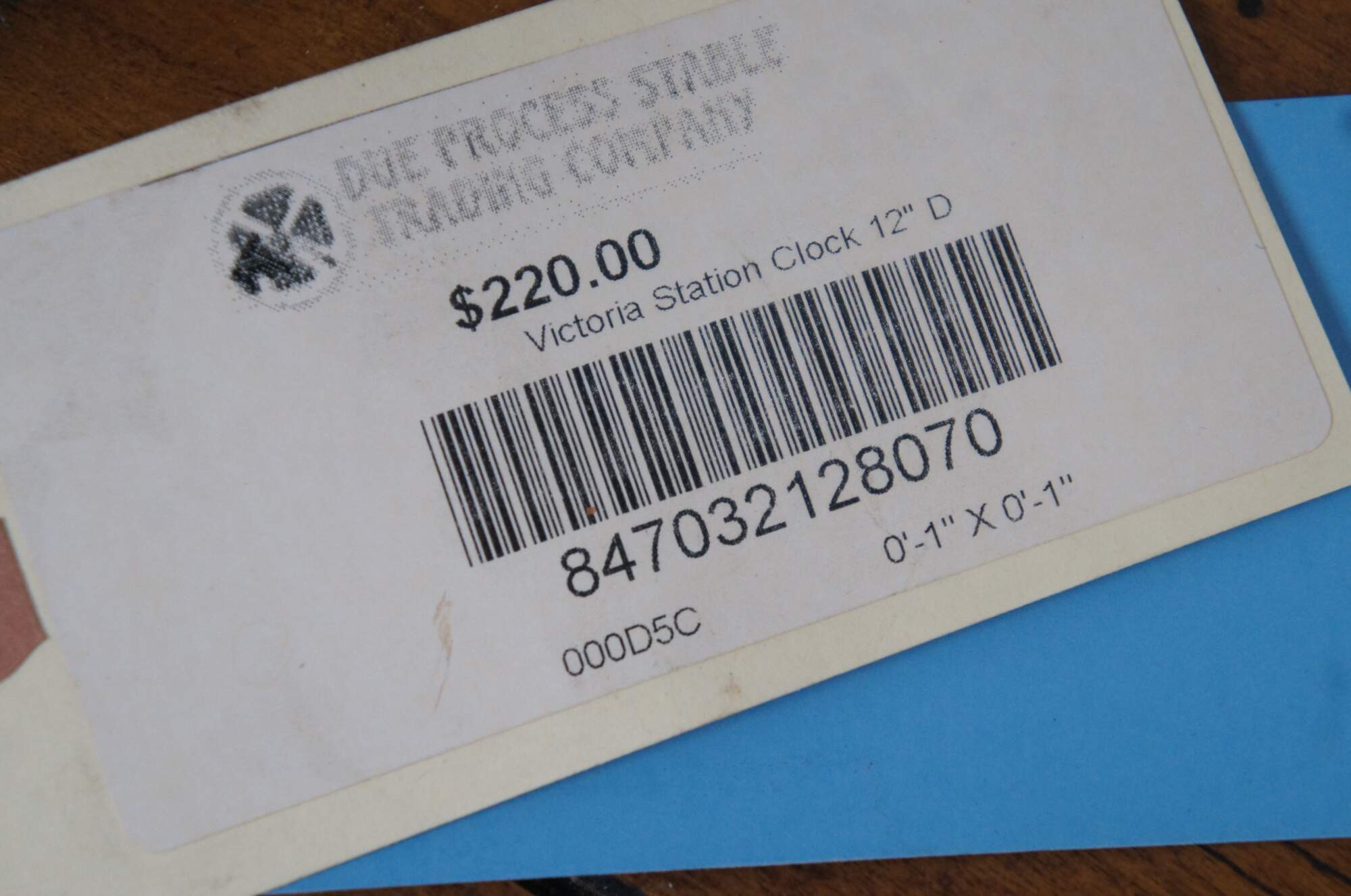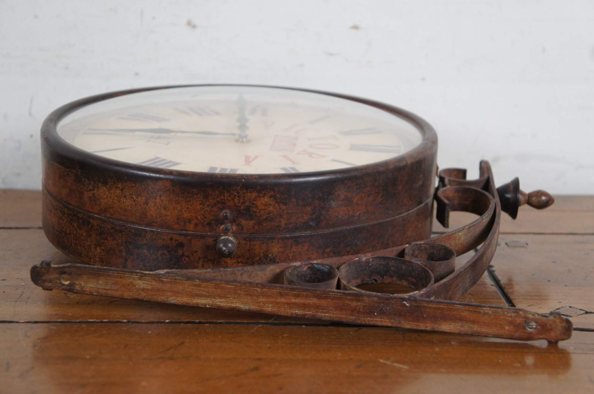 Late 20th century double sided railway clock styled after the famous clock at Victoria Station, London. Wrought metal wall mounted support and case in a dark bronze finish. 12 inch diameter printed face with faux distressing, Roman numerals, and the words Victoria Station 1747 in orange. Black metal hands. Young Town Quartz, battery operated movement.