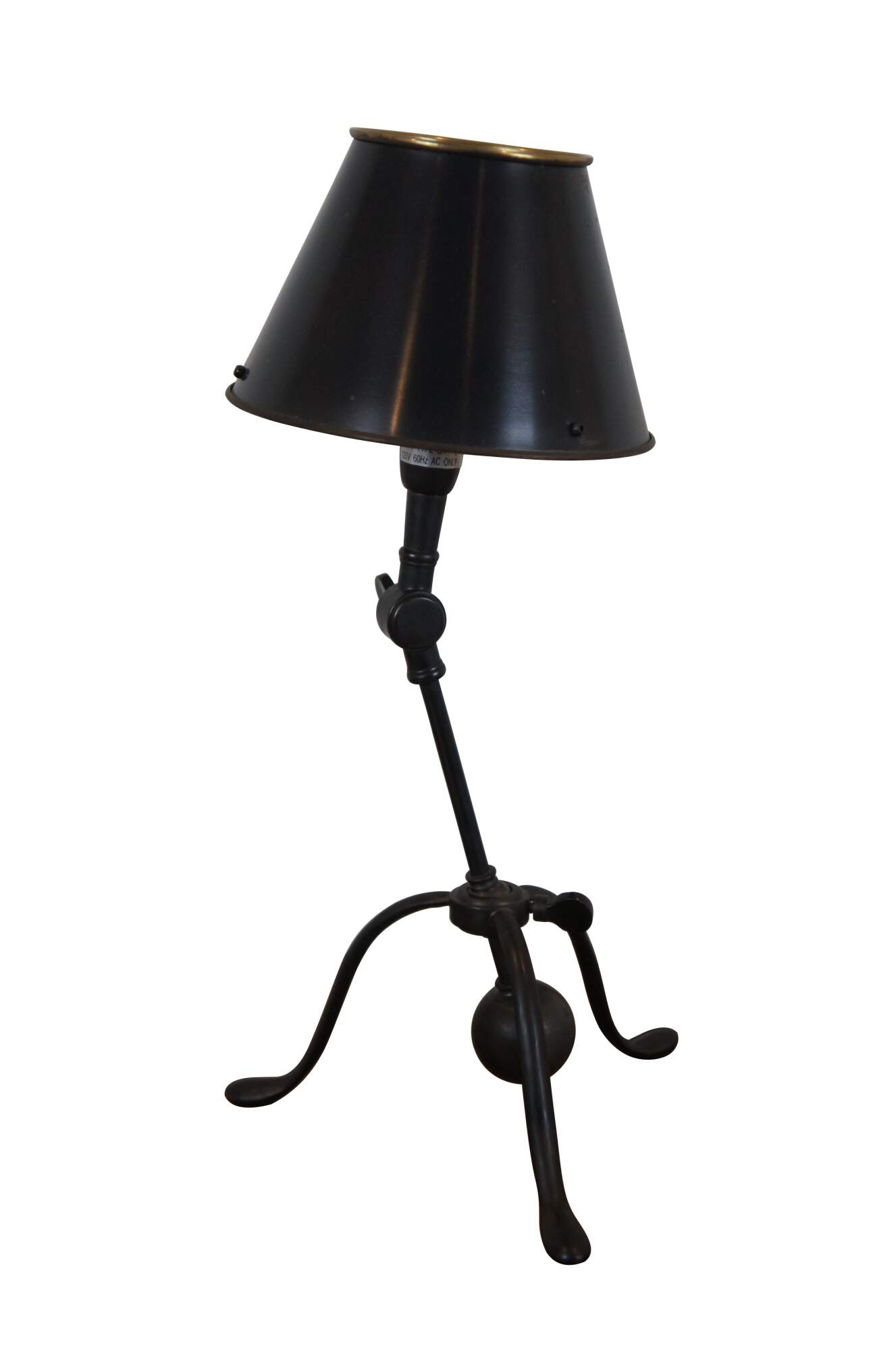 Late 20th century desk / table lamp by Ralph Lauren. Features a tripod pad foot base and two points of articulation to adjust the angle of the light. Black / oiled bronze finish. Black painted brass shade.