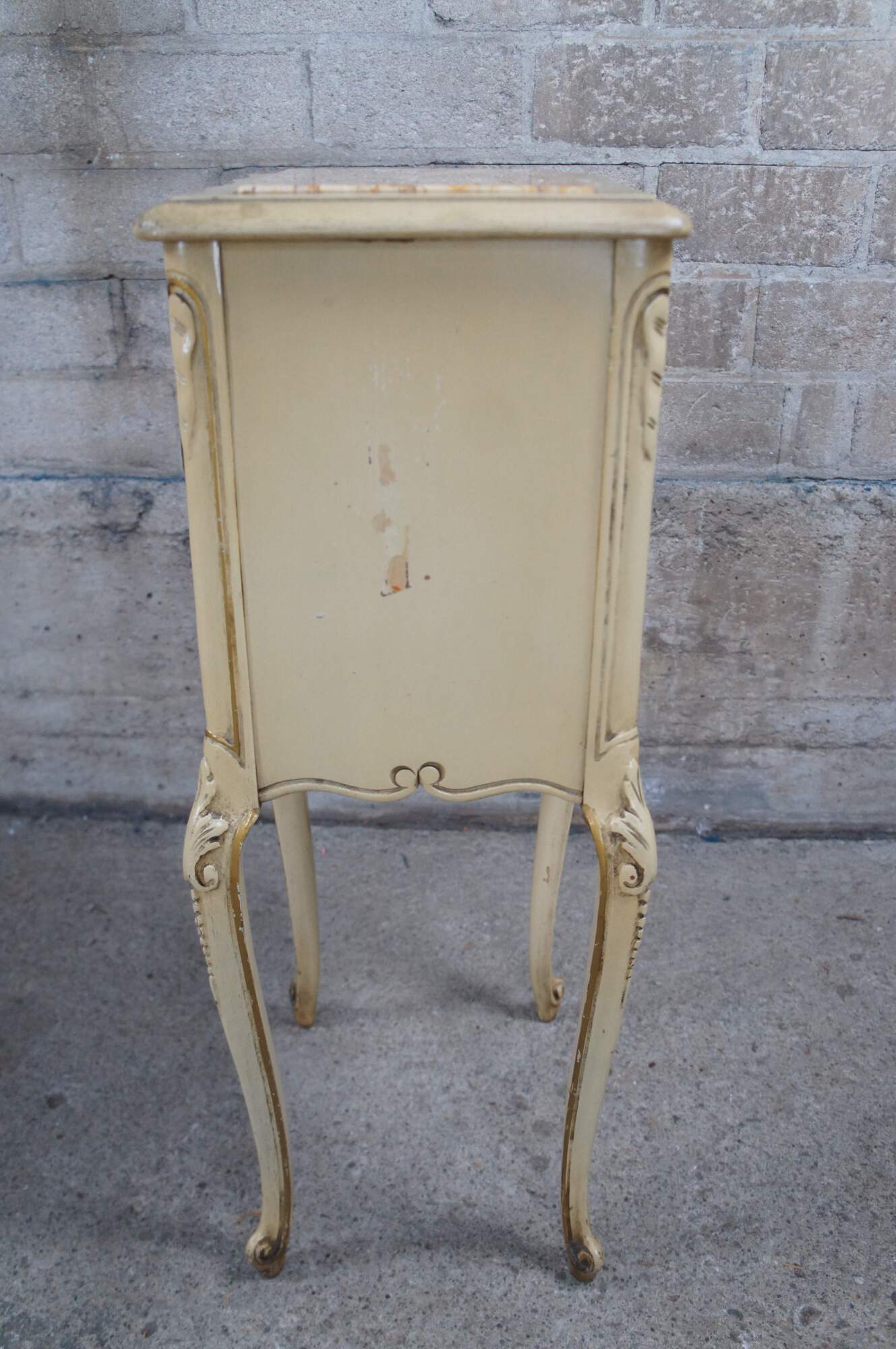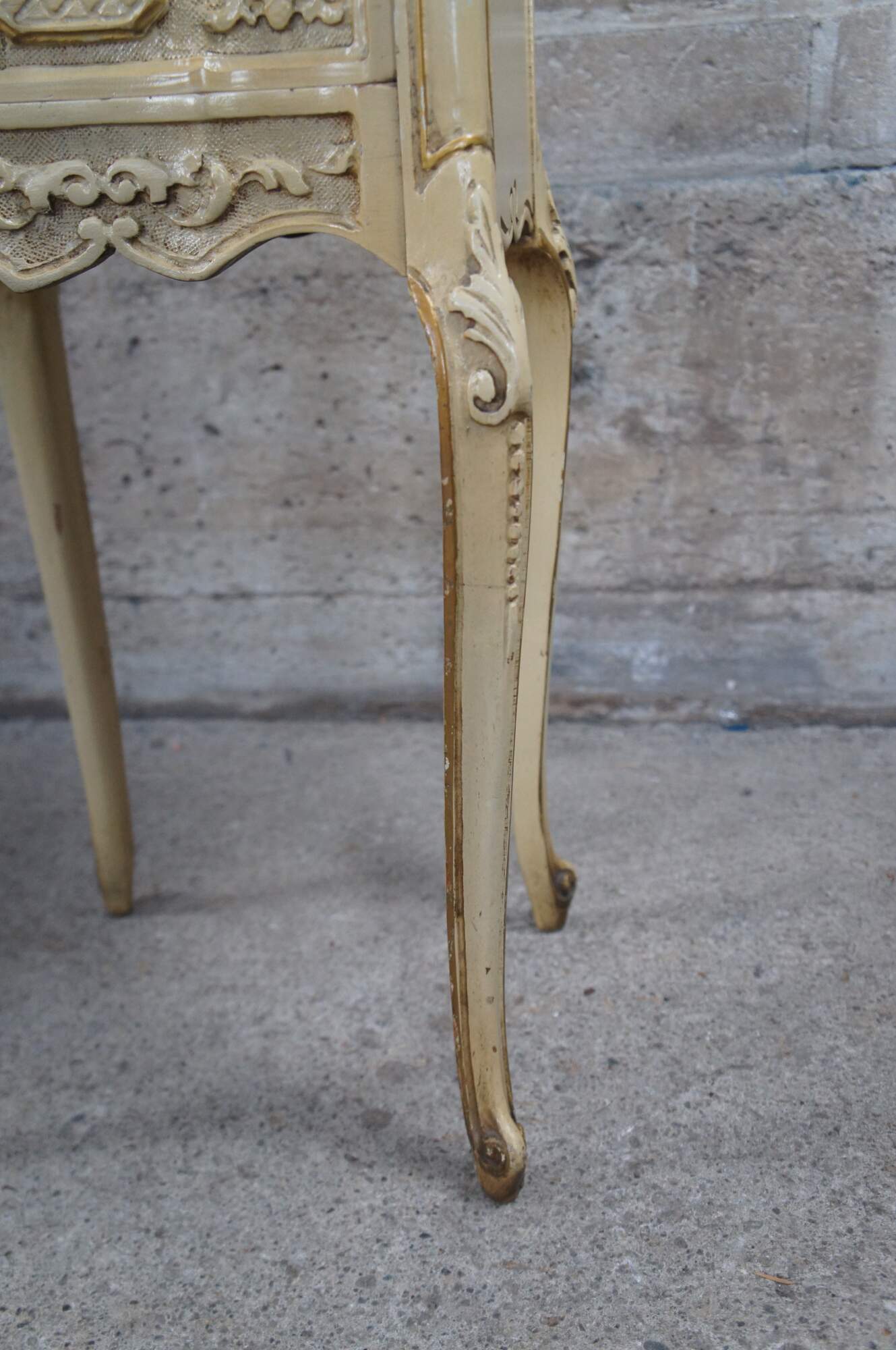 Pair of two French Provincial Louis XV style nightstands or side accent tables featuring marble inserts with scrolled foliate and acanthus designs, two drawers, and cabriole legs.
