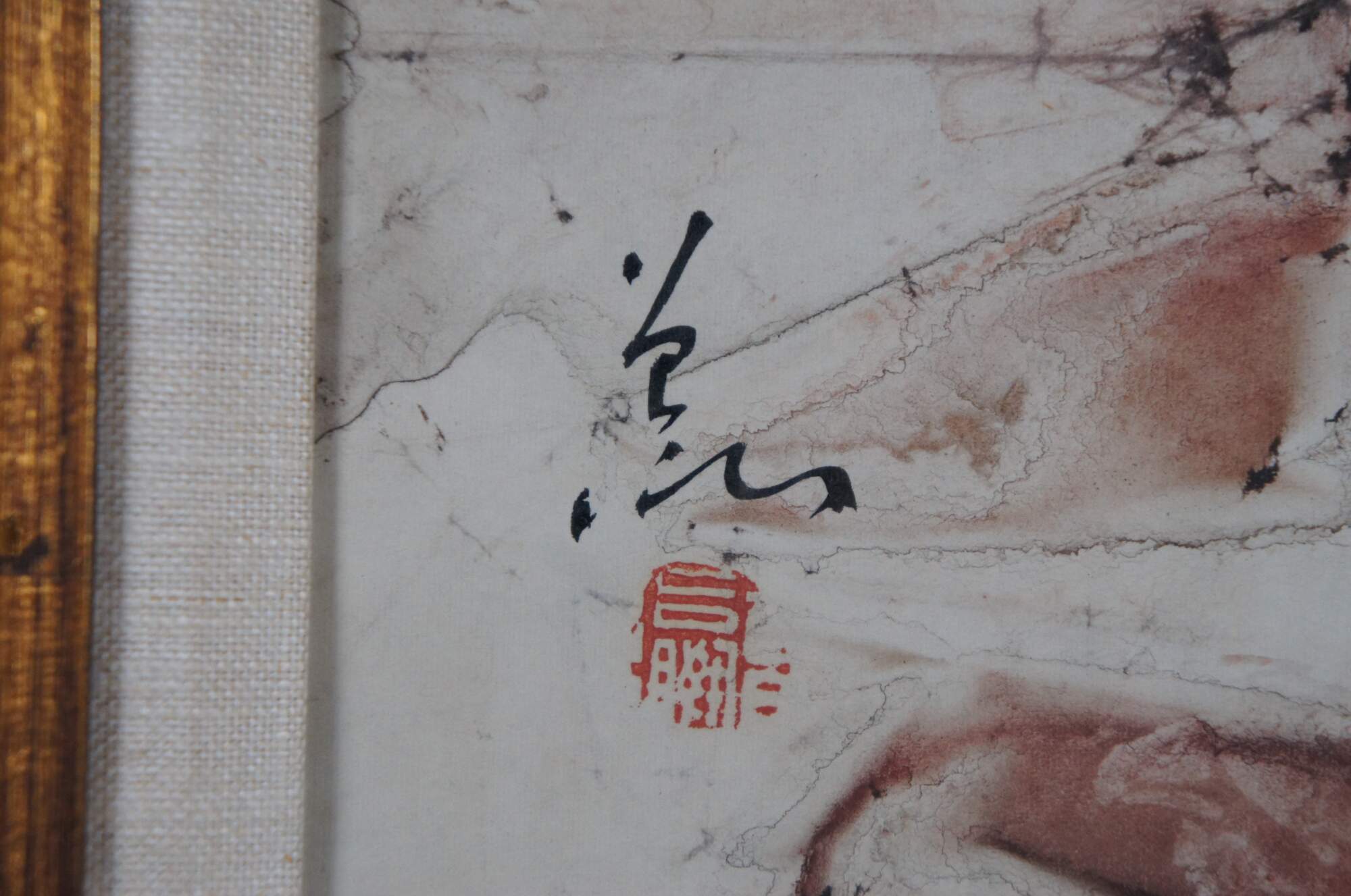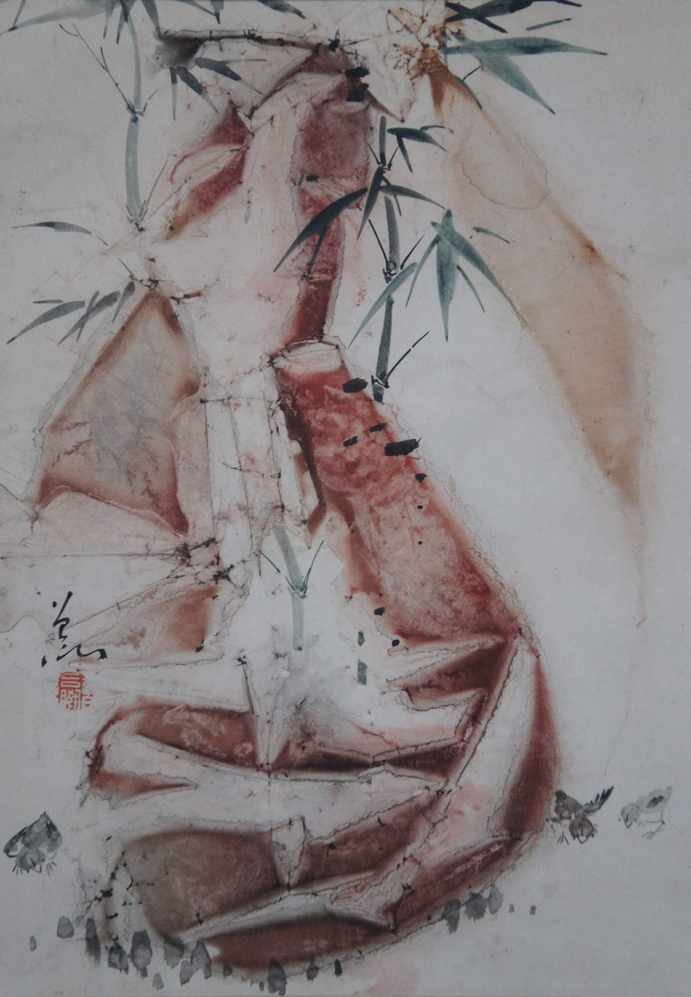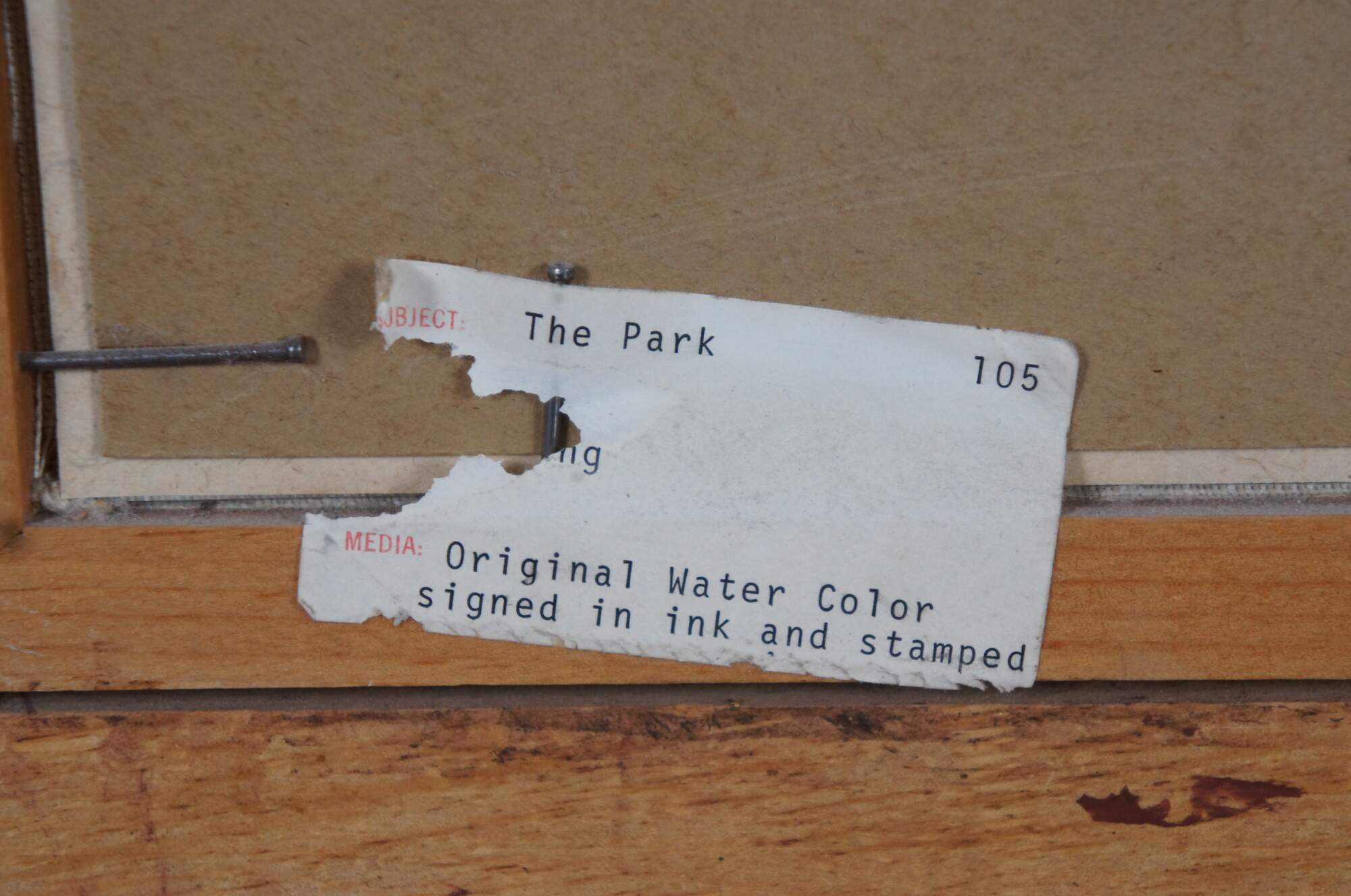 Mid 20th century Chinese watercolor painting titled "The Park," showing a semi abstract tree surrounded by stalks of bamboo and a few small birds. Signed in ink and stamped by the artist in the middle left side. Red painted and giltwood frame with raised bevel and carved details; linen mat.