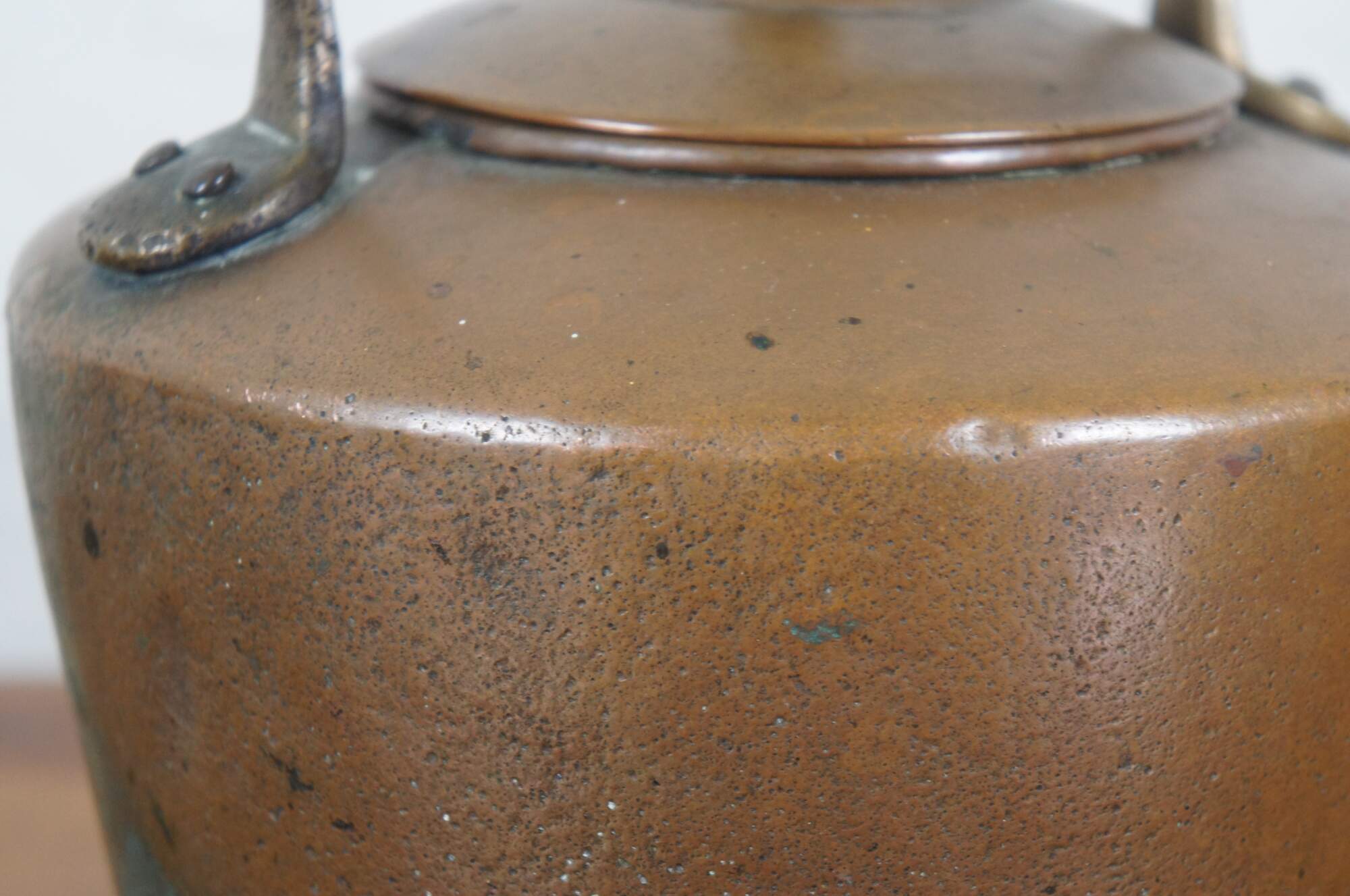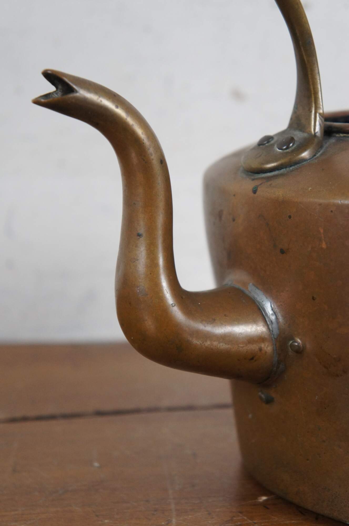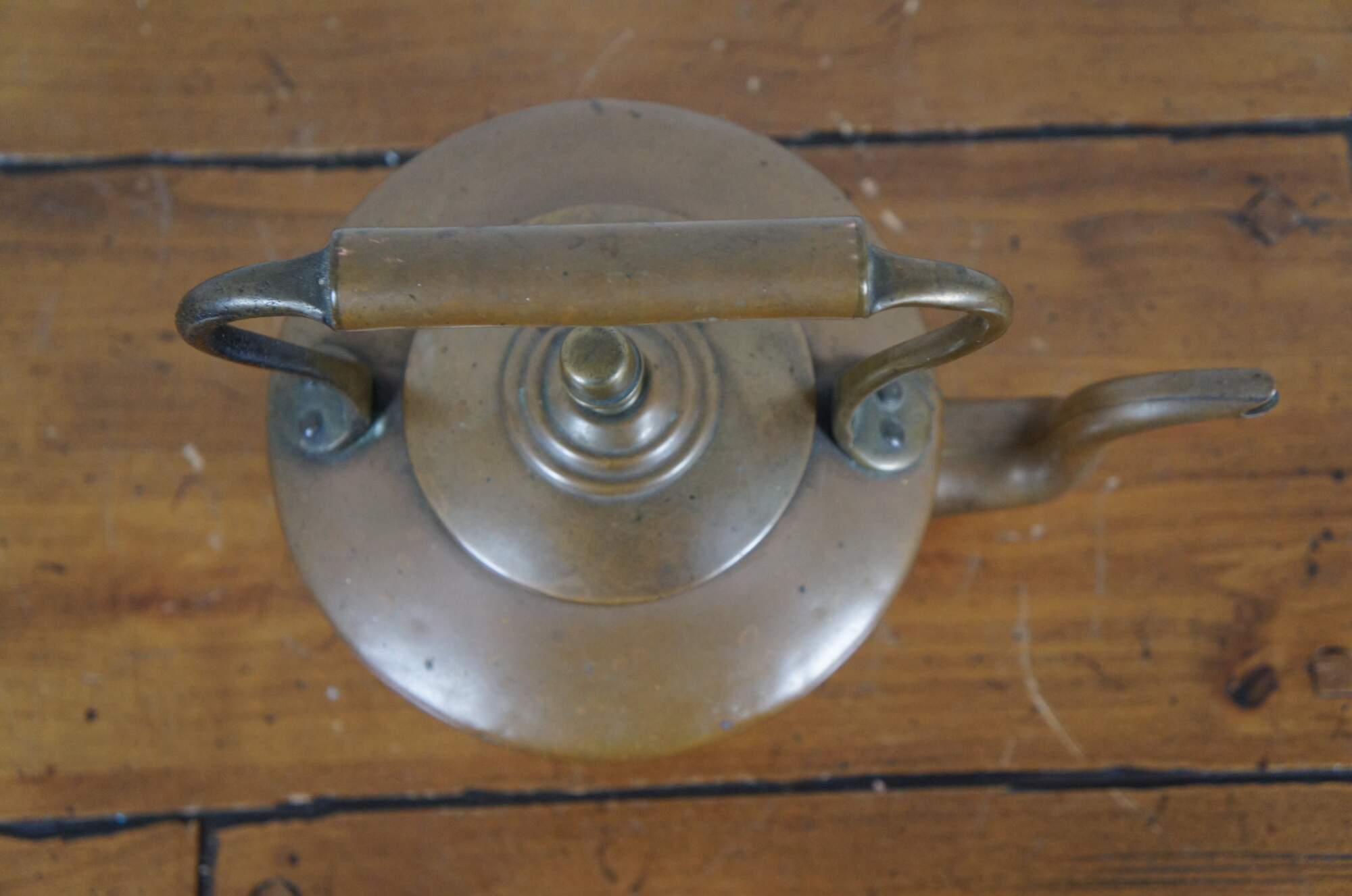 Late 19th to early 20th century dovetailed copper tea / water kettle with slightly tapered round body, gooseneck with bird spout, fixed bail handle, and acorn shaped finial on the lid.