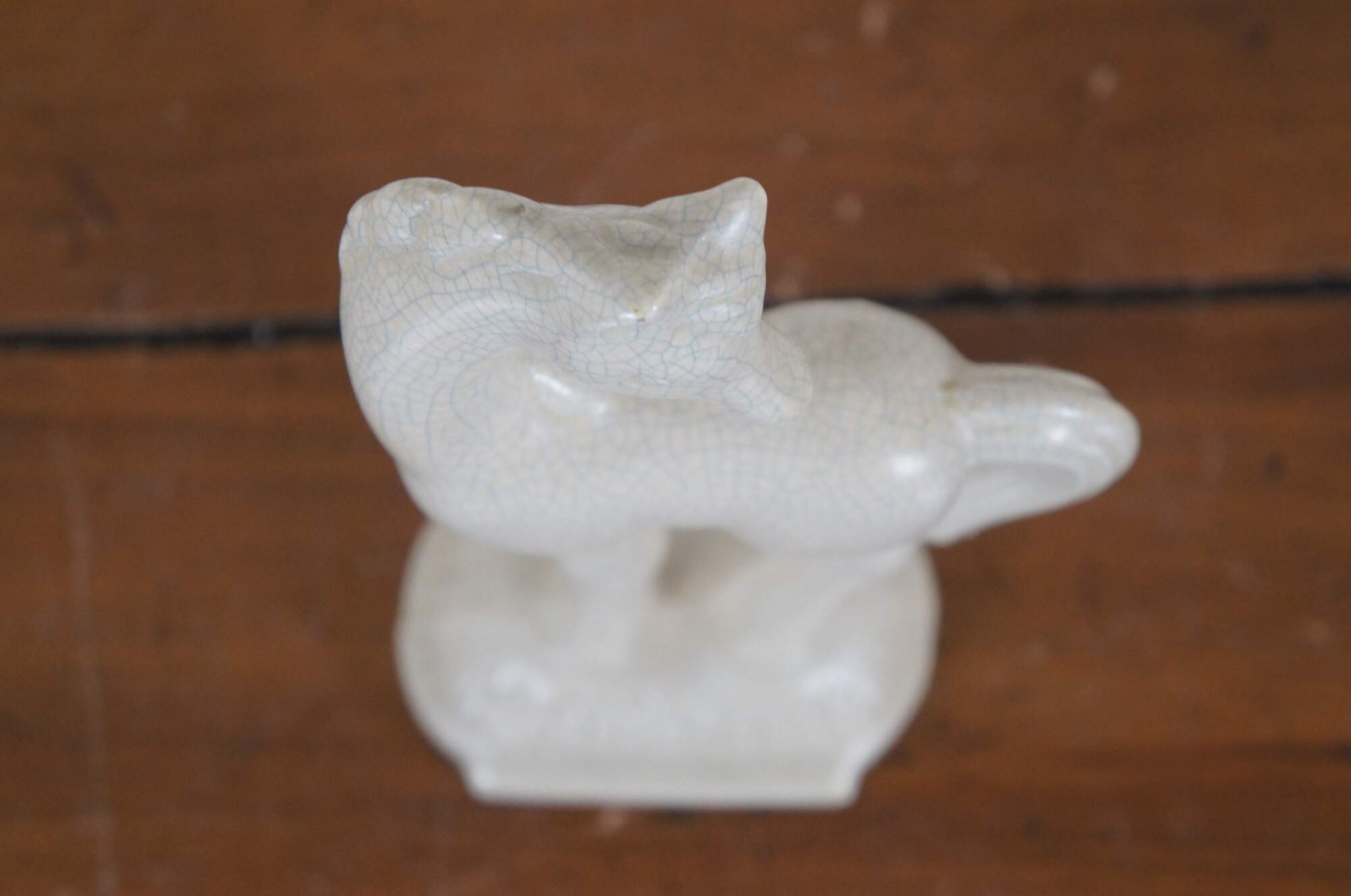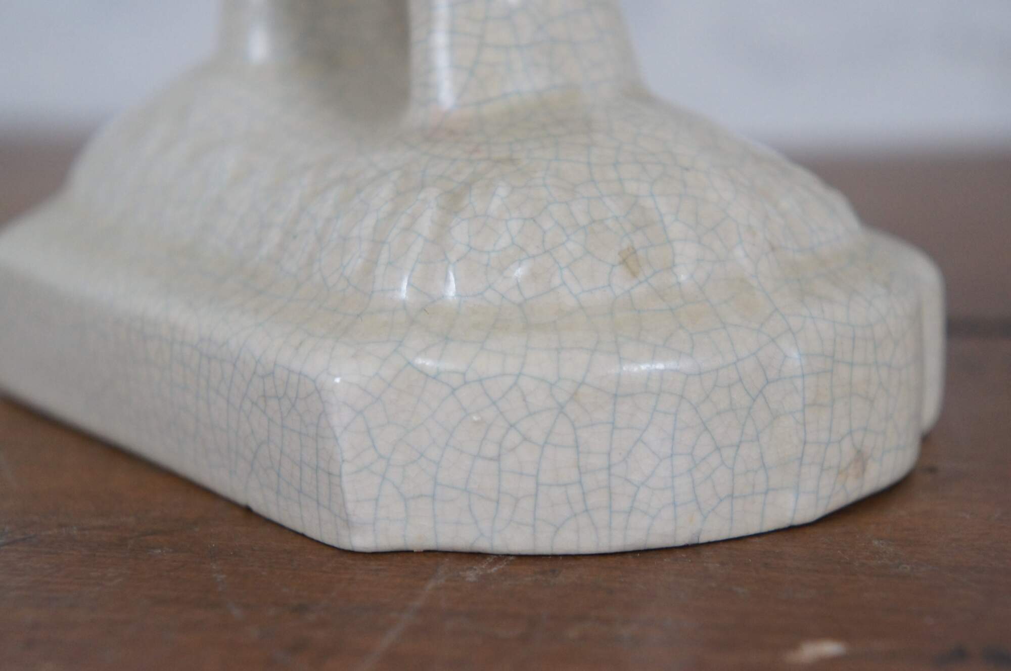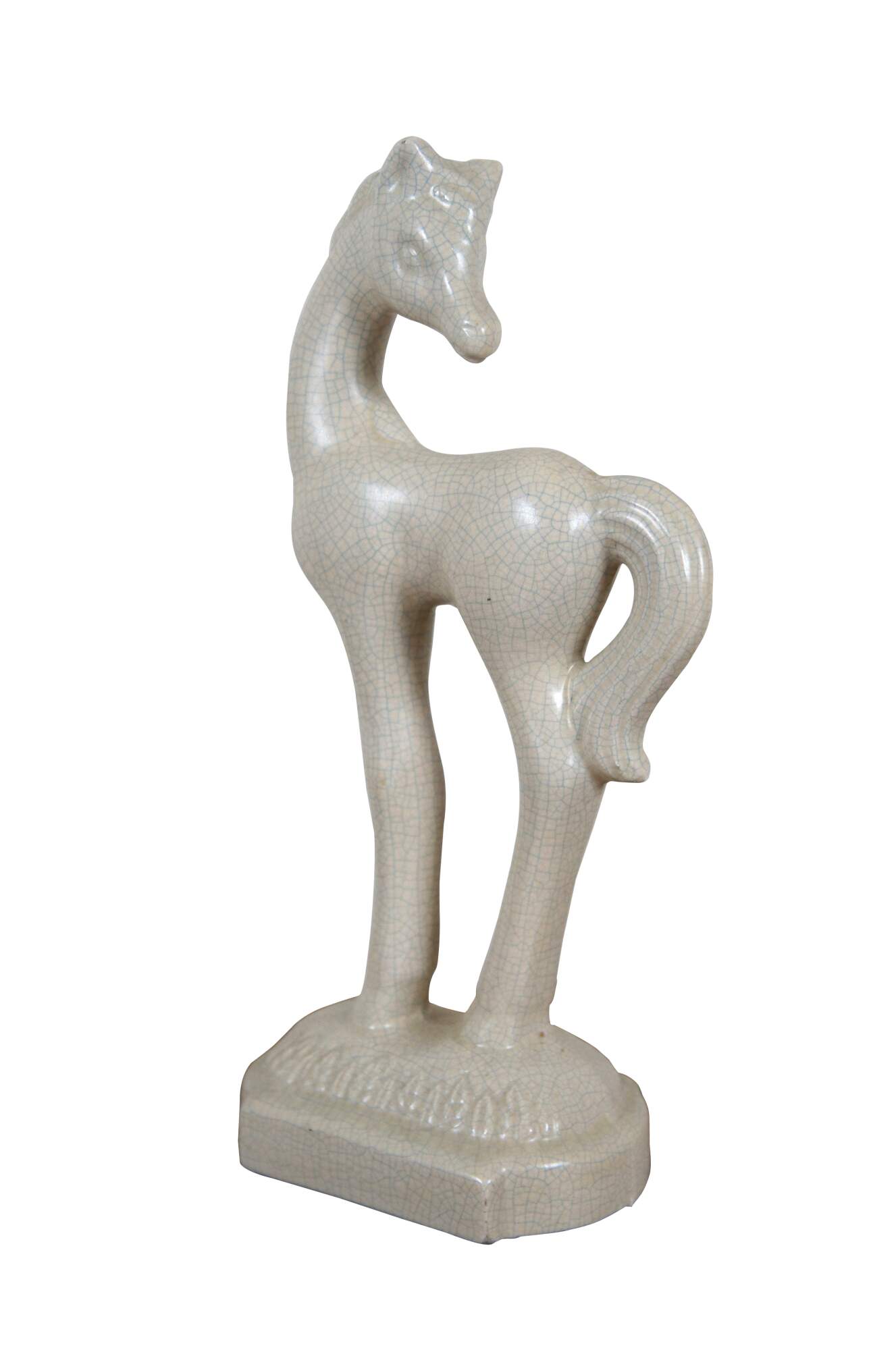 Mid 20th century ceramic horse figurine. Stylized art Deco inspired design with long legs and head turned back, staning on a oblong plinth edged with leaves. Cream coloring with pale blue artificial crazing.