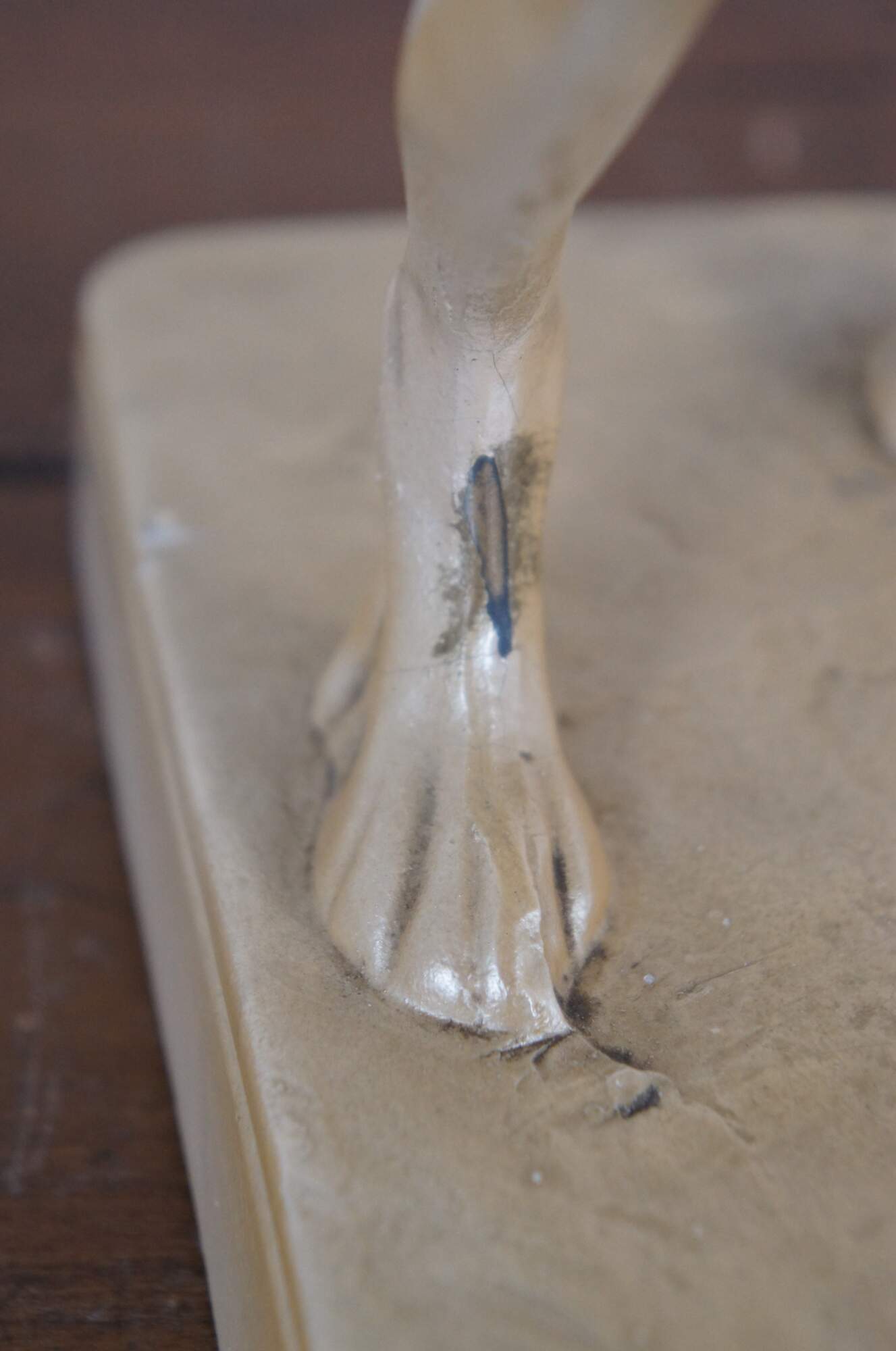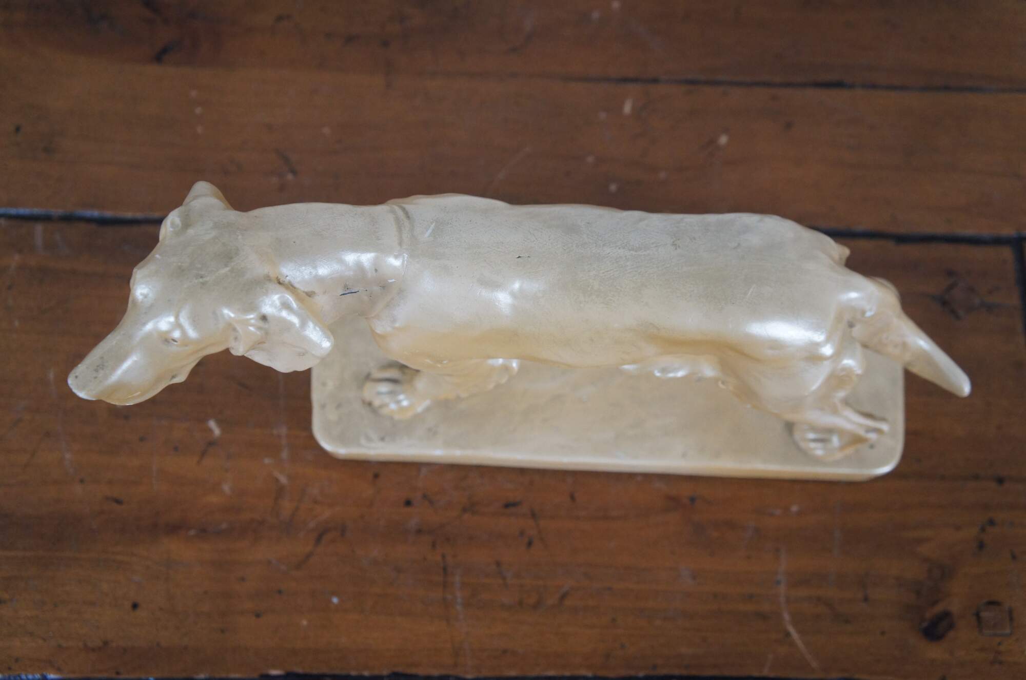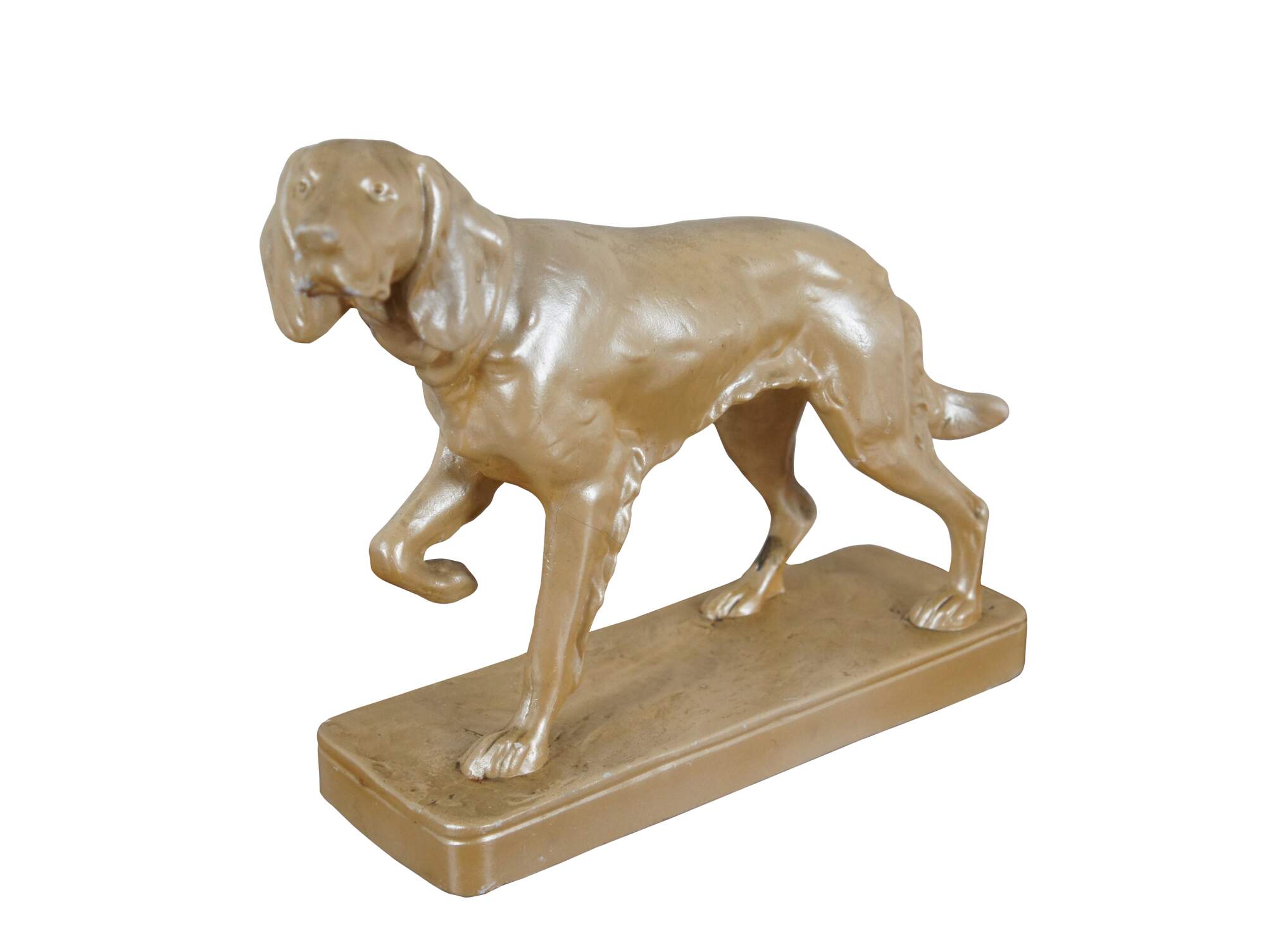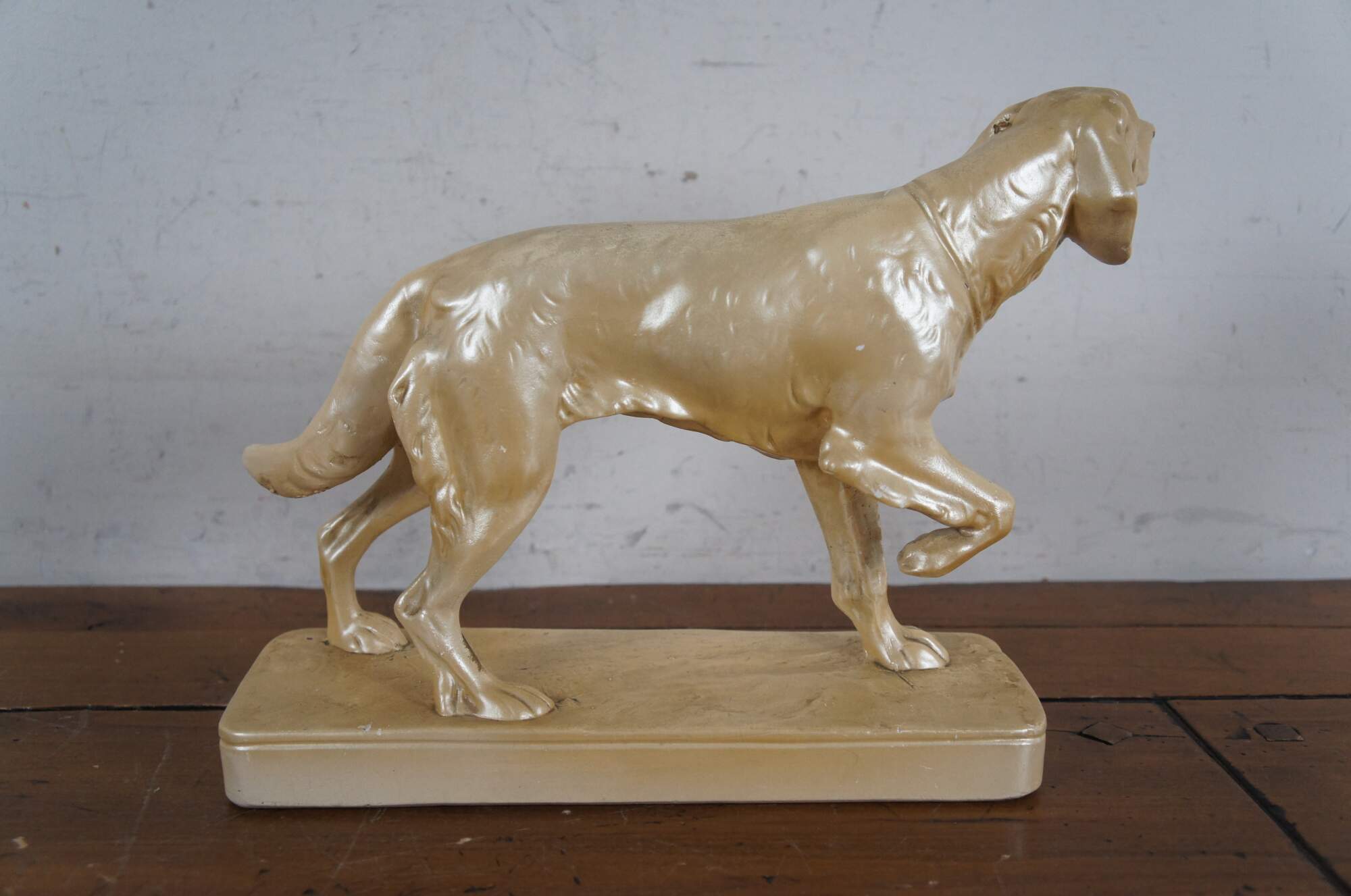 Mid to late 20th century chalkware figurine of a hunting dog / Spaniel / Retriever pointing at his prey, set on a rectangular plith and finished with a cream colored metallic paint.