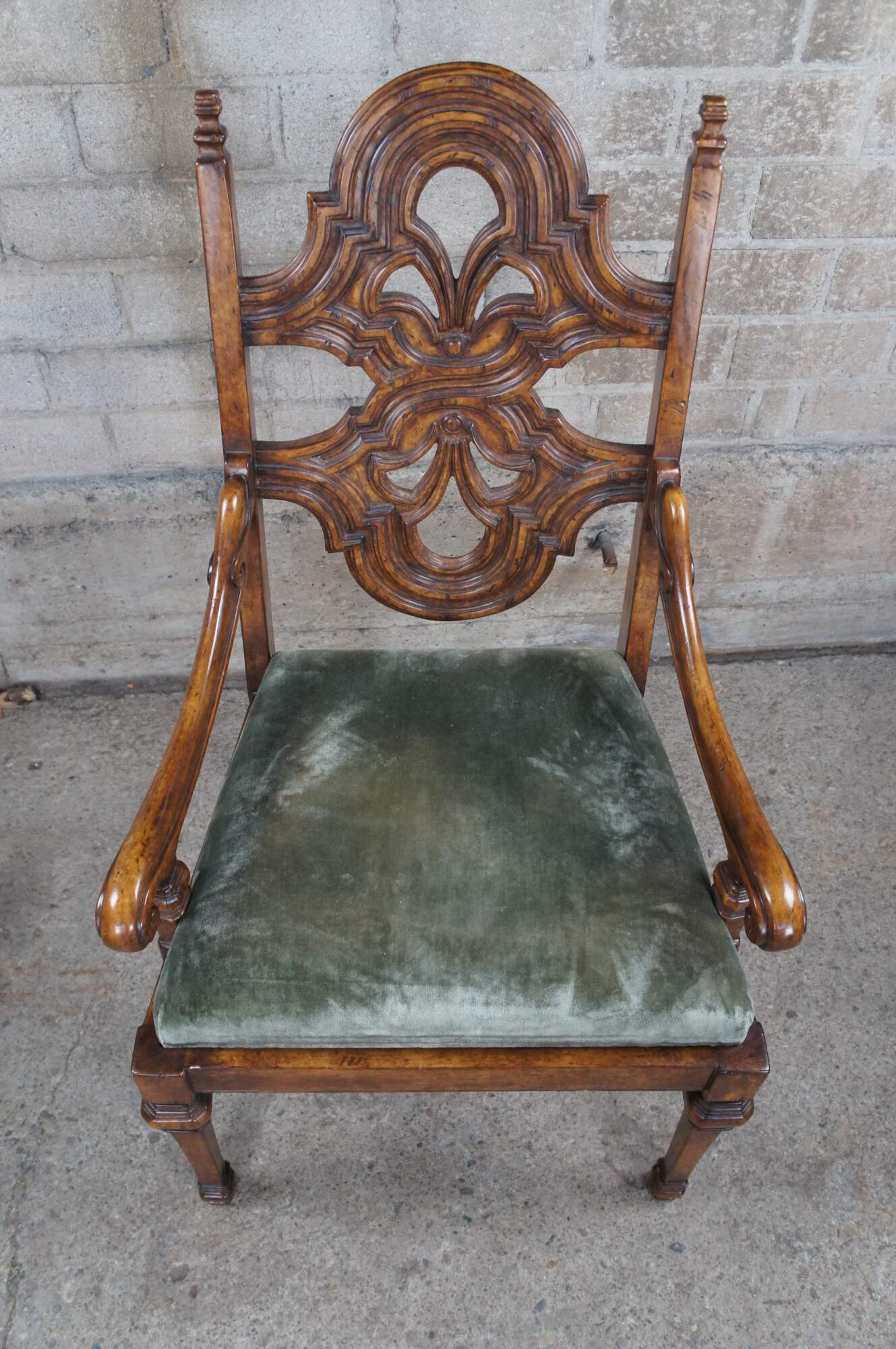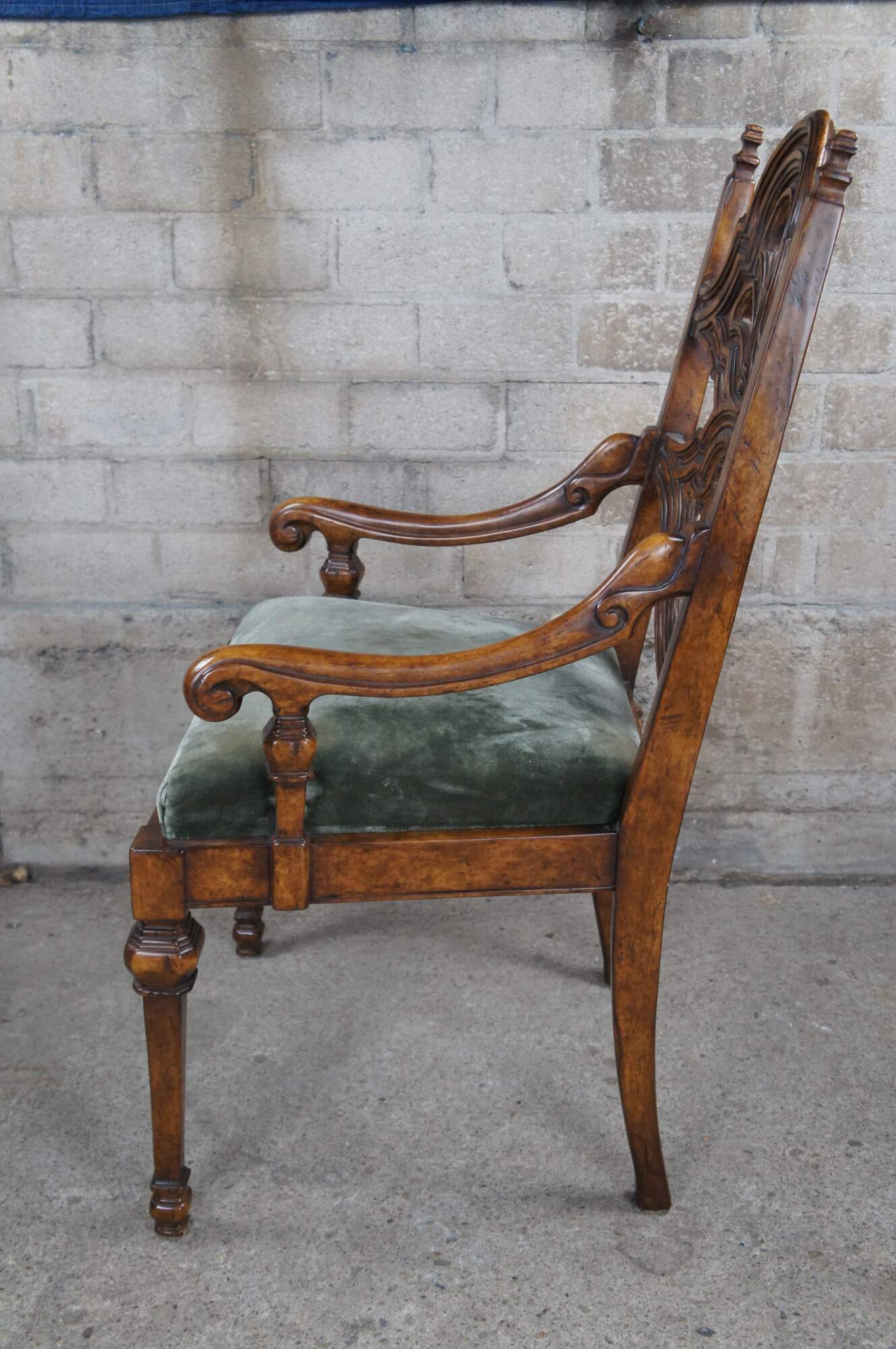 A charming late 20th century arm chair by Theodore Alexander. Features a mahogany framed with interlaced and pierced back over green velvet seat and square tapered legs. Great for use as an occasional piece or office furnishing.