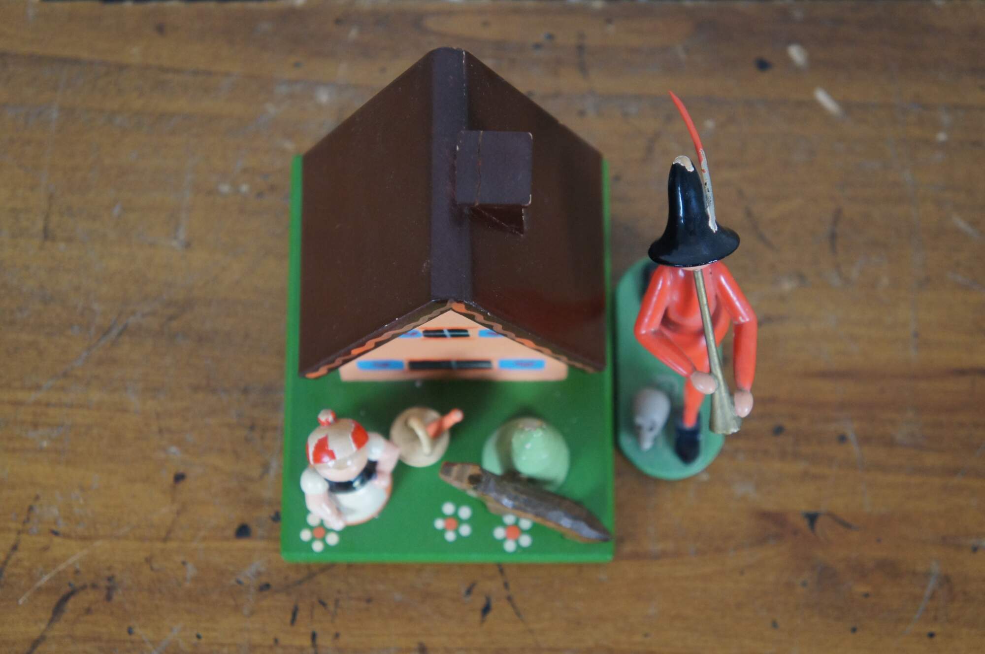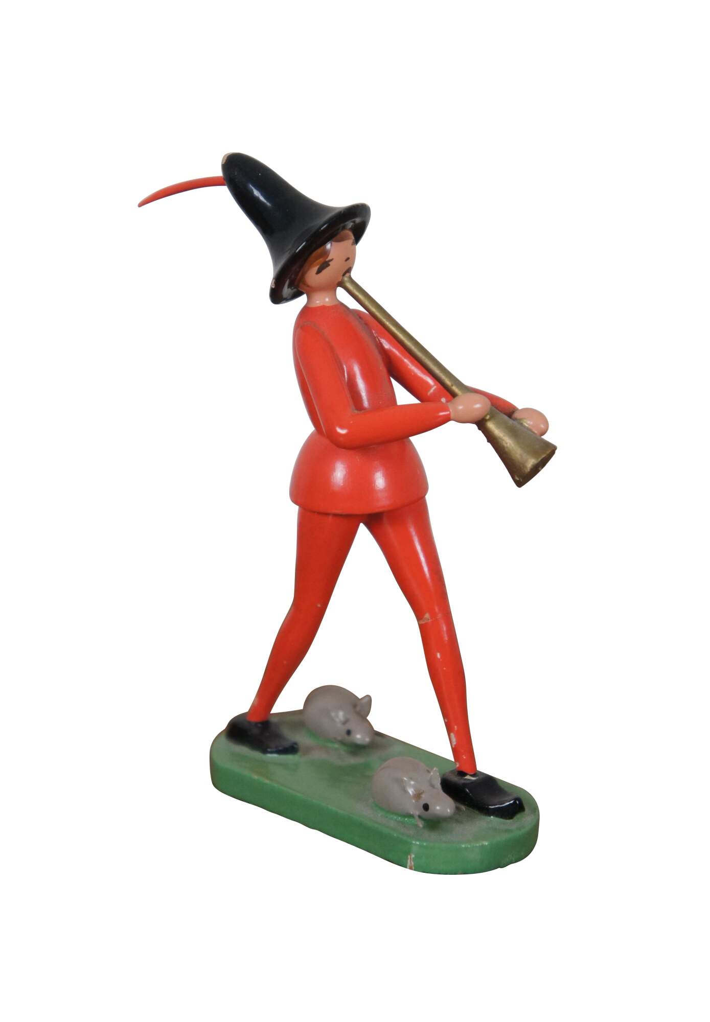 Pair of mid to late 20th century hand painted German wooden figurines by Wendt and Kuhn. One represents the Pied Piper of Hammelin playing a horn with a pair of rats at his feet. The other is a coin bank tableau showing Little Red Riding Hood standing with her basket and a wolf in front of her Grandmother's cottage. Key included.