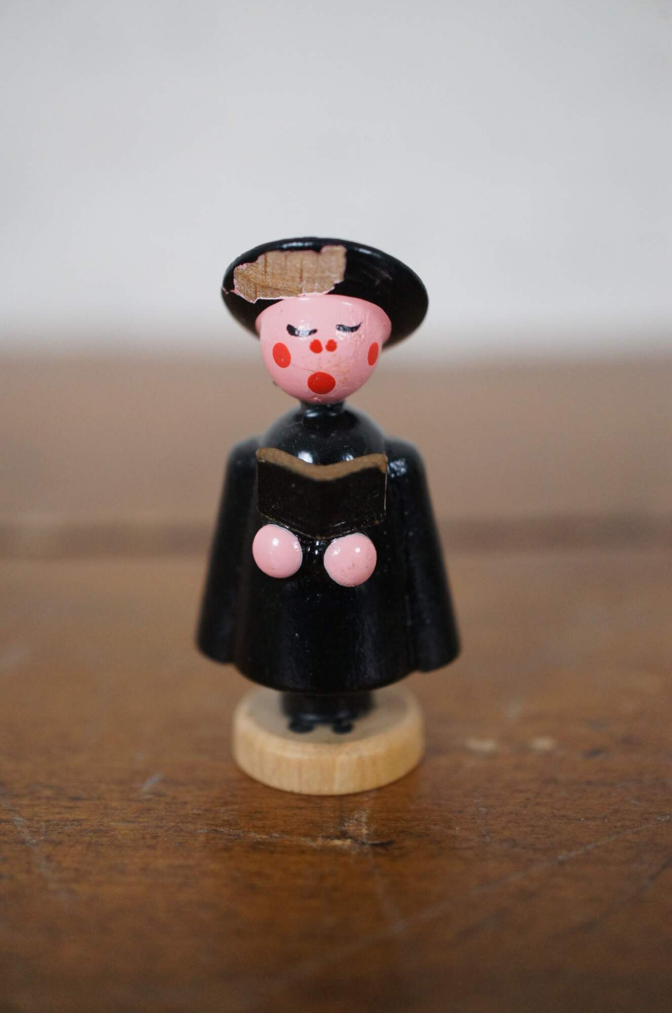 Mid to late 20th century German Erzgebirge hand carved and painted figurines. Set of five Christmas carolers / church choir figures dressed in black capes / choir robes and hats, four holding their music books and one carrying lantern and Christmas star.