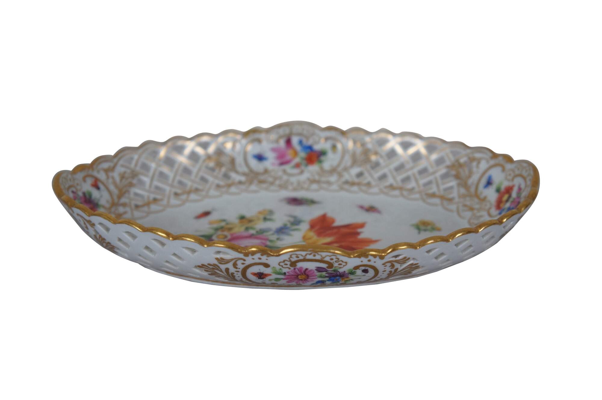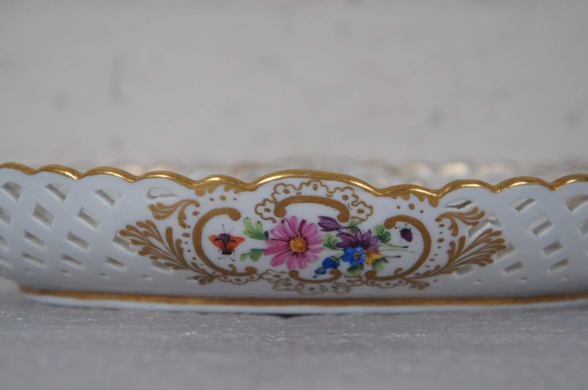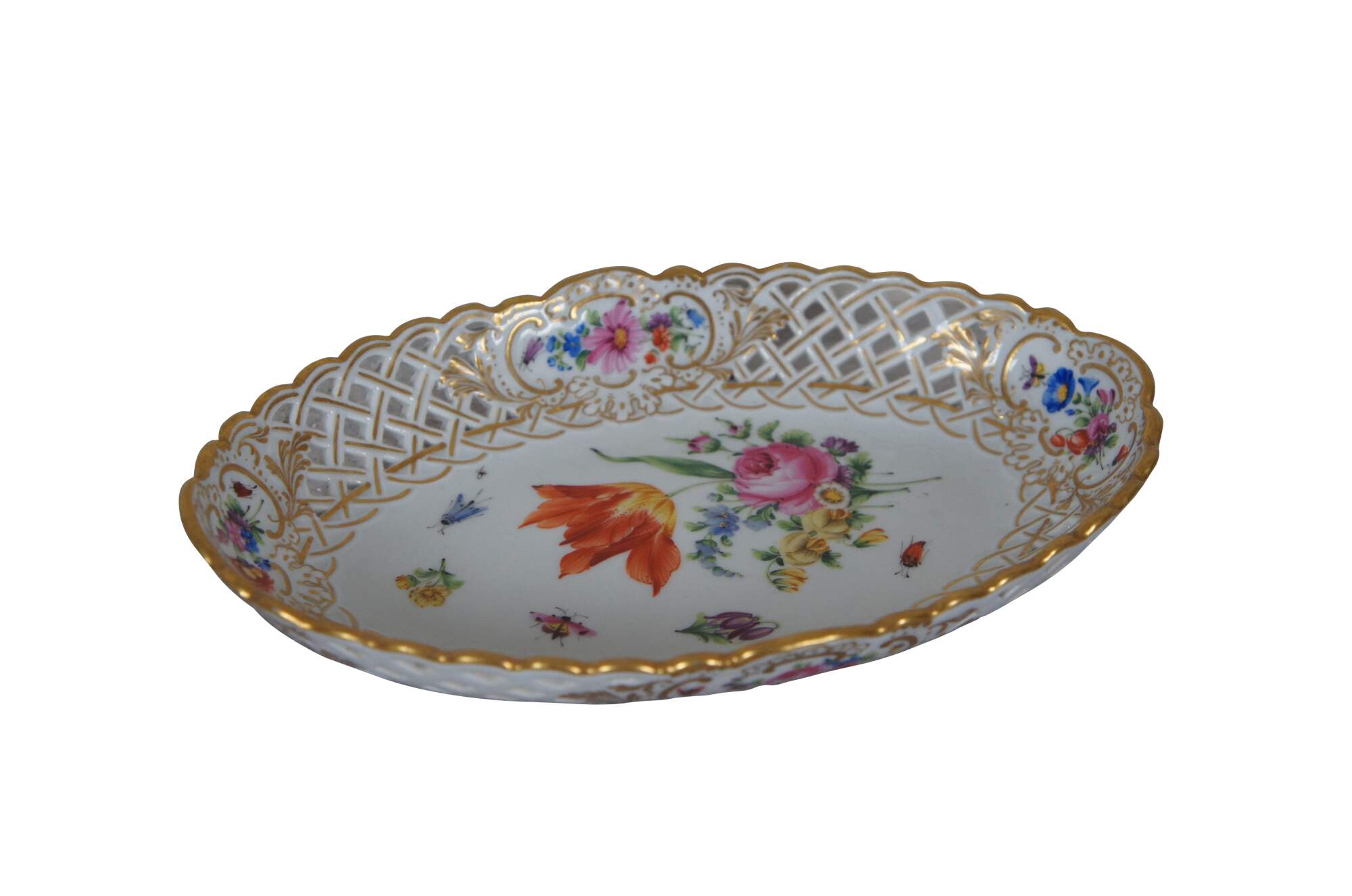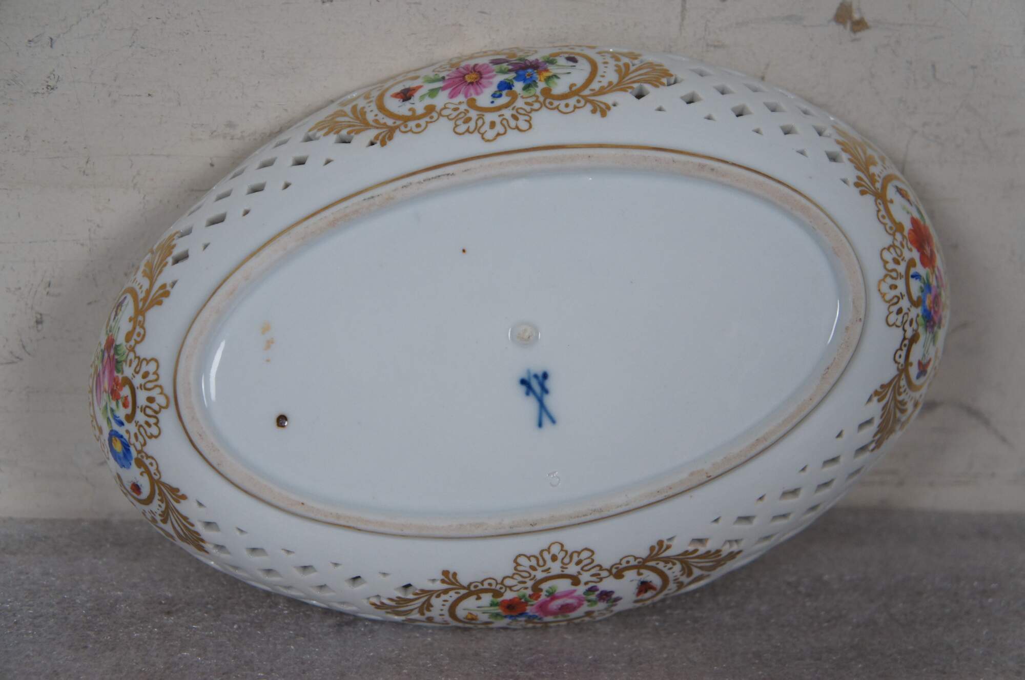 Early 20th century Meissen porcelain dish. Oval form with pierced basket weave sides, scalloped edge, hand painted with gilded details and multicolored sprays of flowers and insects. Incised number 3.