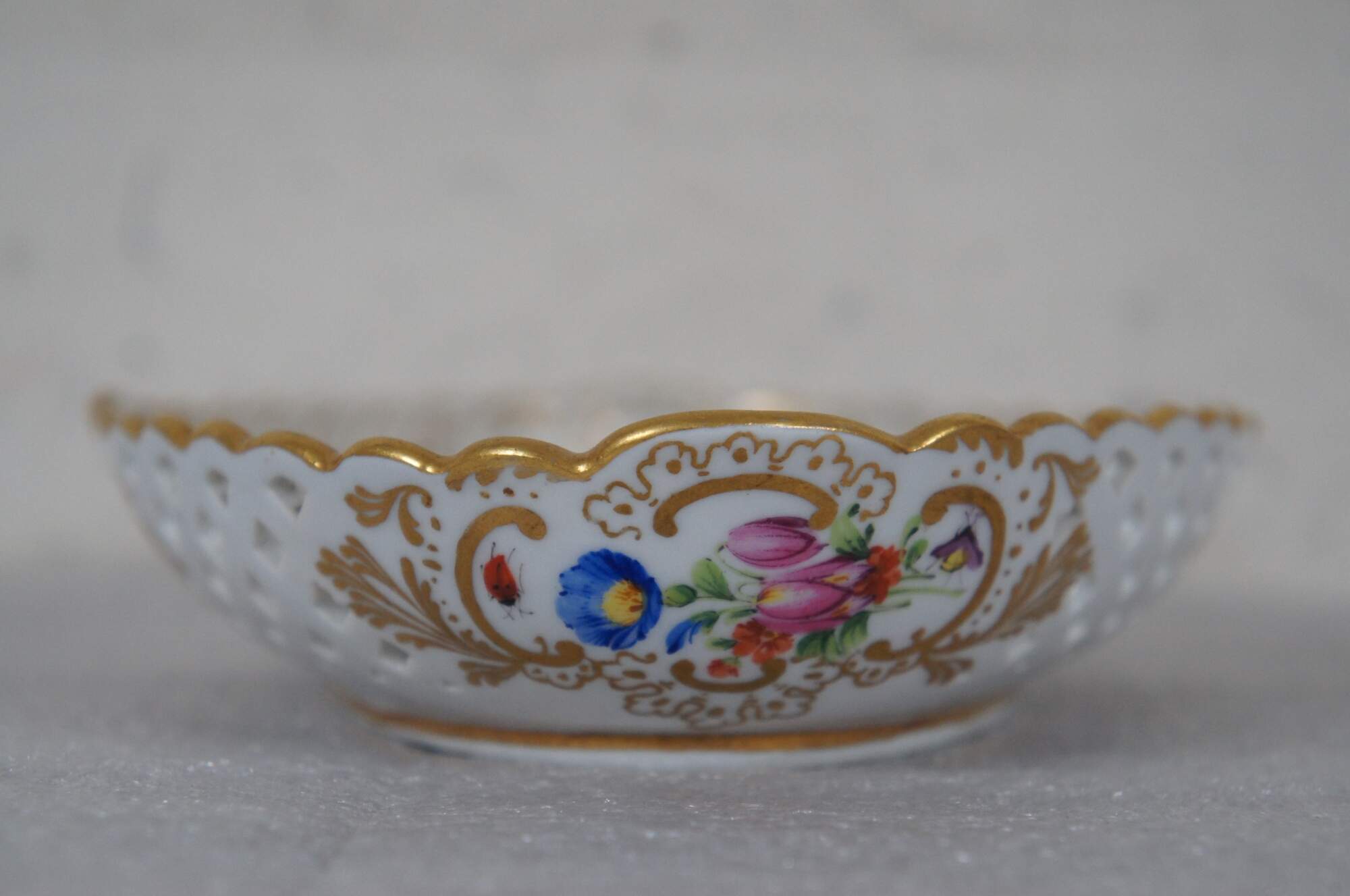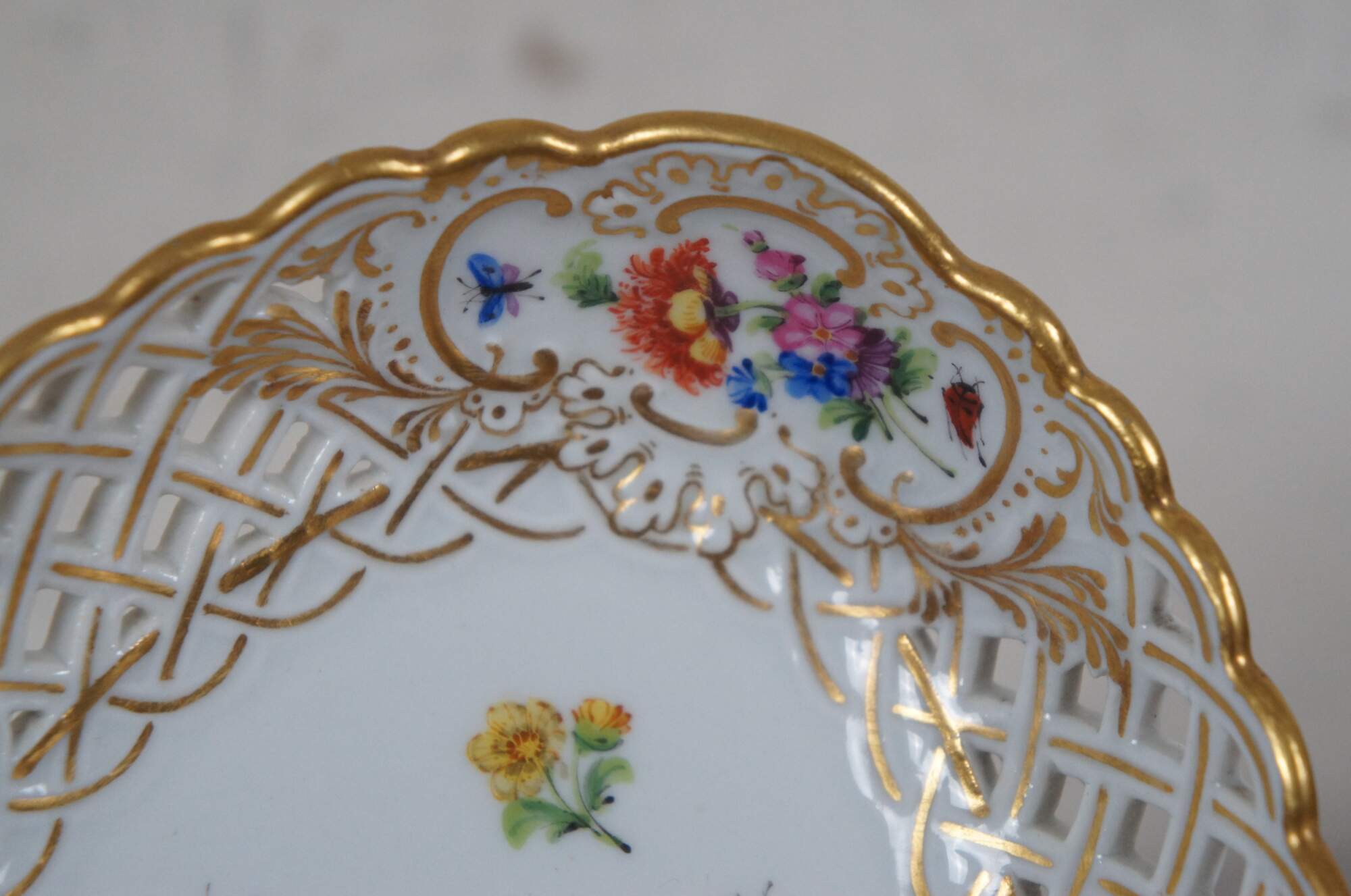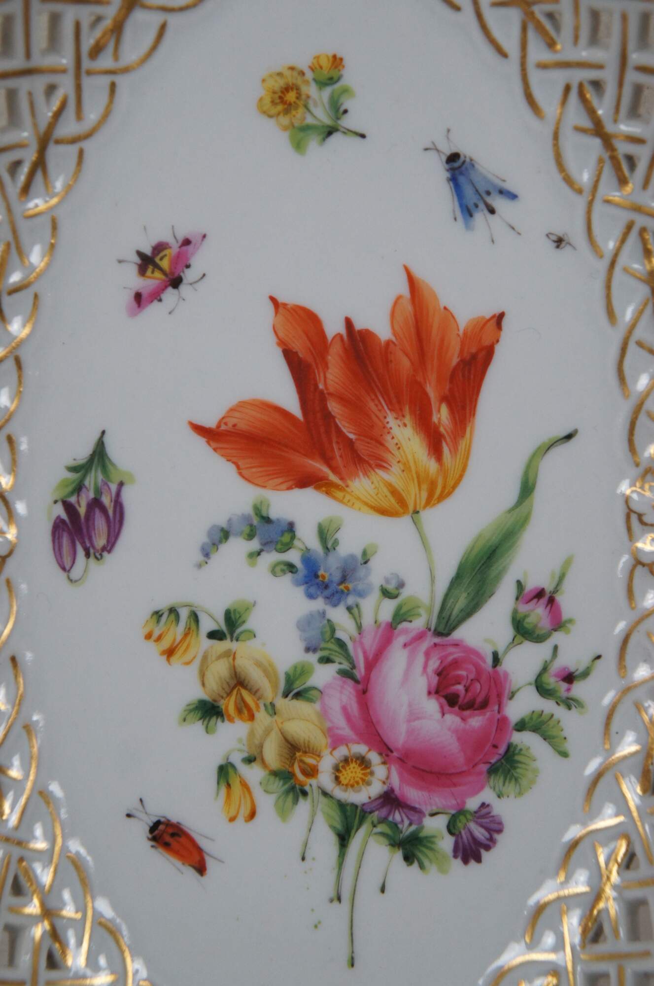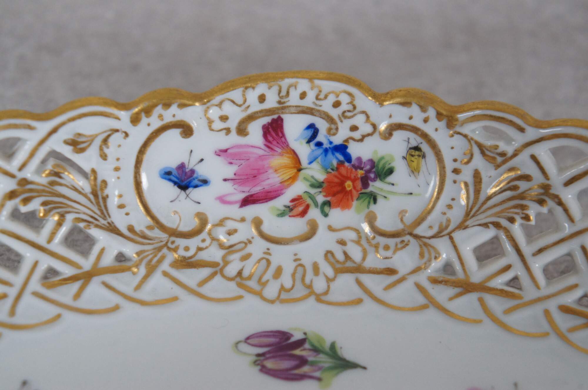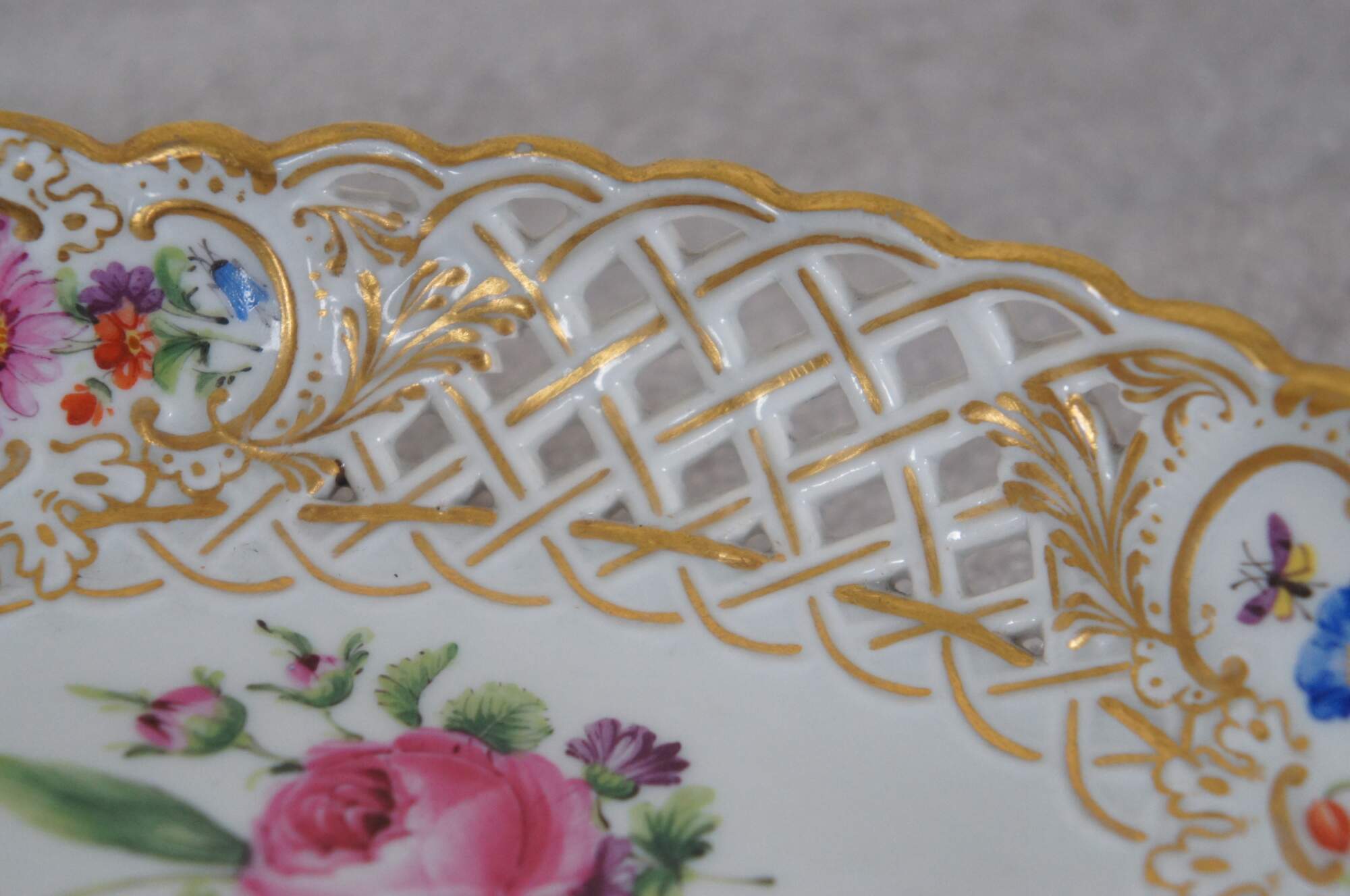 Early 20th century Meissen porcelain dish. Oval form with pierced basket weave sides, scalloped edge, hand painted with gilded details and multicolored sprays of flowers and insects. Incised number 3.