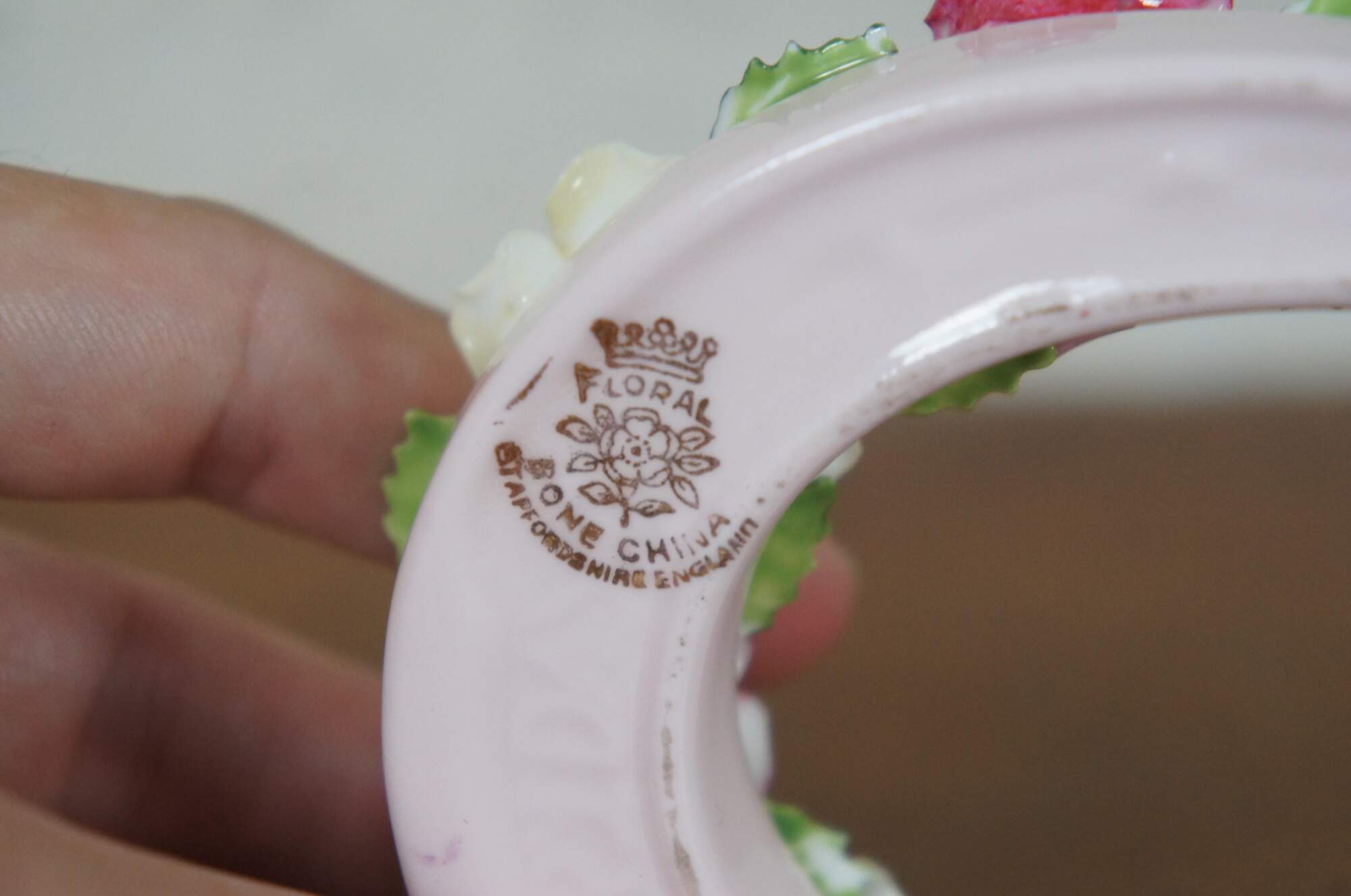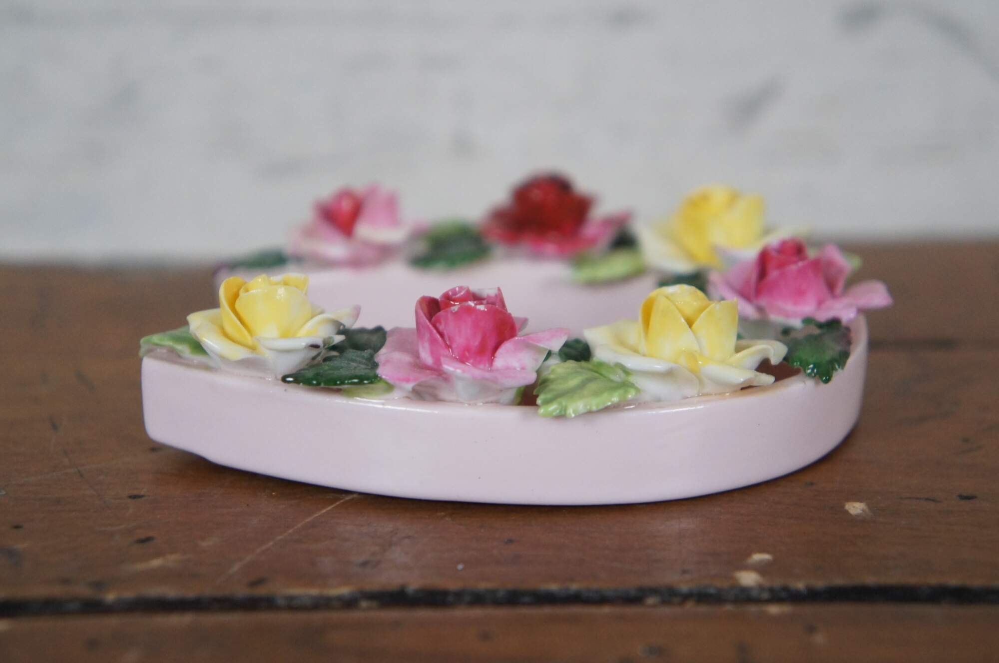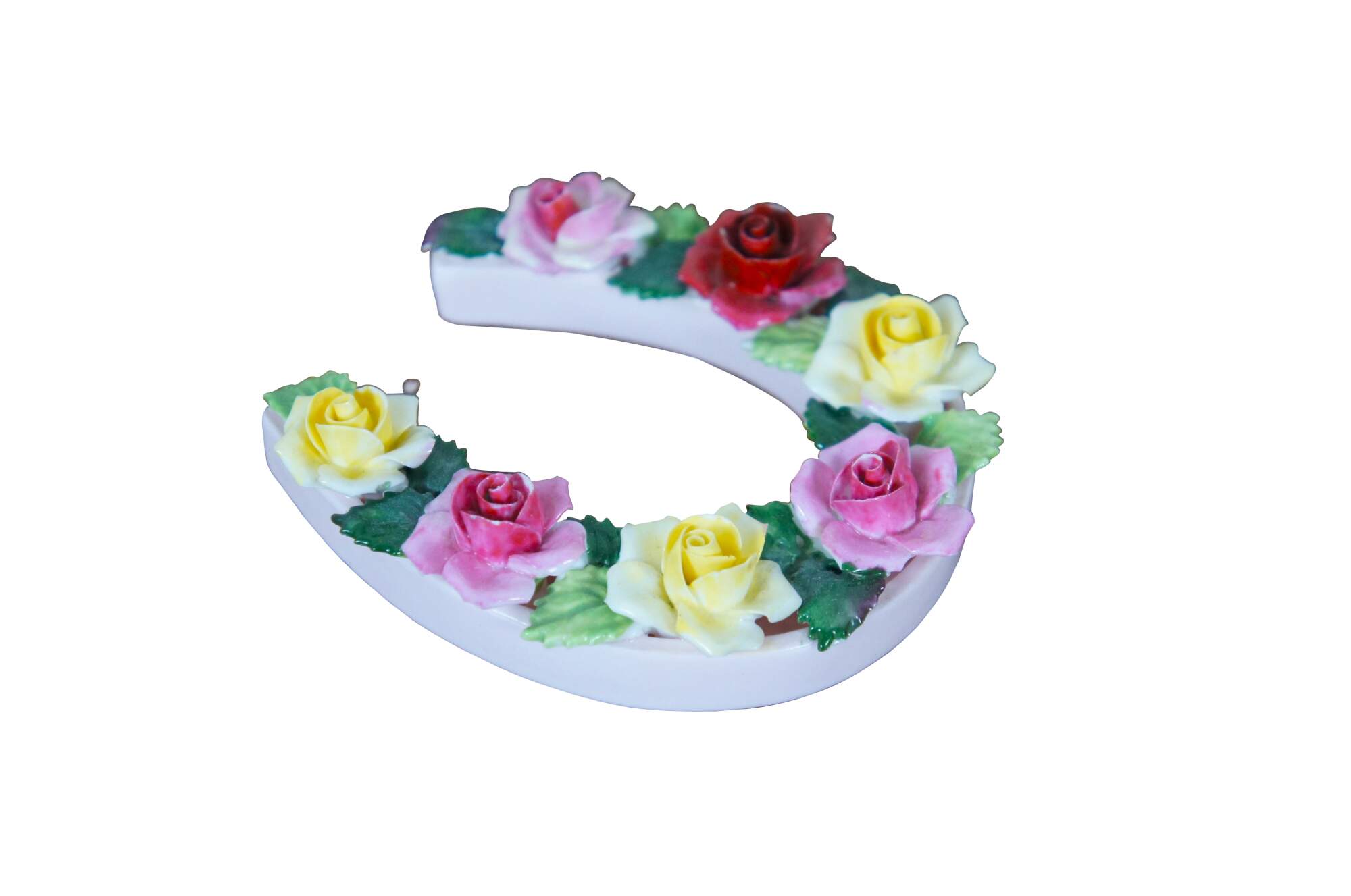 Mid to late 20th century Floral Bone China porcelain figurine / paperweight in the shape of a pink horseshoe decked with yellow, pink and red roses. Raised lettering on back appears to read "Happy Day.