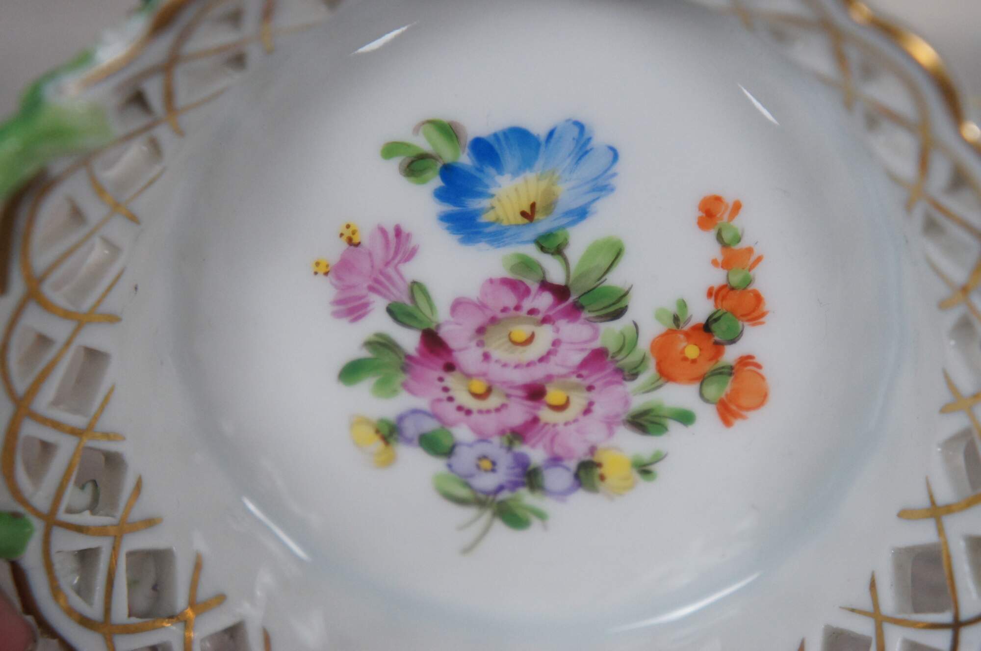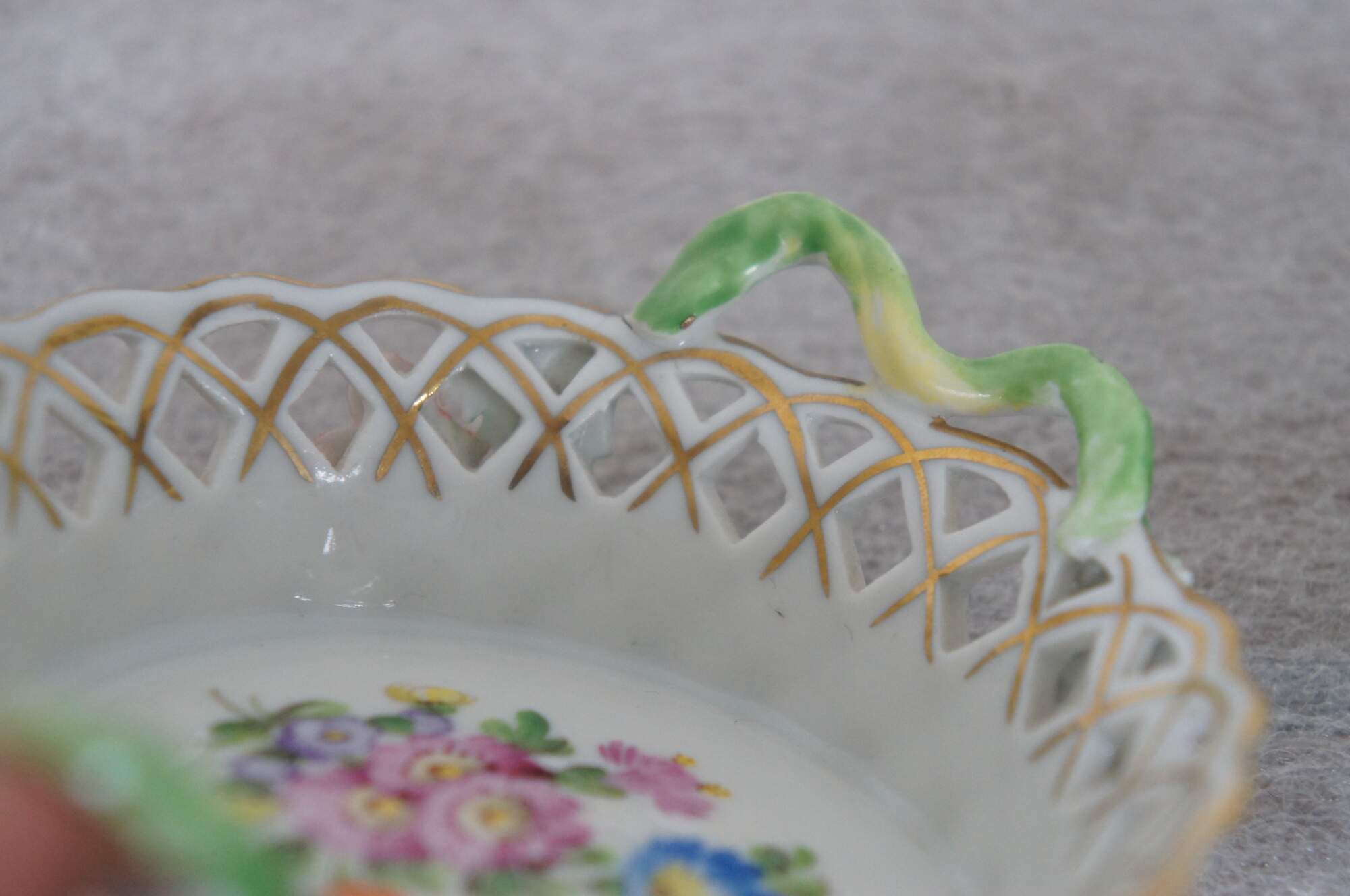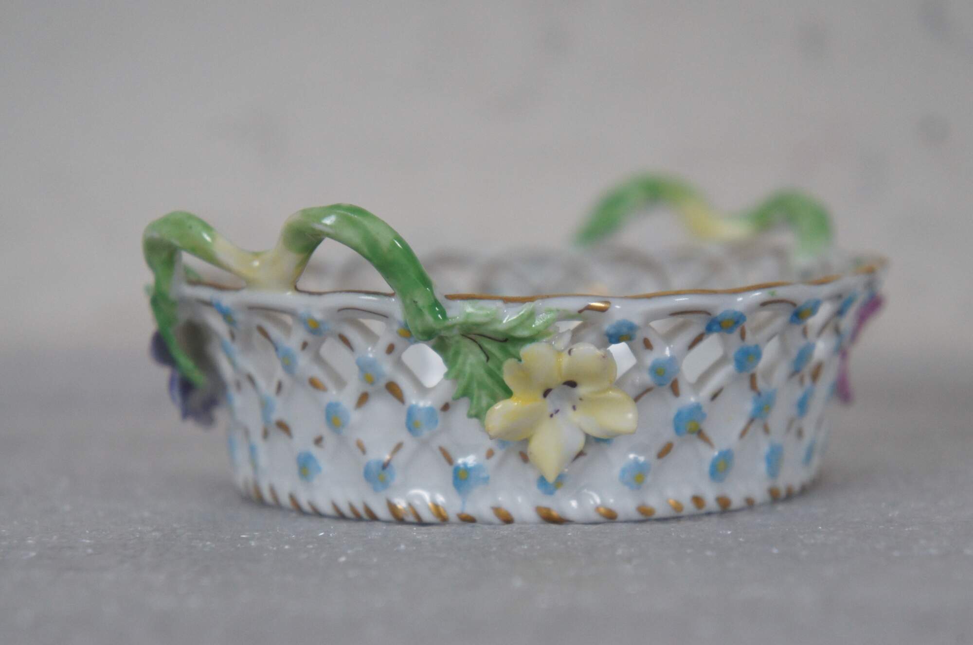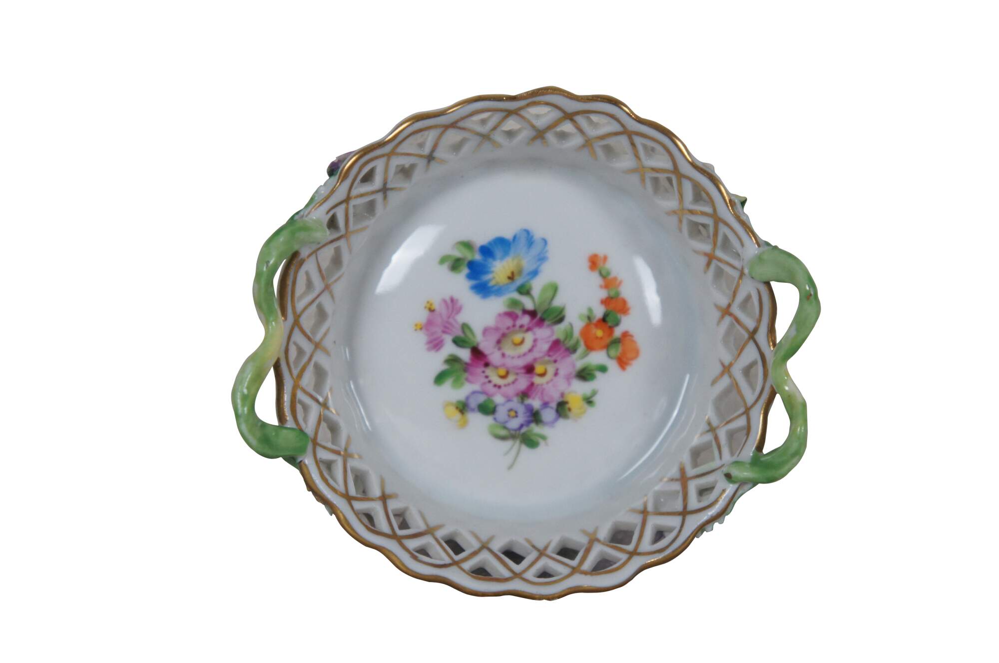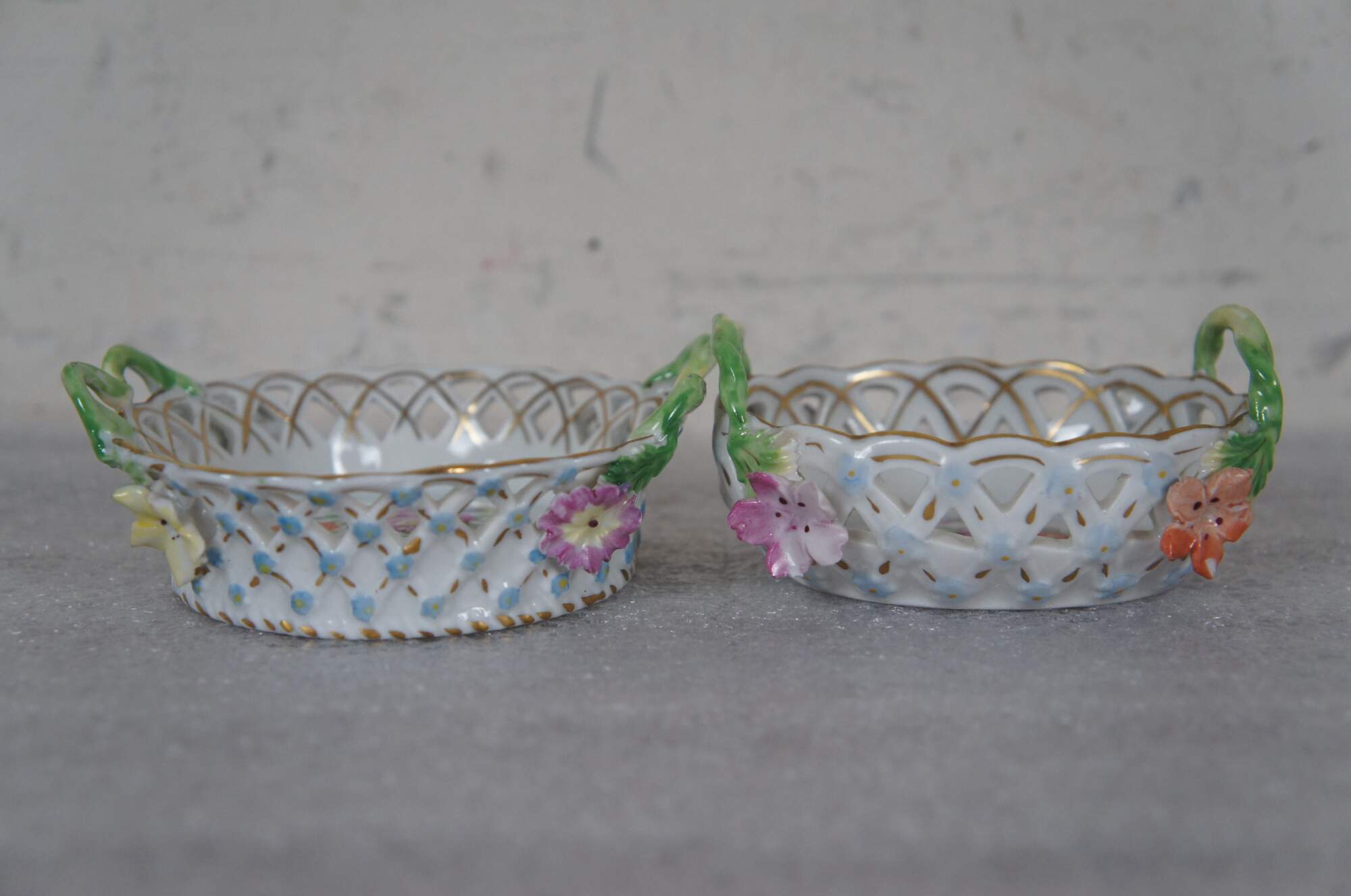 Pair of vintage Dresden Porcelain miniature dishes, one oval and one round, with pierced basketweave sides, twisted branch handles, hand painted with sprays of flowers. One incised 337A.