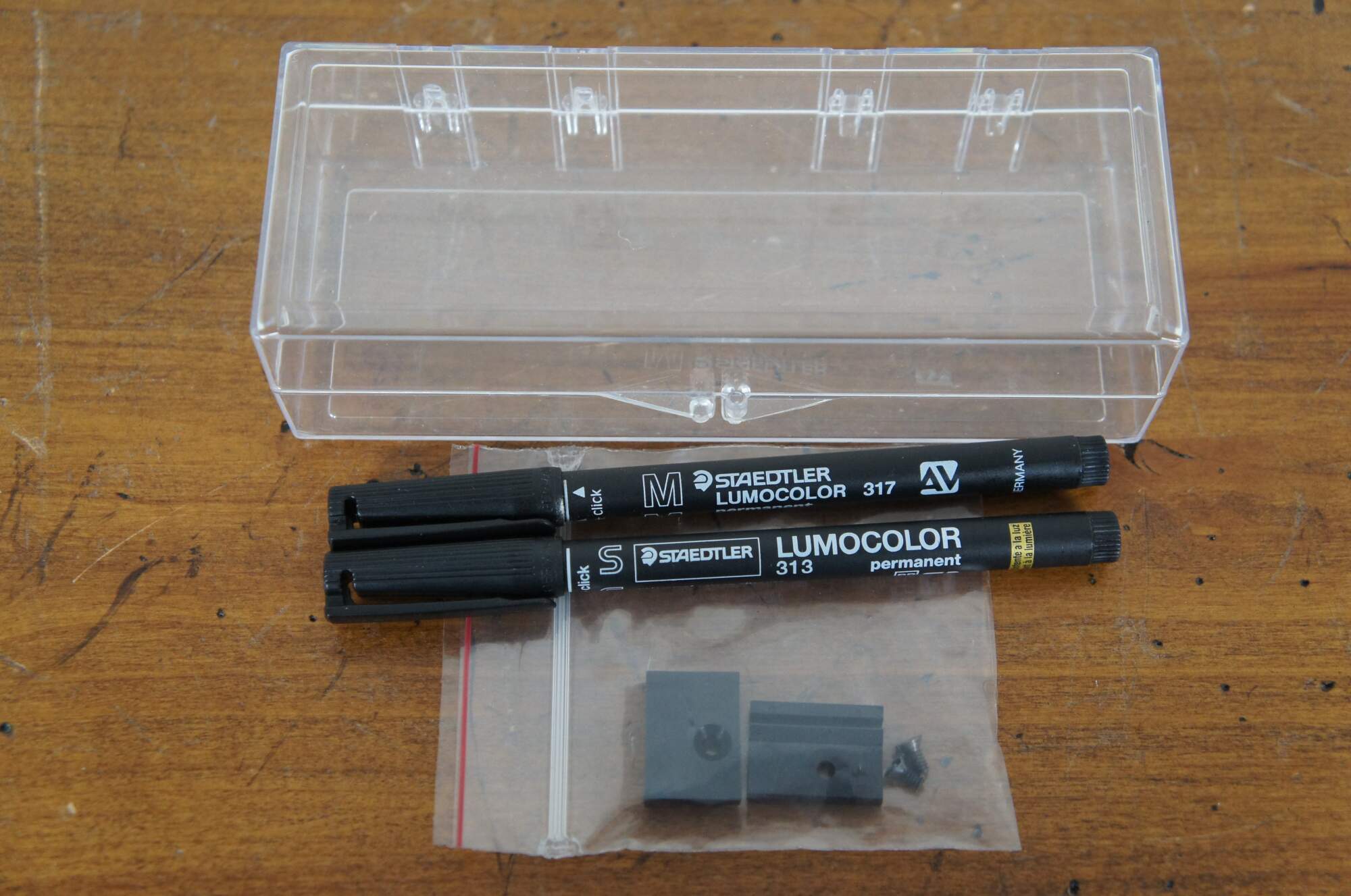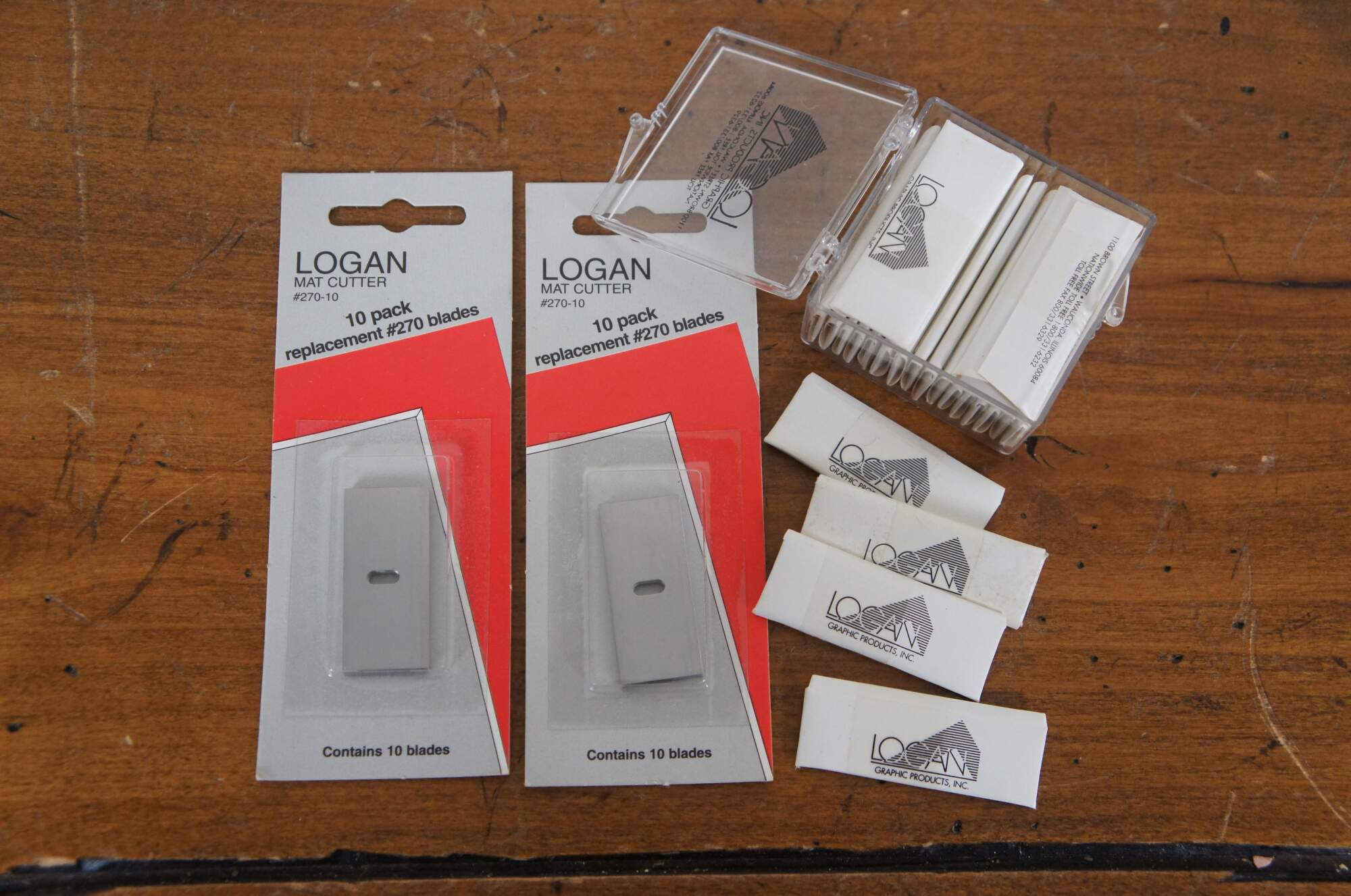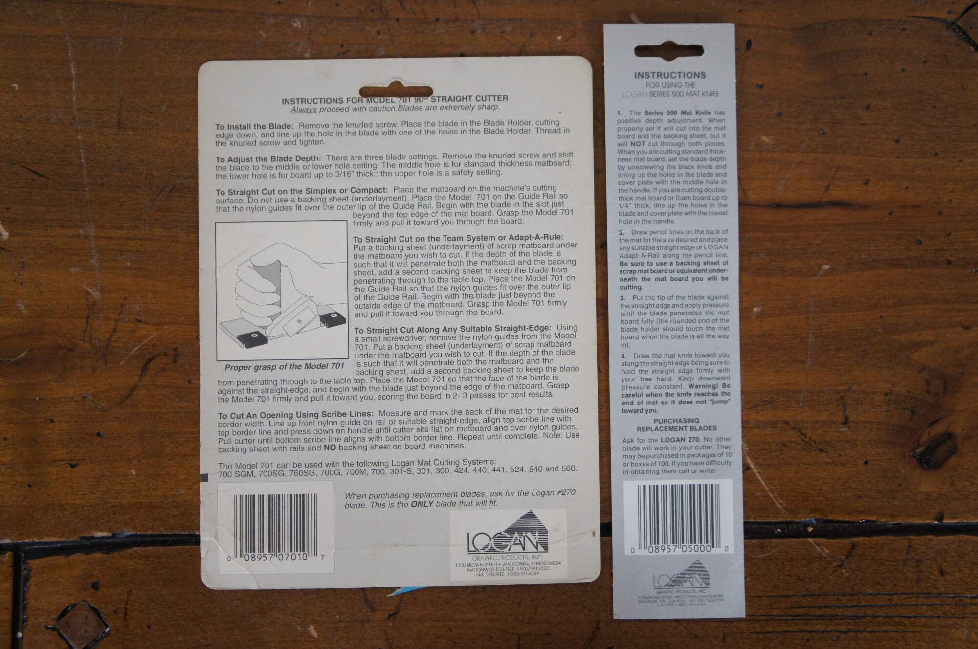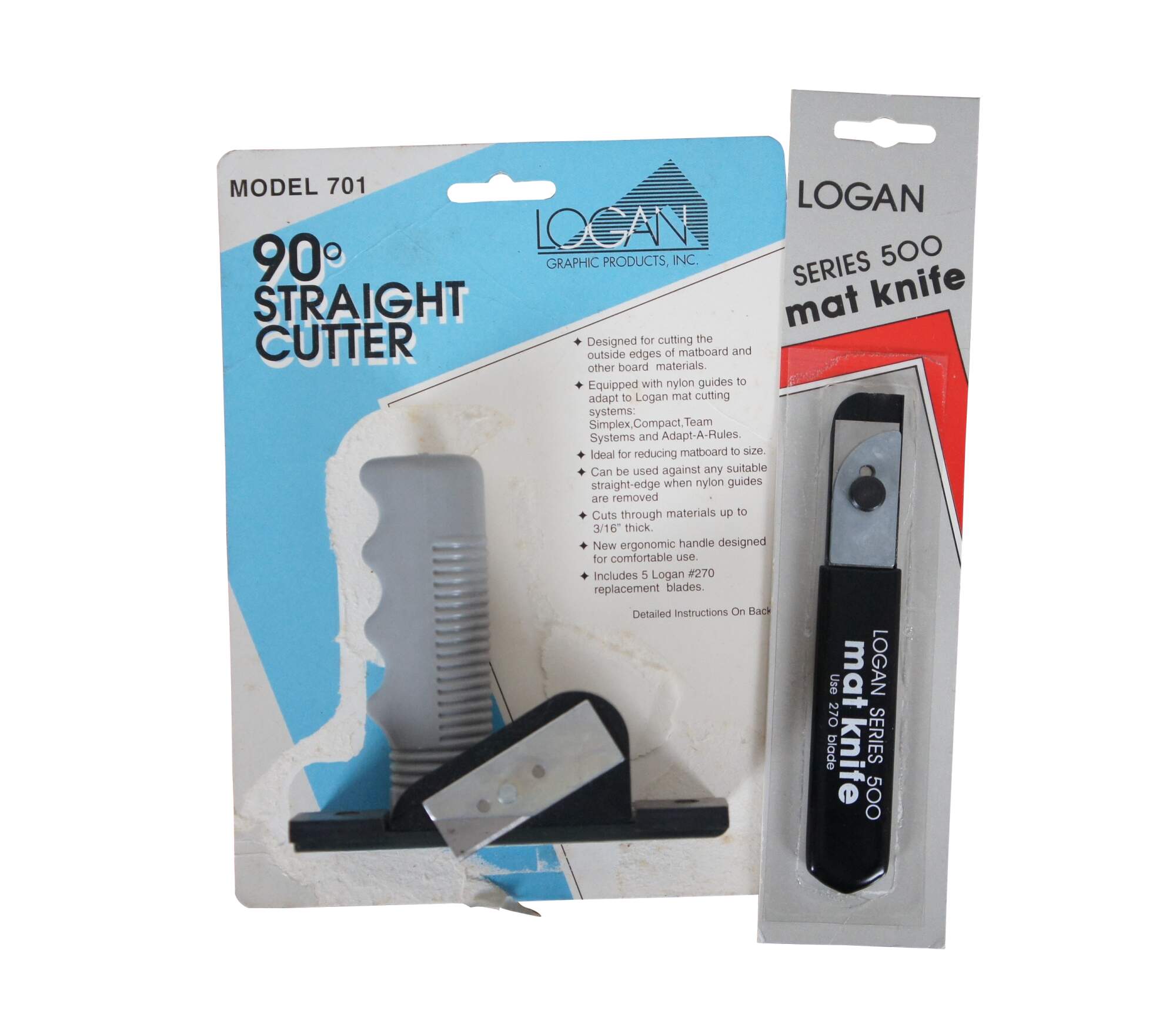 Lot of picture mat cutting tools and instructional book. Logan Graphic Products Inc 90 Degree Straight Cutter, Model 701 and Series 500 Mat Knife. "Basic Mat Cutting" by Vivian Kistler - paperback - Columbia Publishing company, Akron, Ohio - Copyright 1998, 1996, 1995 by Logan Graphic Products Inc - Second Edition - ISBN: 0-938655-45-0. Also included: three packages of #270 replacement blades (approximate quantity 120), plastic box for storage, and two Staedtler Lumocolor Waterproof marking pens, 317 and 313.