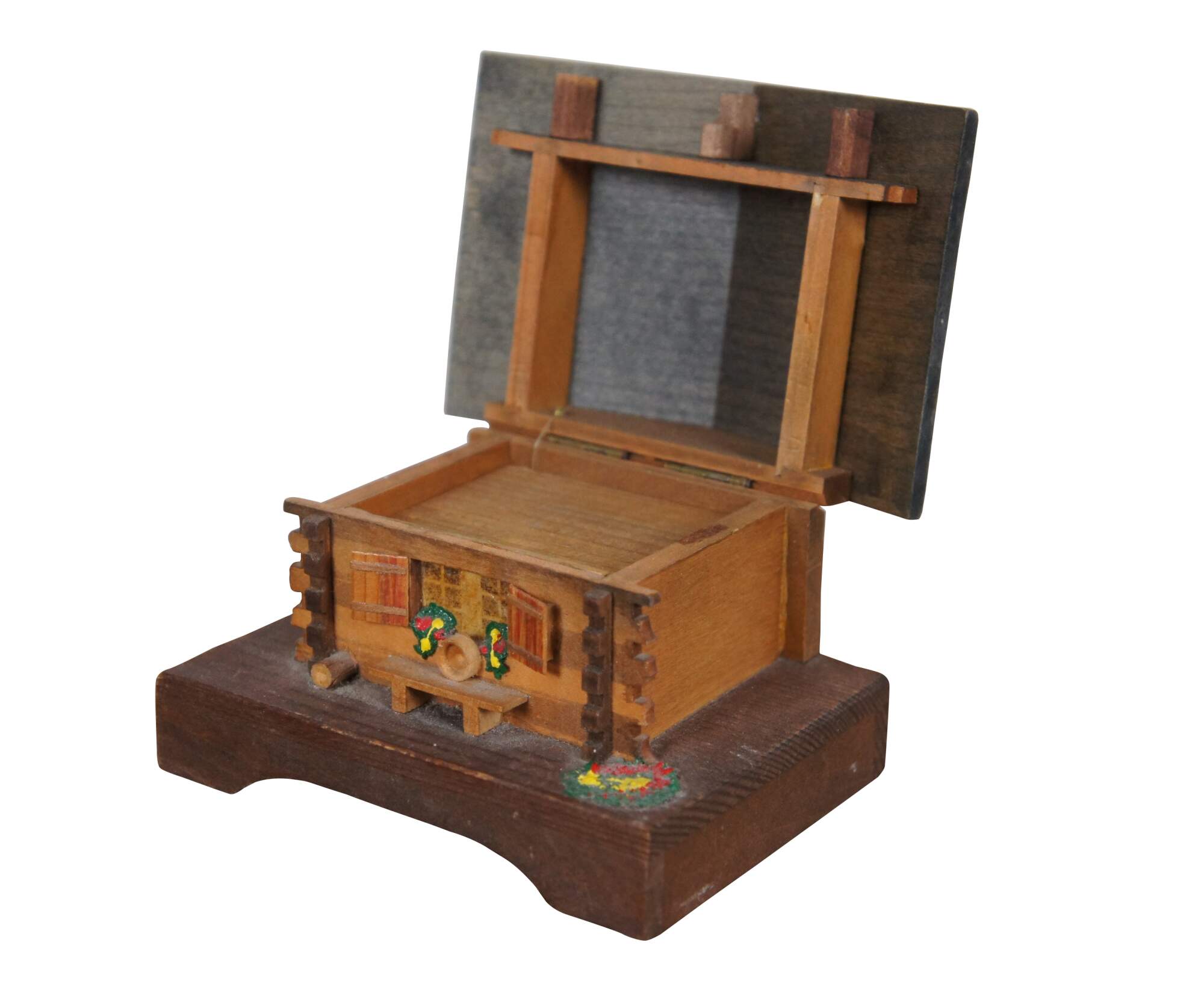 Mid century wooden music box / trinket box in the shape of a quaint Swiss chalet or mountain cottage / house. Played "Torna a Surriento." Made in Switzerland.