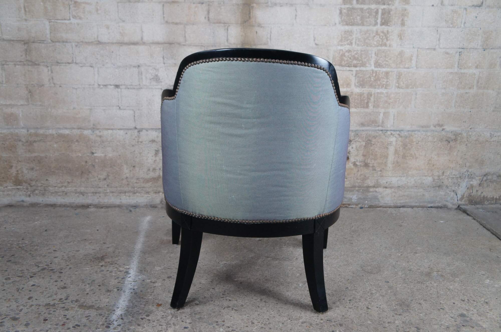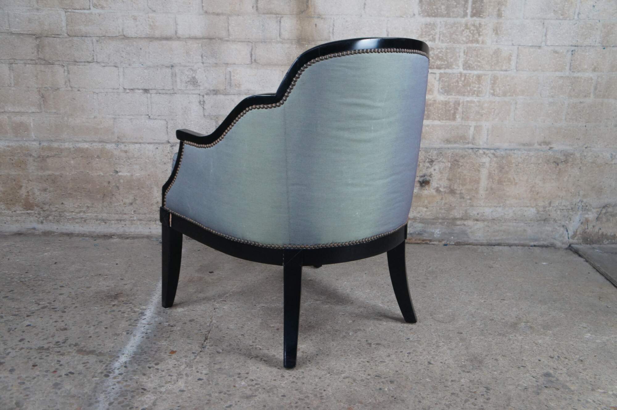 Two vintage Grafton Furniture club / lounge / library accent chairs featuring art deco style ebonized frame with scalloped / sloped arm design and nailhead trim.