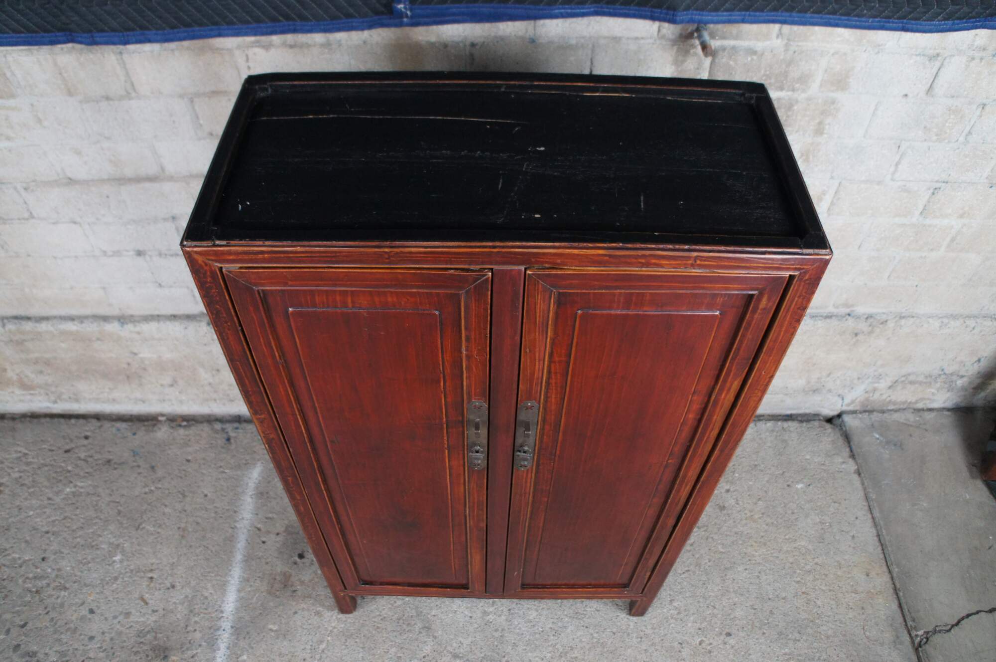 Vintage Chinese Chinoiserie Ming style wedding cabinet / cupboard / armoire / wardrobe. Made of Elm featuring a dark red / brown lacquered finish with two doors that open to reveal three shelves / storage areas and two drawers.