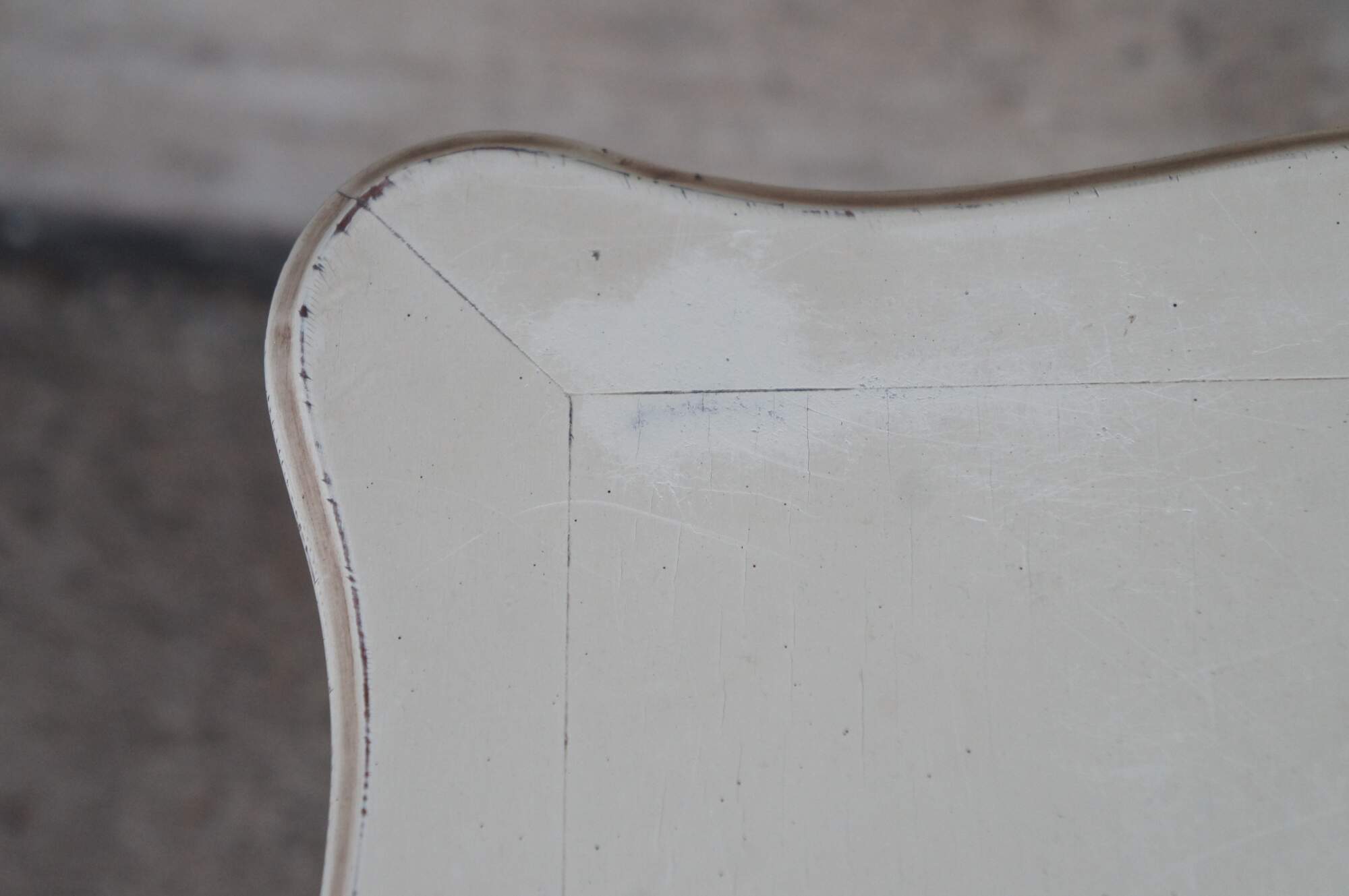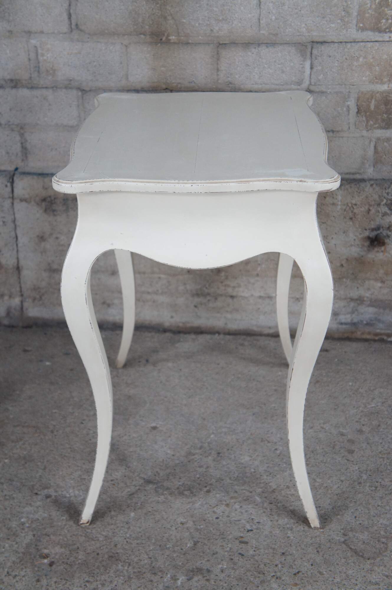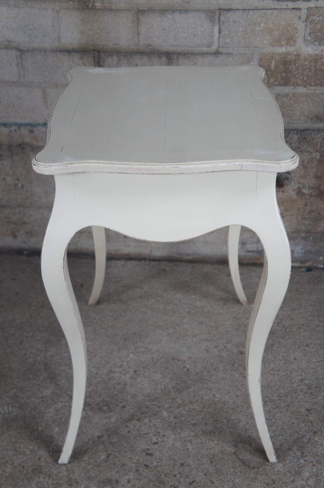 French Victorian style desk / console / table featuring chic white painted exterior with scalloped serpentine form and one drawer.