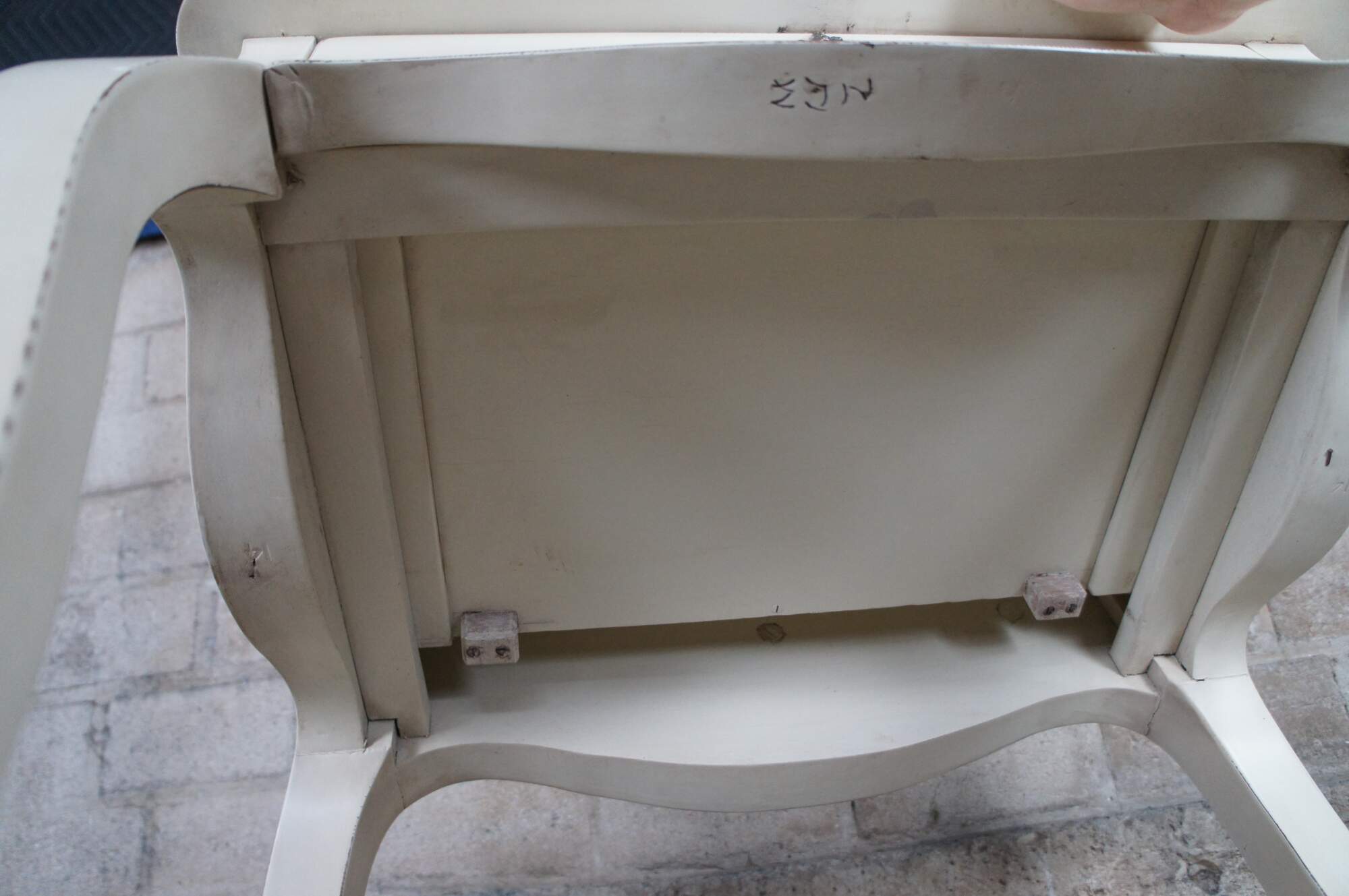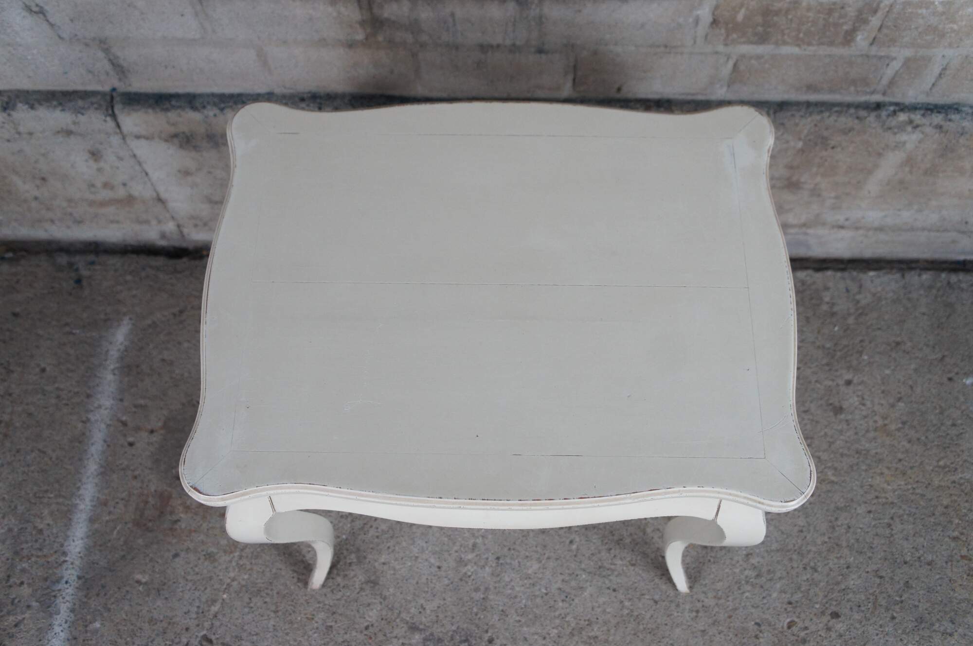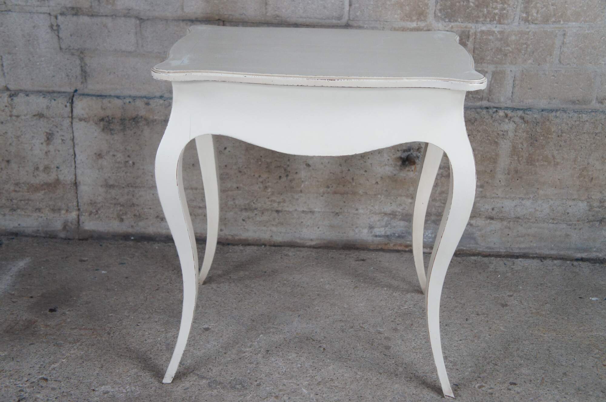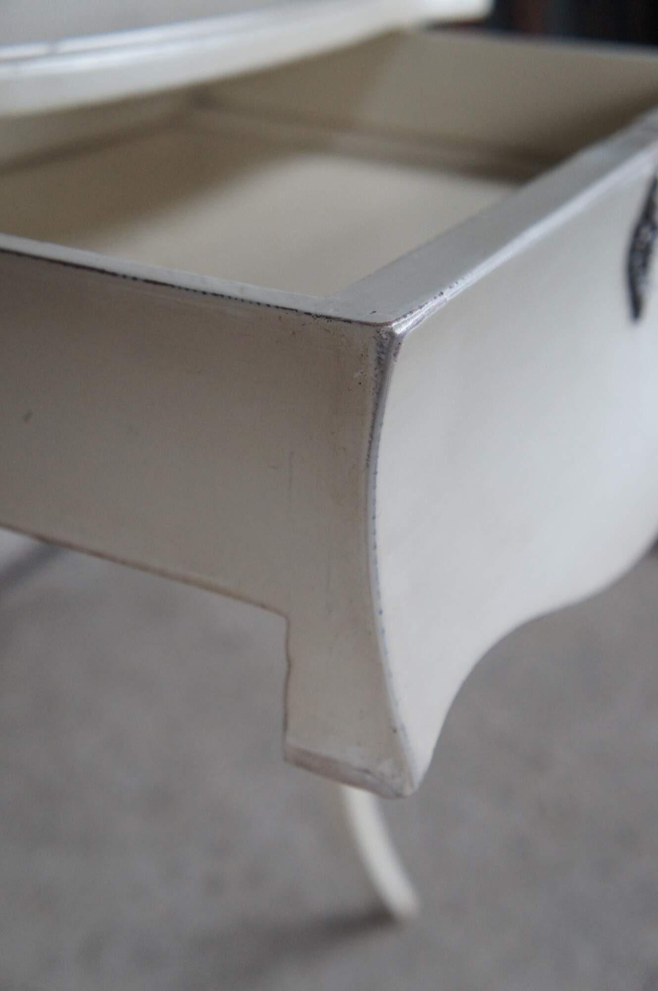 French Victorian style desk / console / table featuring chic white painted exterior with scalloped serpentine form and one drawer.