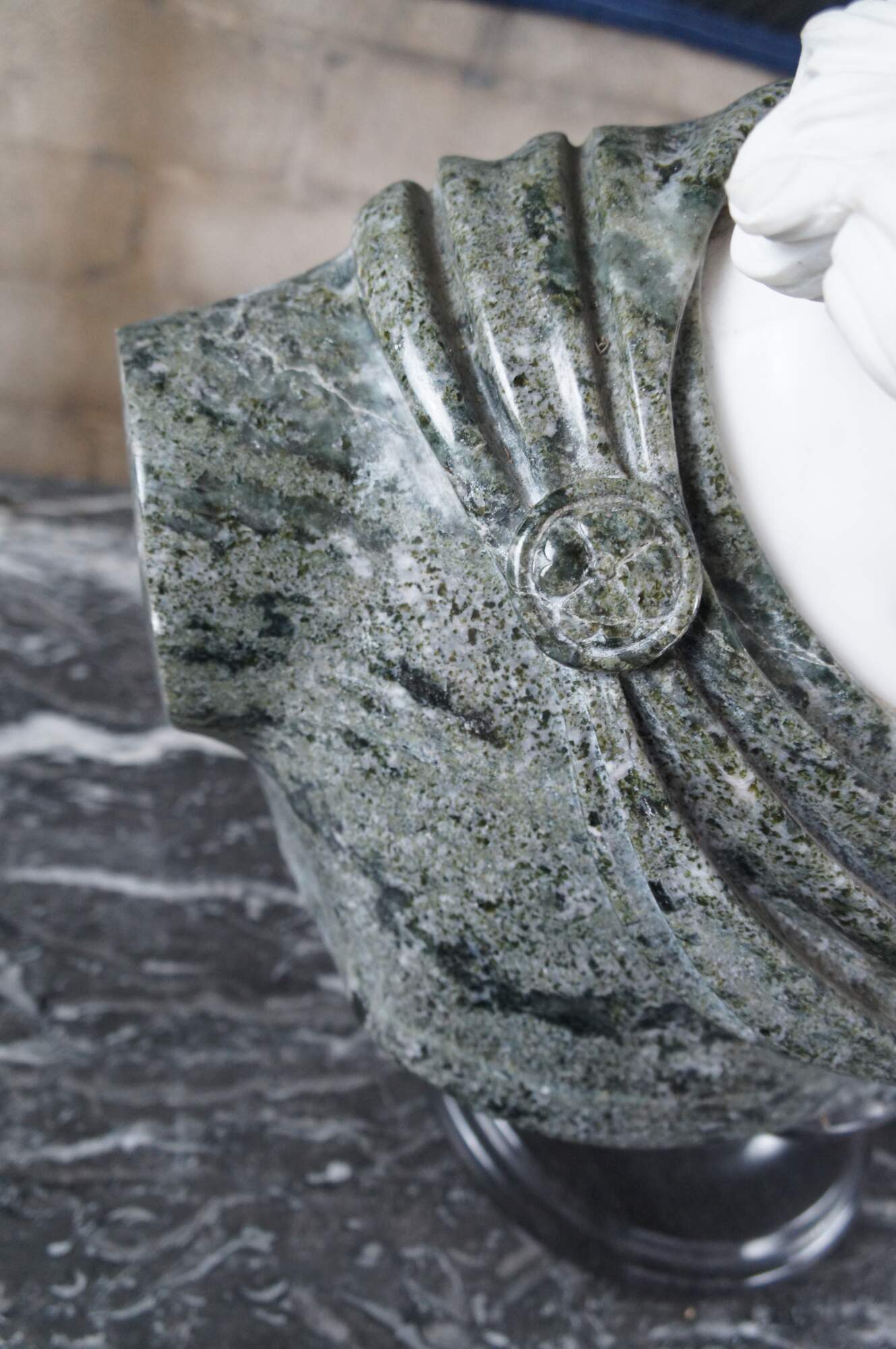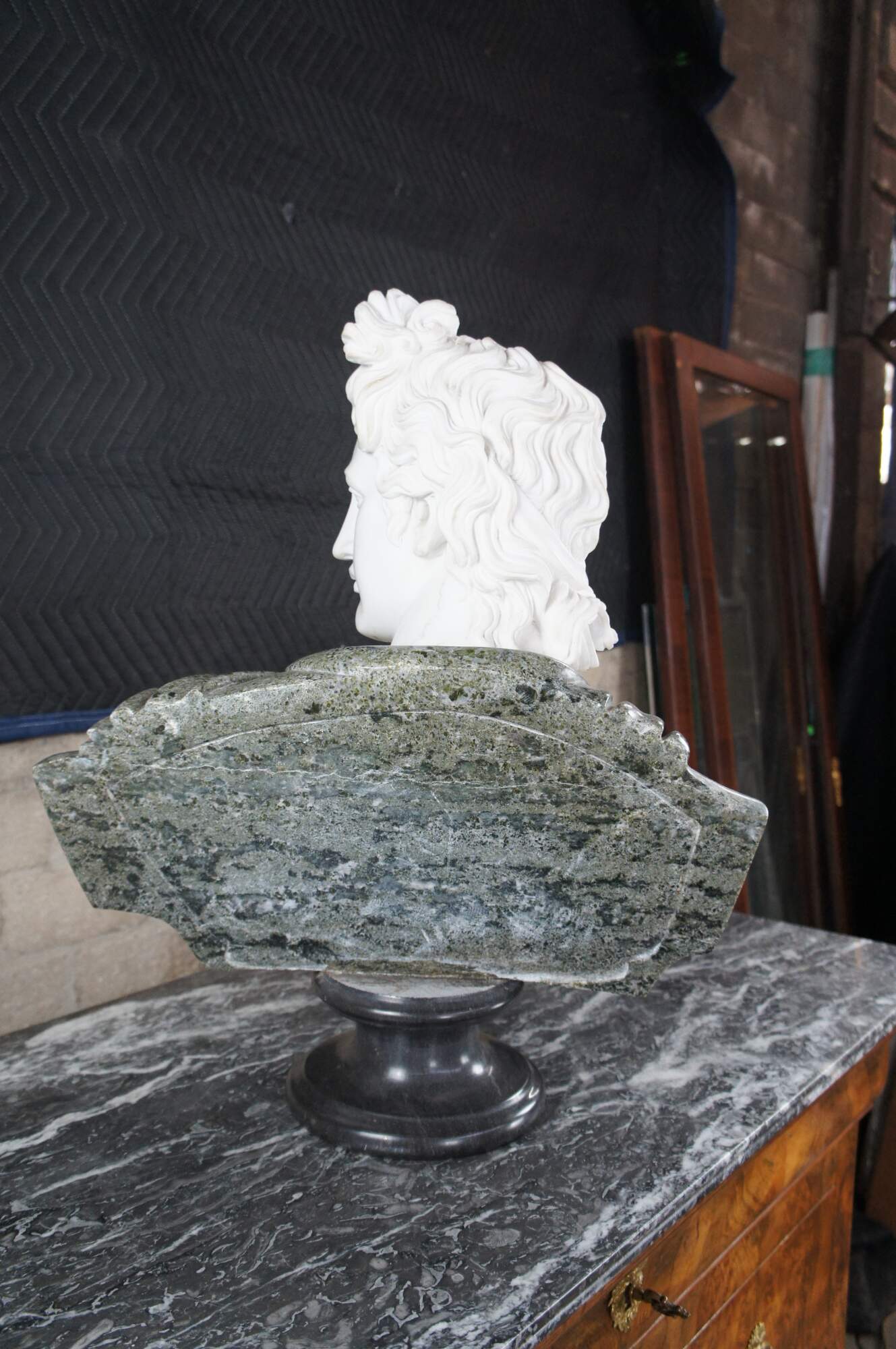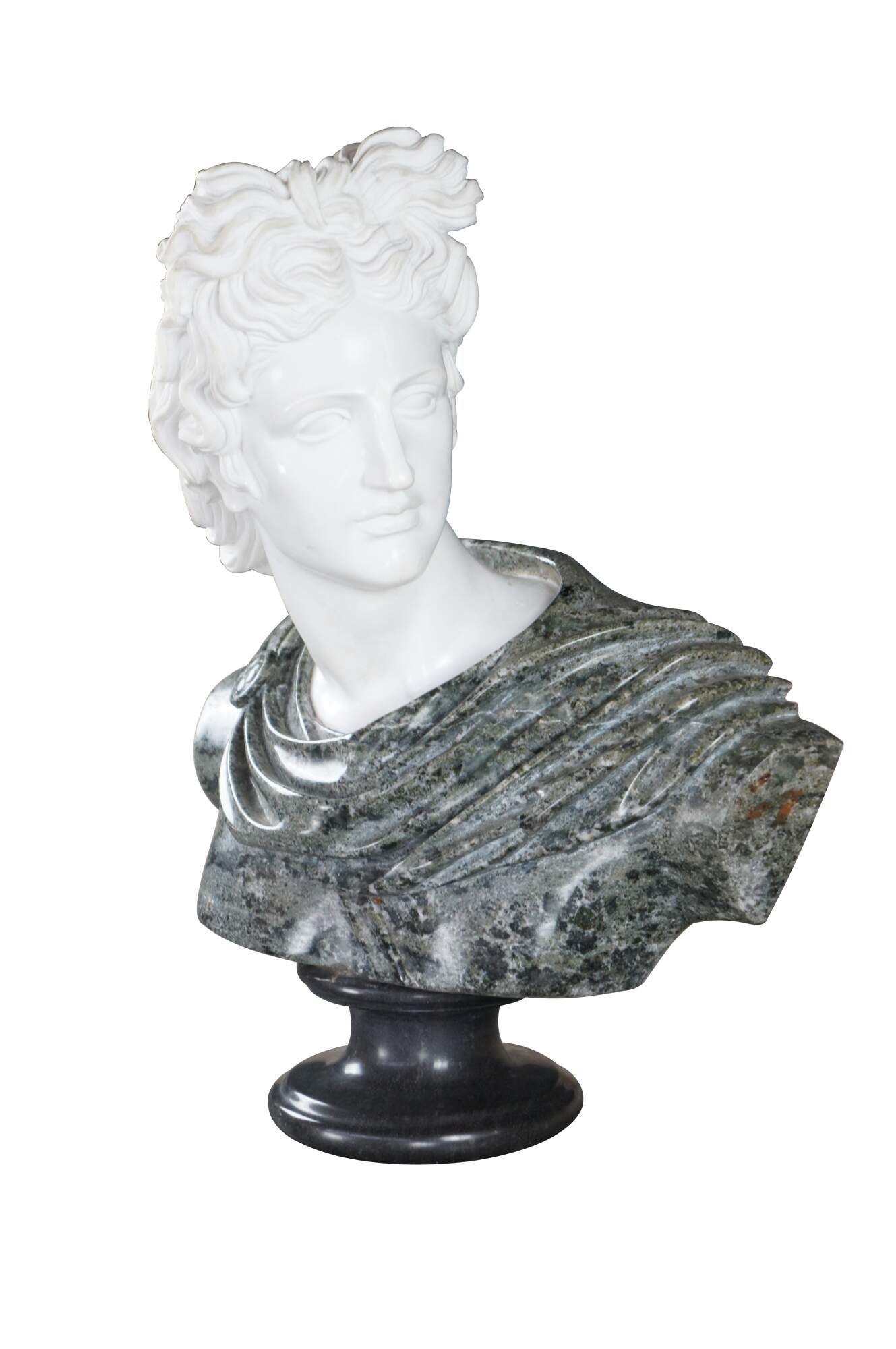 A carved two-toned marble bust depicting the image of Apollo with draped garb details. Mounted to a round tapered marble plinth. circa 20th century. Very heavy and stately. Made in Italy. Perfect for display on a table, bookcase or stand.