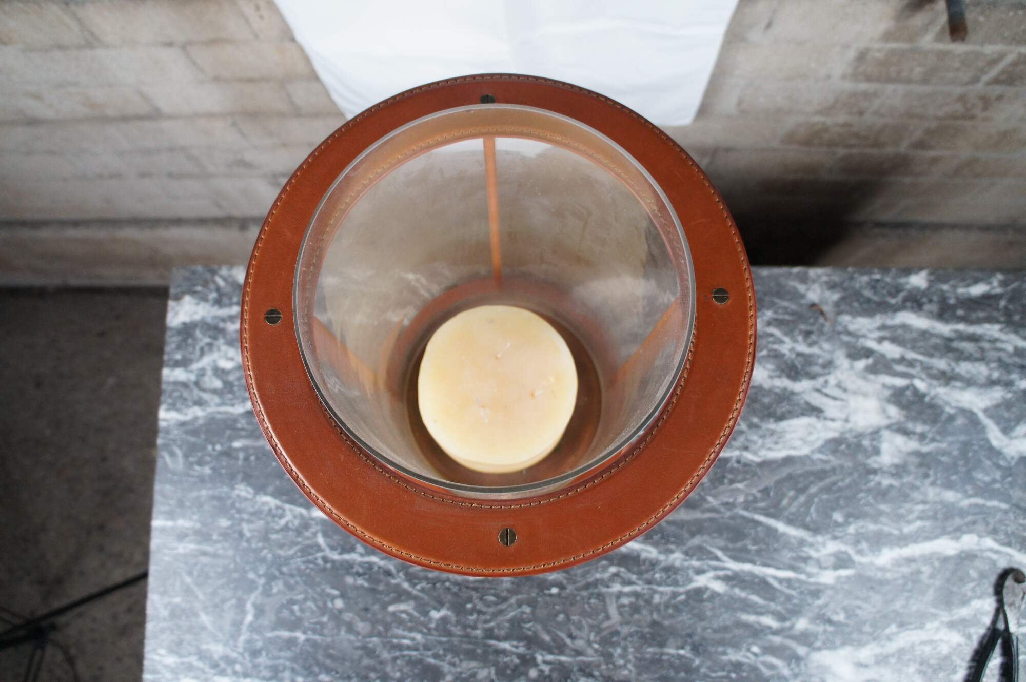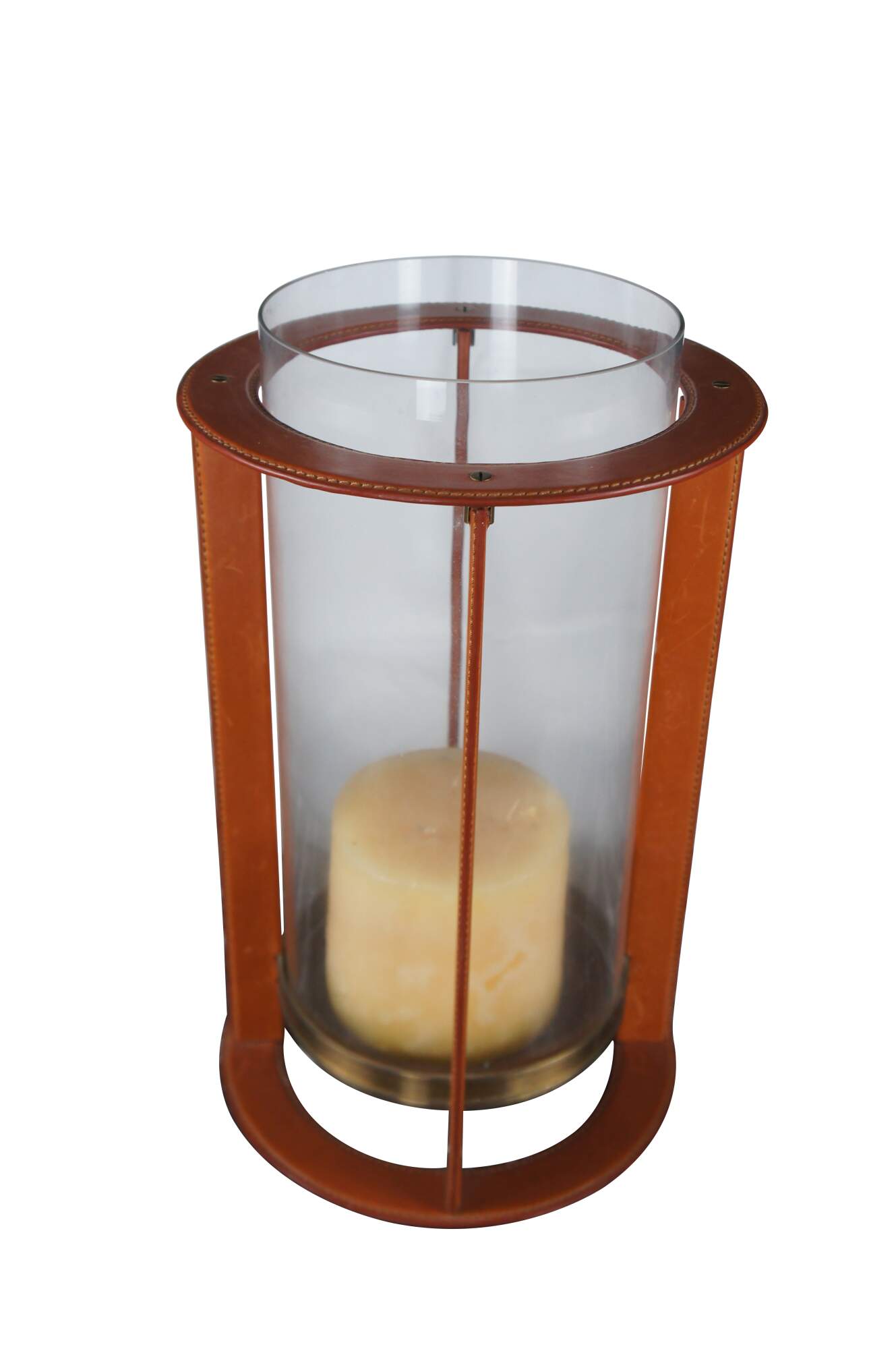 Glass and patinated brass hurricanes, these pieces are no longer in production and very unique. The sculptural hurricane candleholders are part of the timeless home collection by Ralph Lauren. Constructed in saddle leather, patinated brass and glass. The shape of these models is perfectly classic and timeless. Ideal for placement on side tables in a living room, or in a dining room, as a centerpiece.