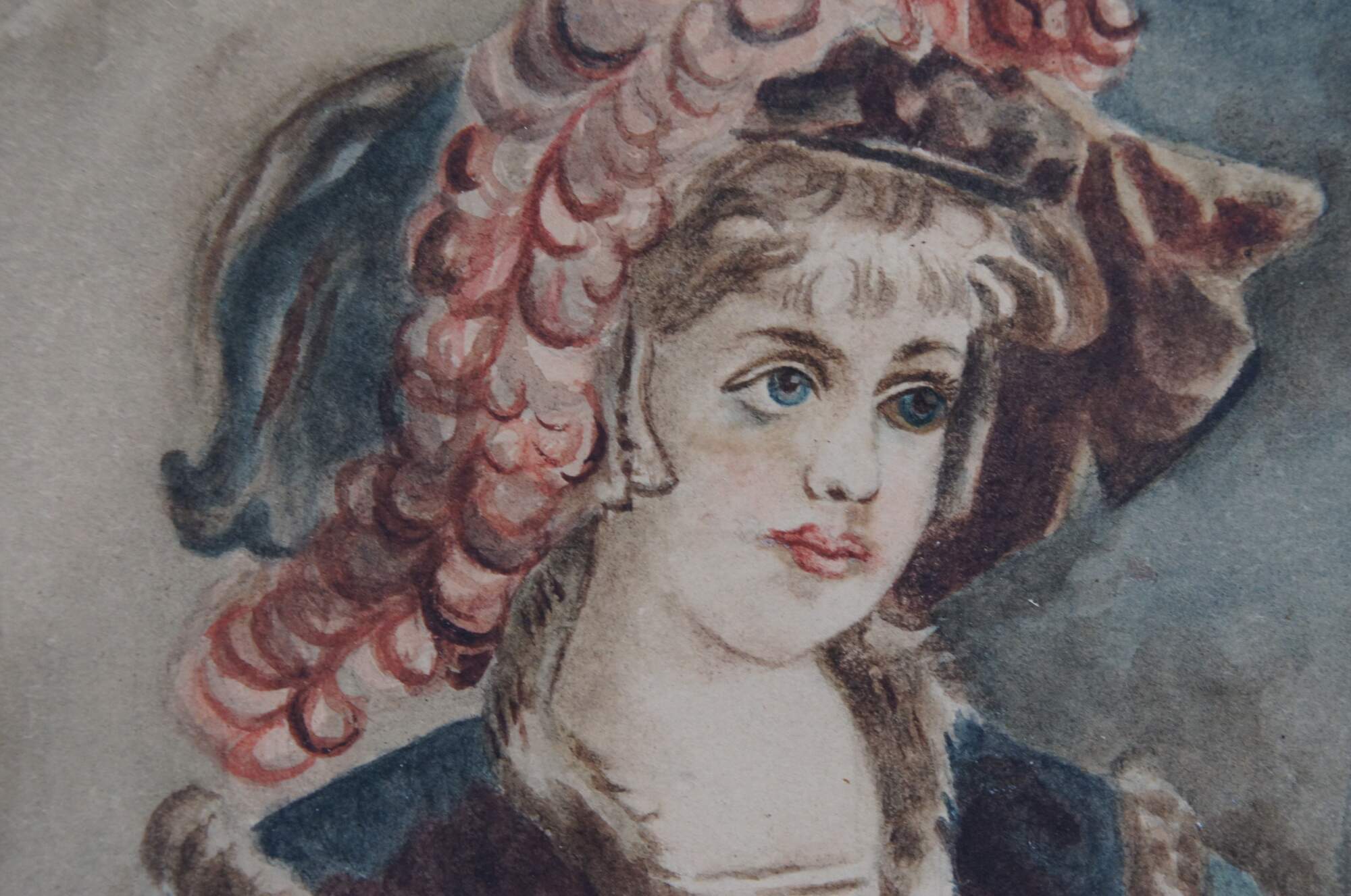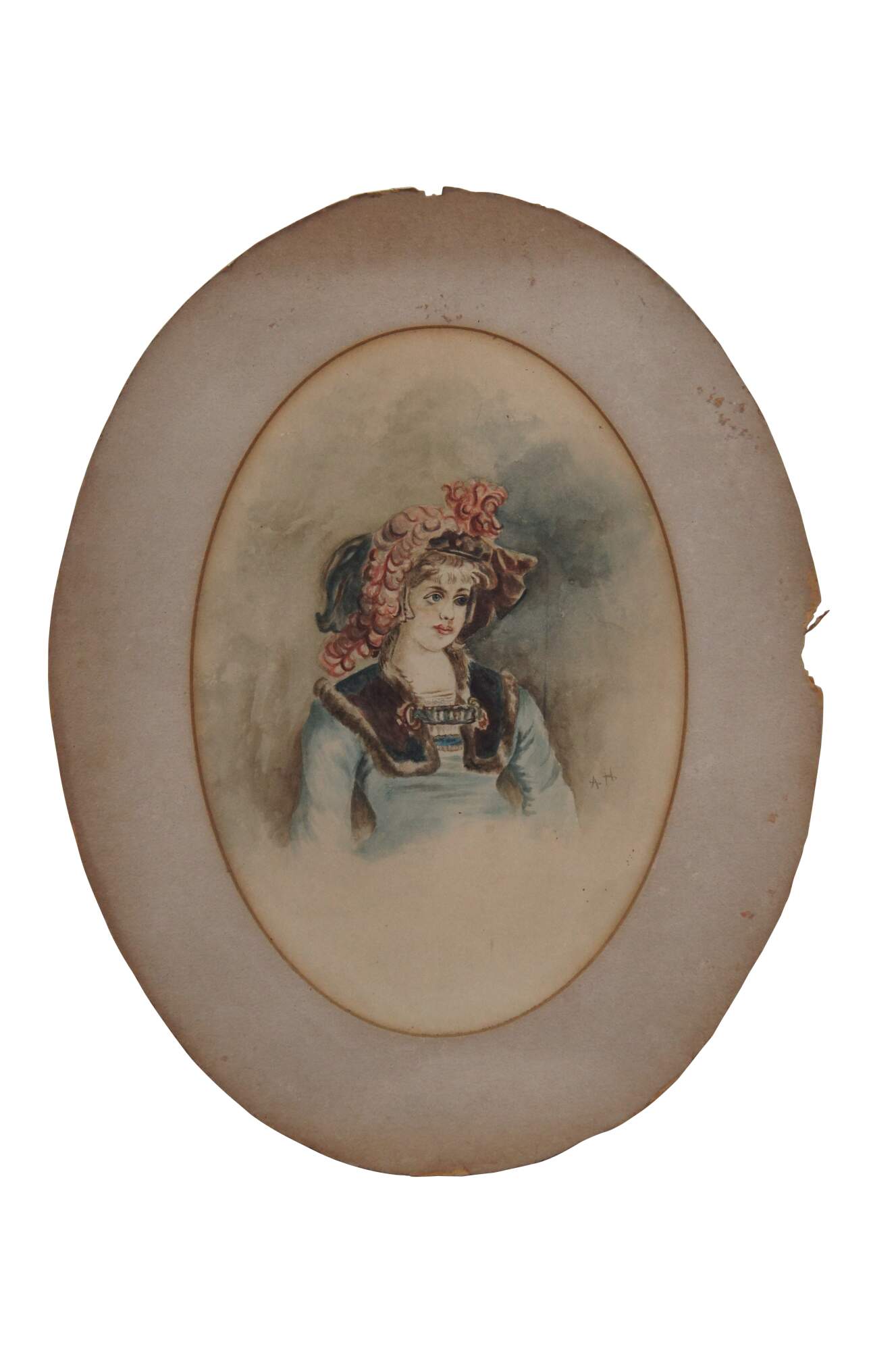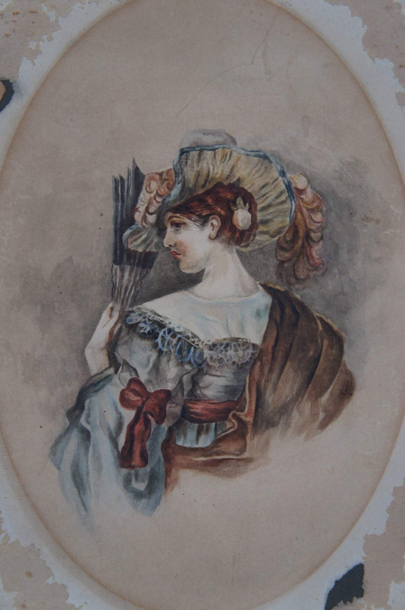 Antique circa 1912 folk art oval watercolor on paper portrait paintings, showing a woman and a girl in elaborate Victorian dress. Girl signed A.H. (A.S.H) in lower right and white mat.