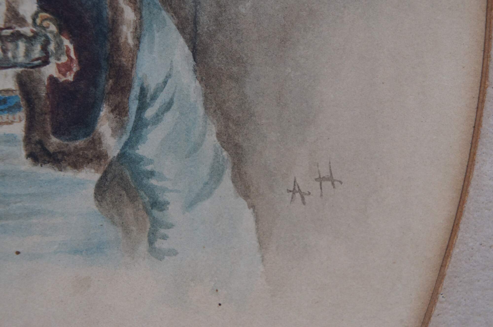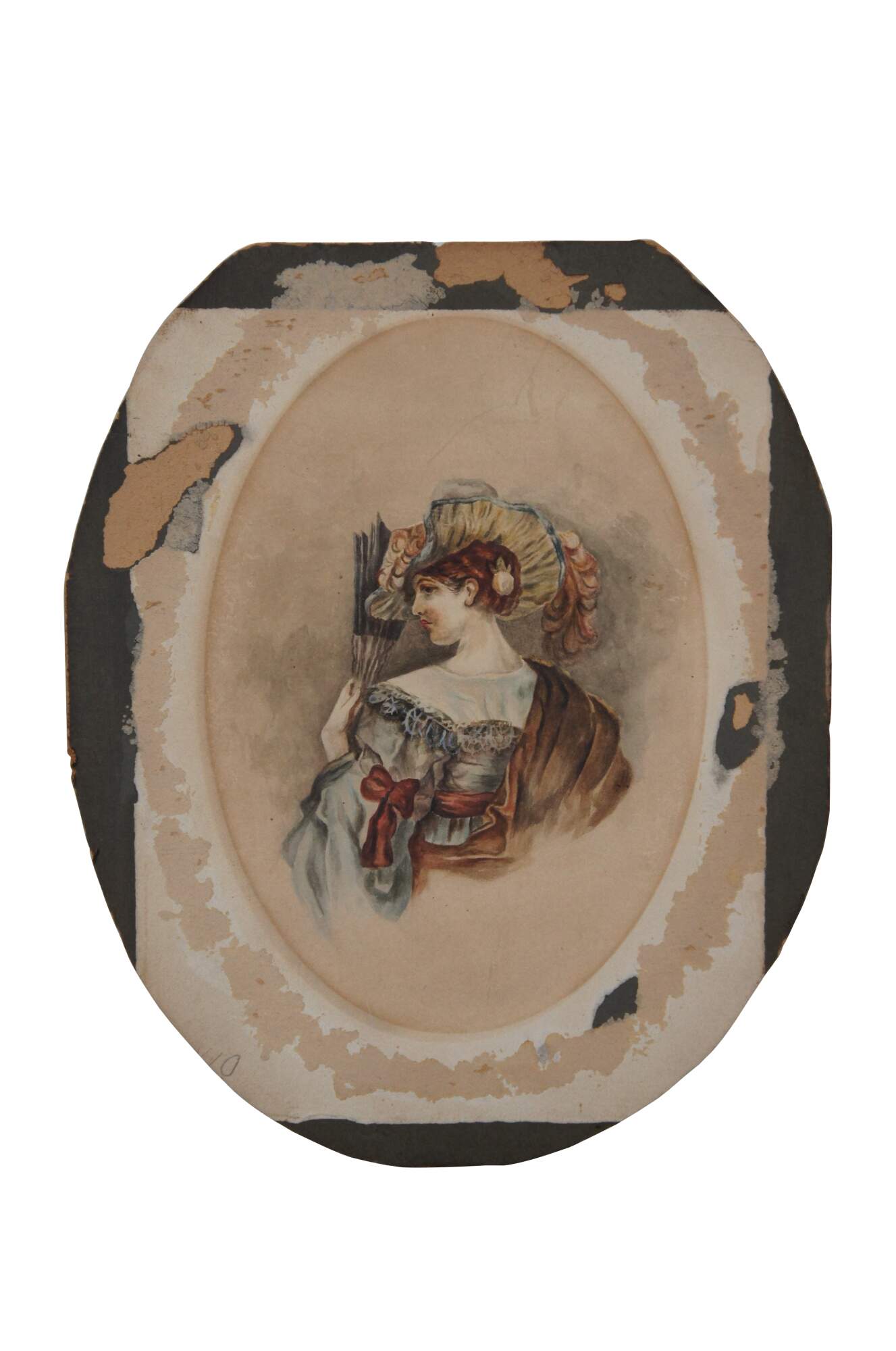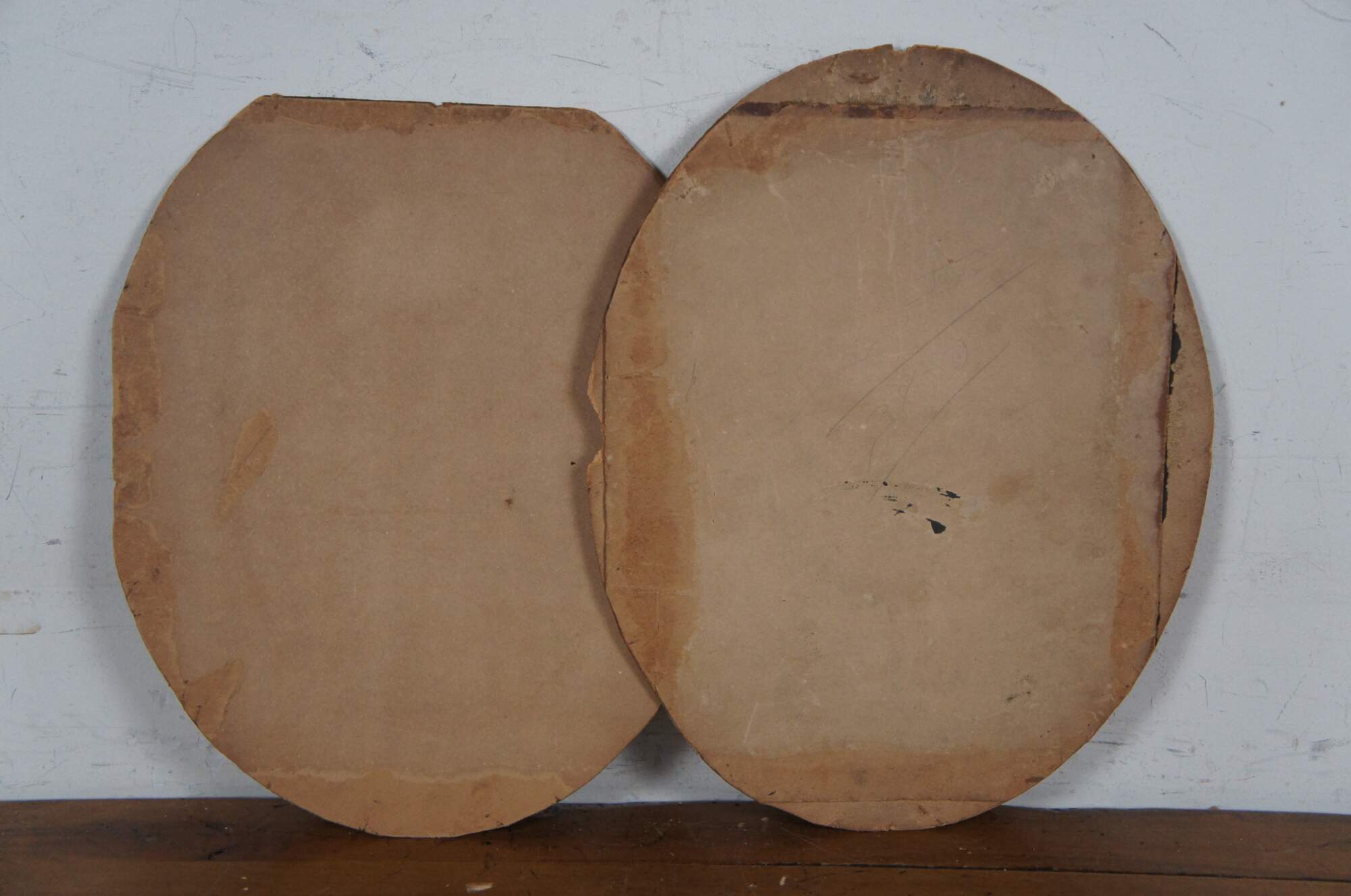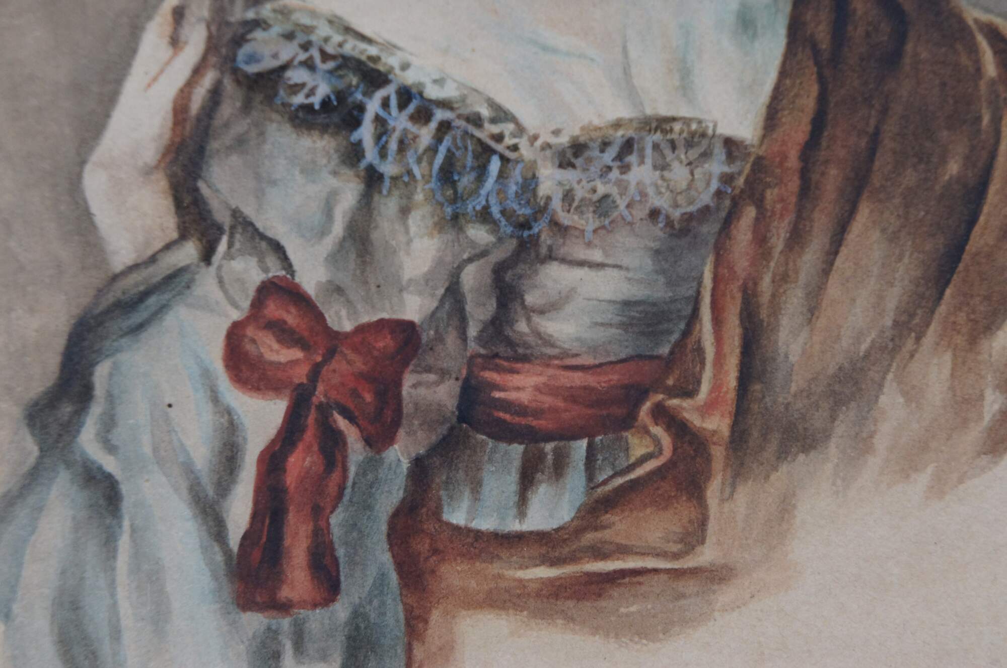 Antique circa 1912 folk art oval watercolor on paper portrait paintings, showing a woman and a girl in elaborate Victorian dress. Girl signed A.H. (A.S.H) in lower right and white mat.