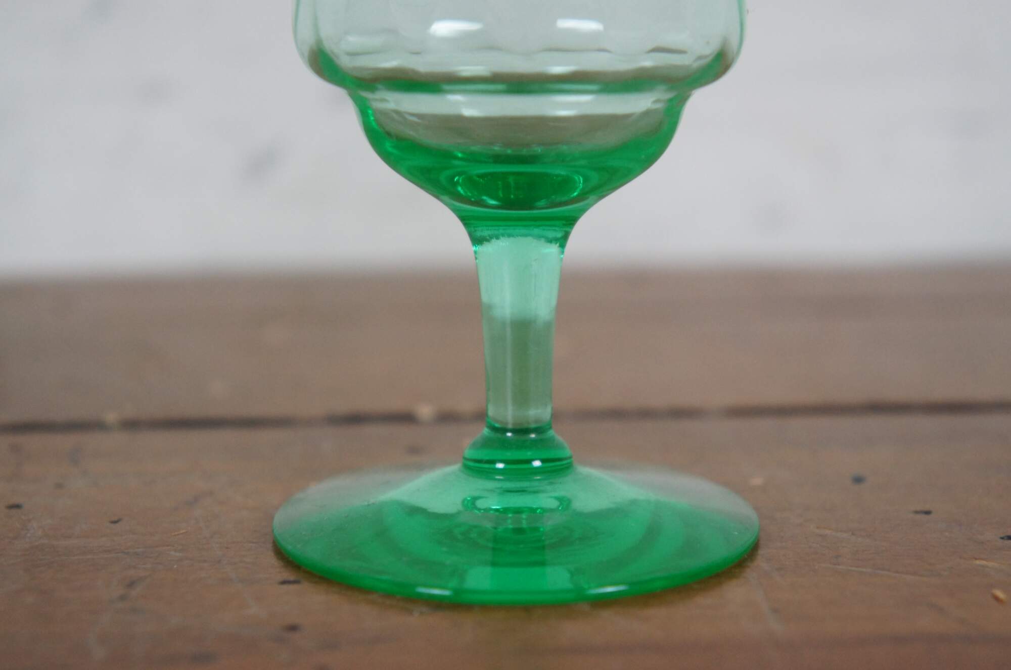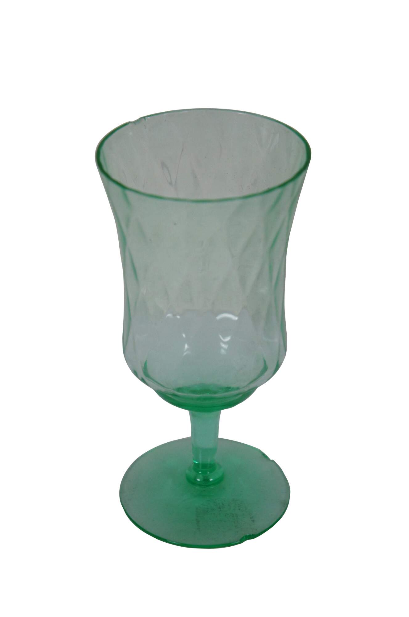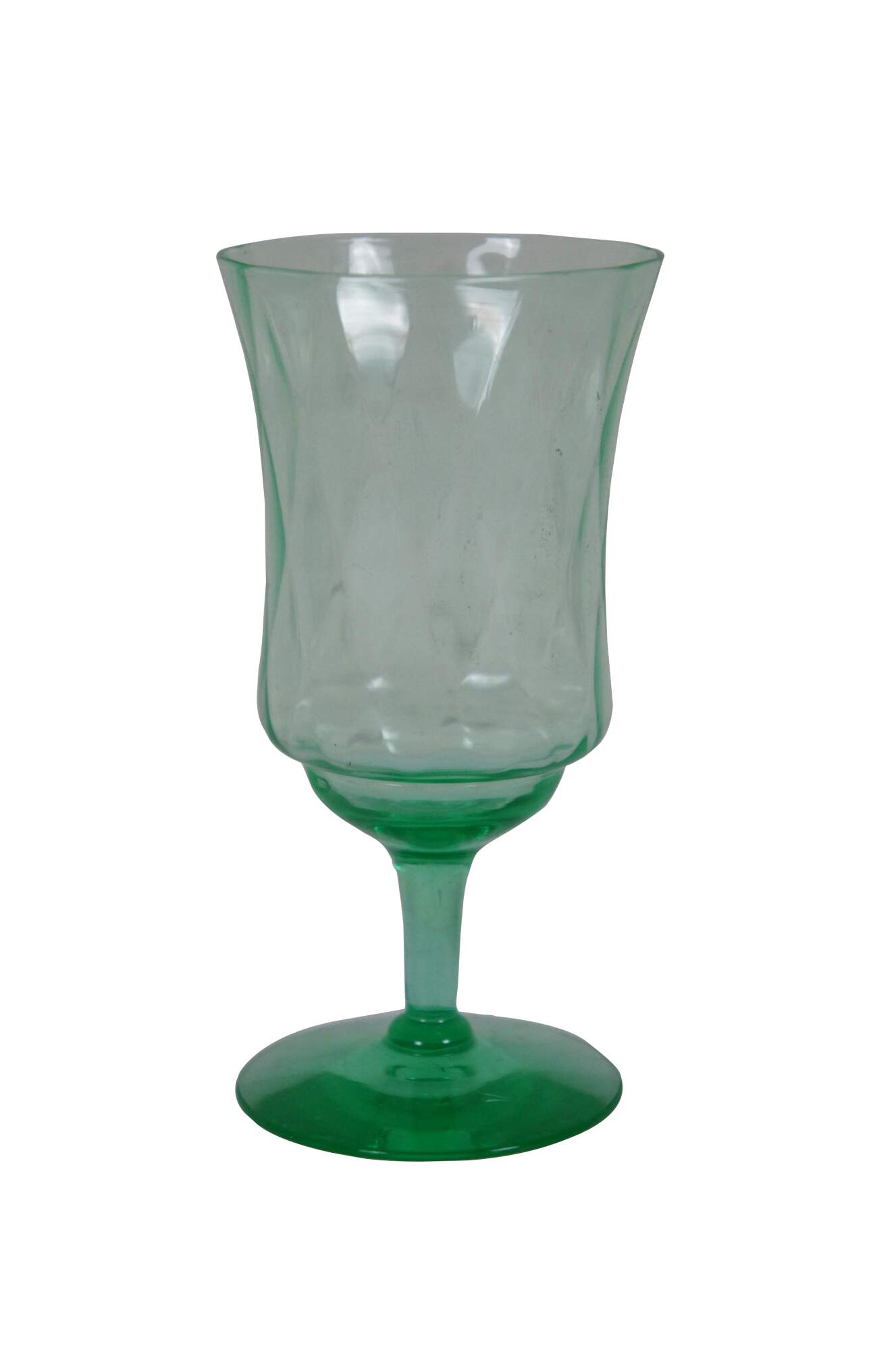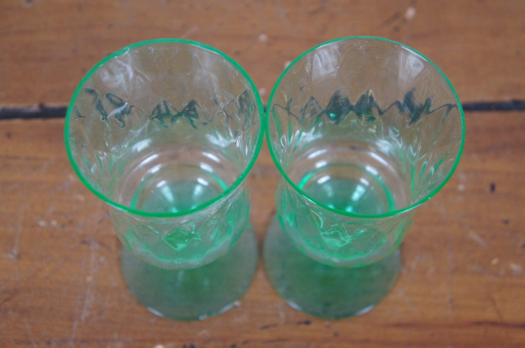 Pair of early to mid 20th century green uranium glass wine goblets with flared mouth and subtle diamond pattern texture. Attributed to Hazel Atlas, harlequin pattern.