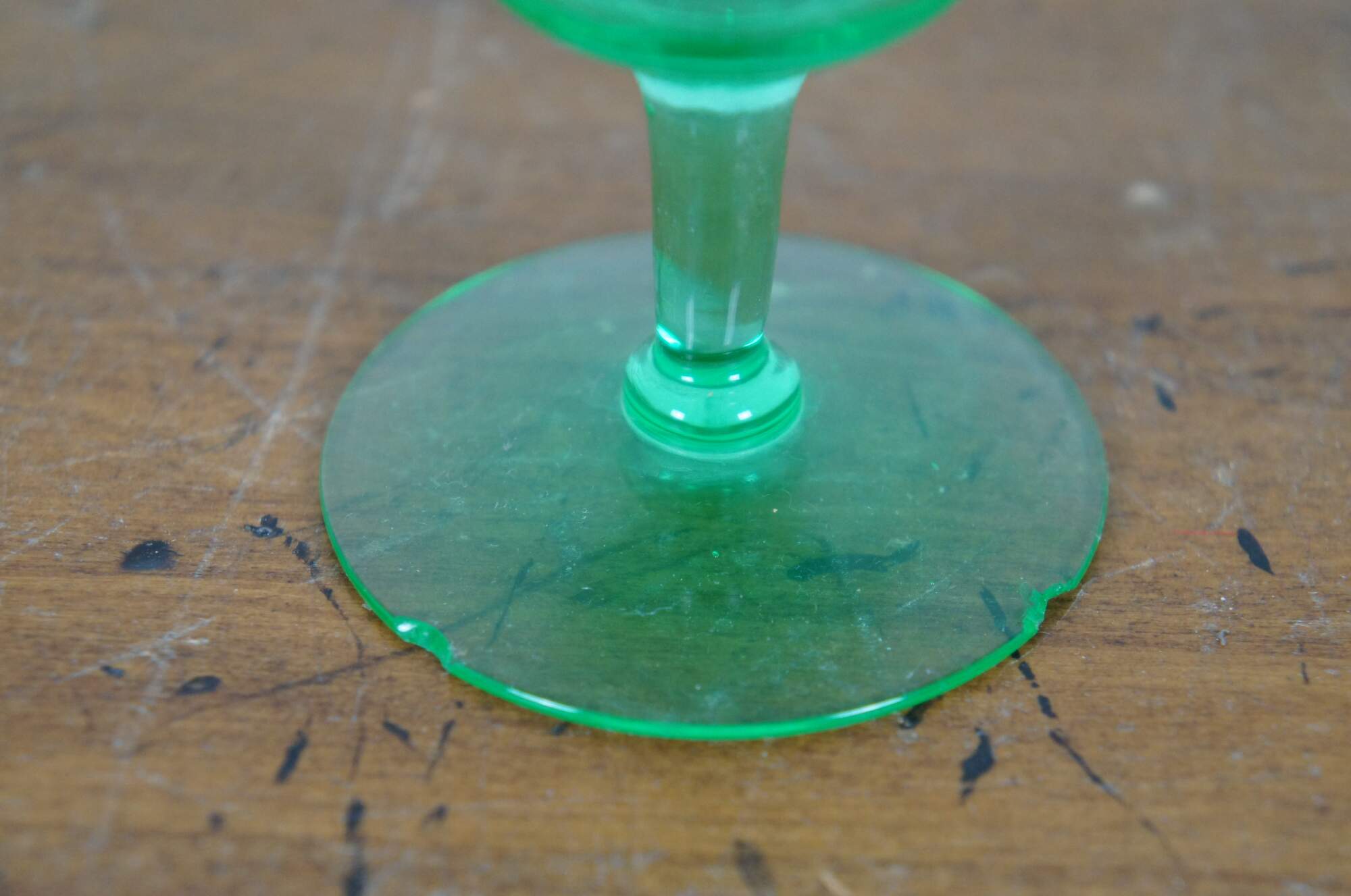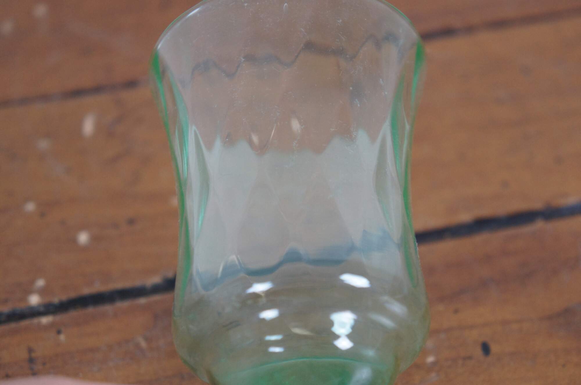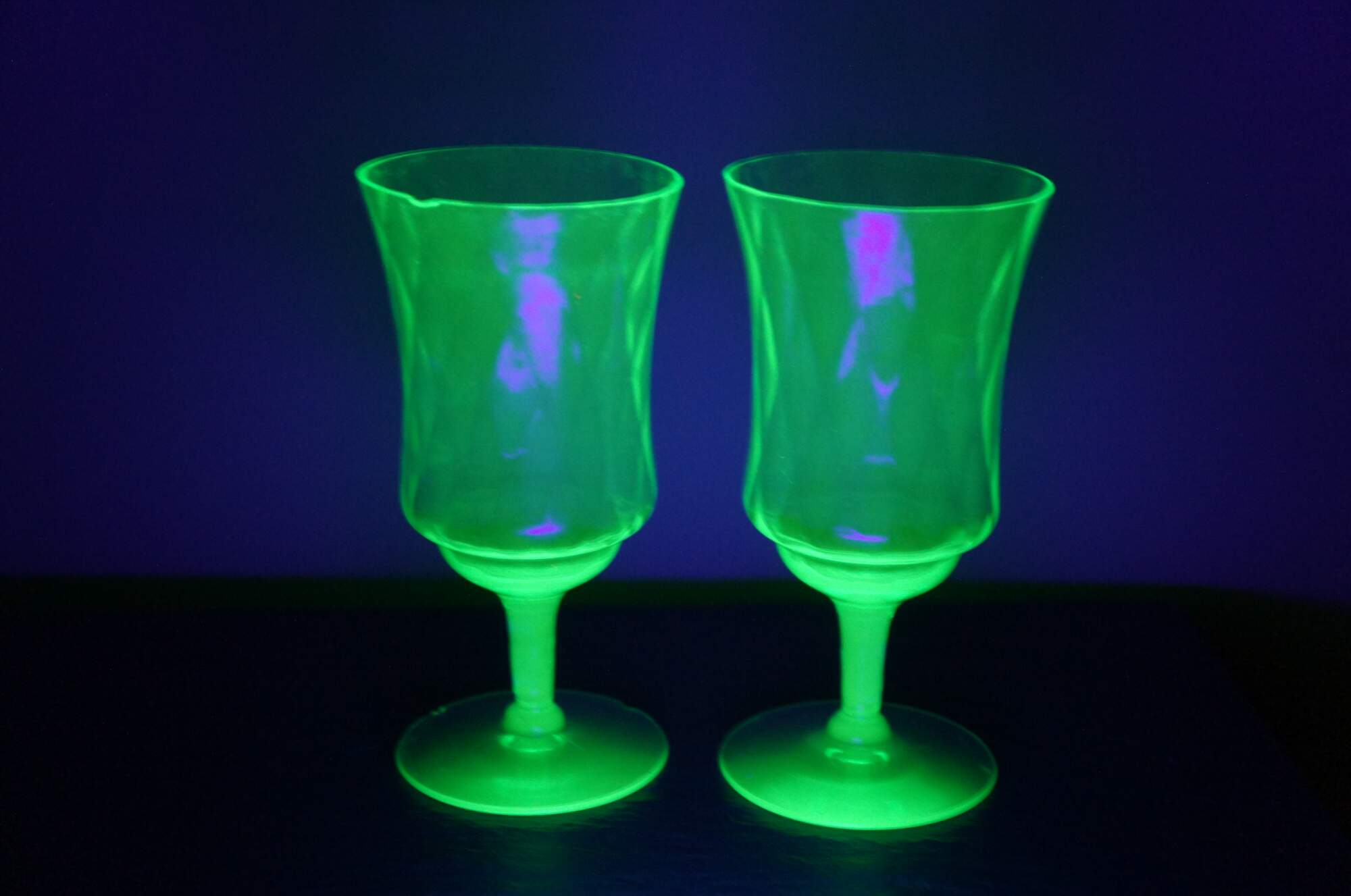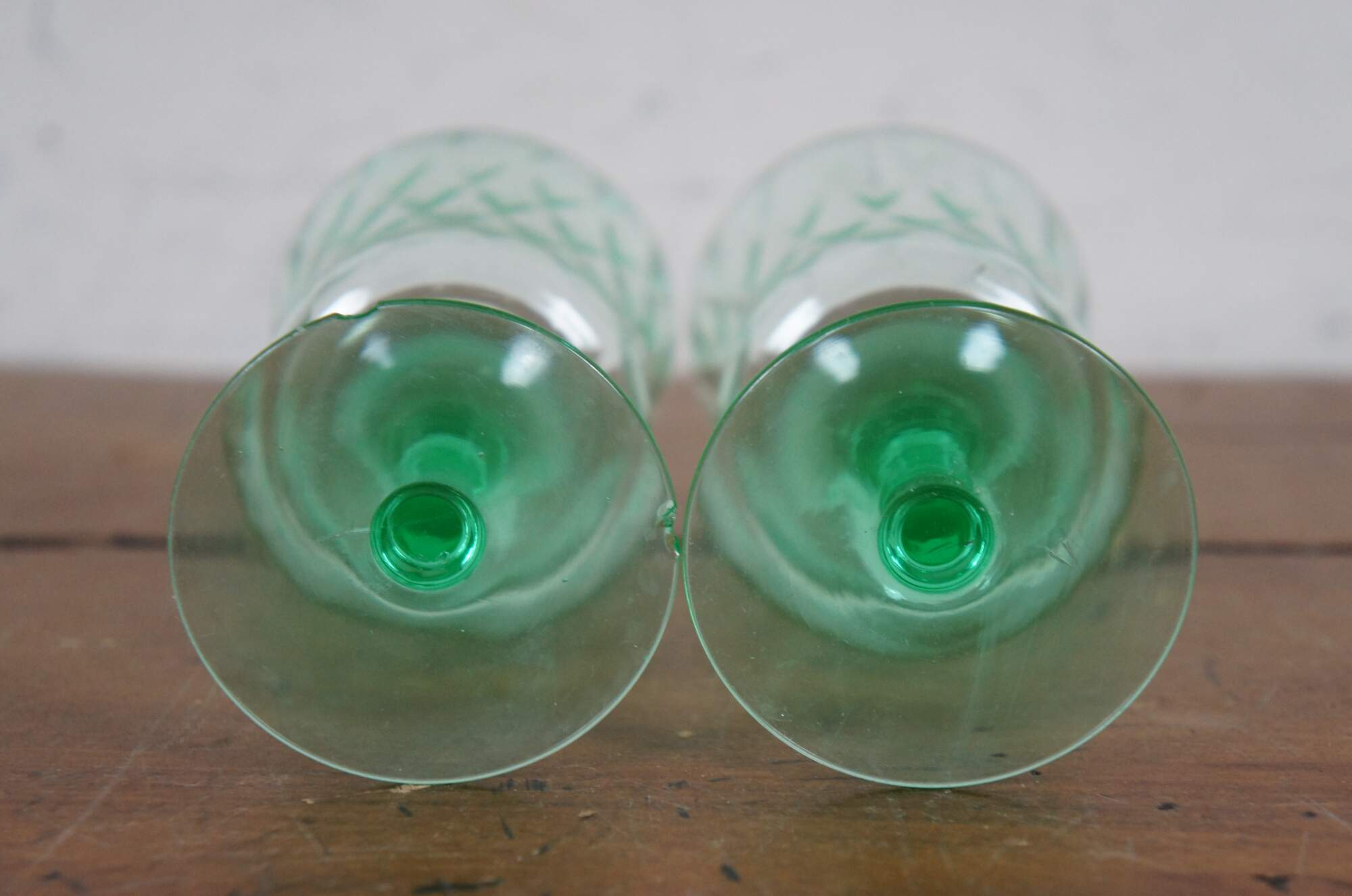 Pair of early to mid 20th century green uranium glass wine goblets with flared mouth and subtle diamond pattern texture. Attributed to Hazel Atlas, harlequin pattern.