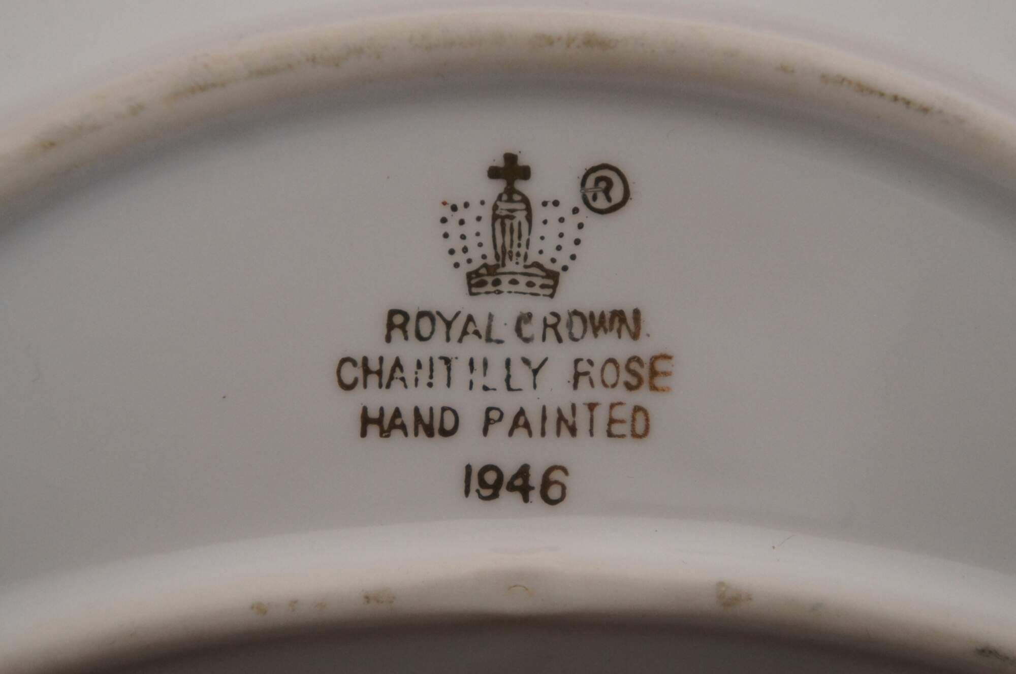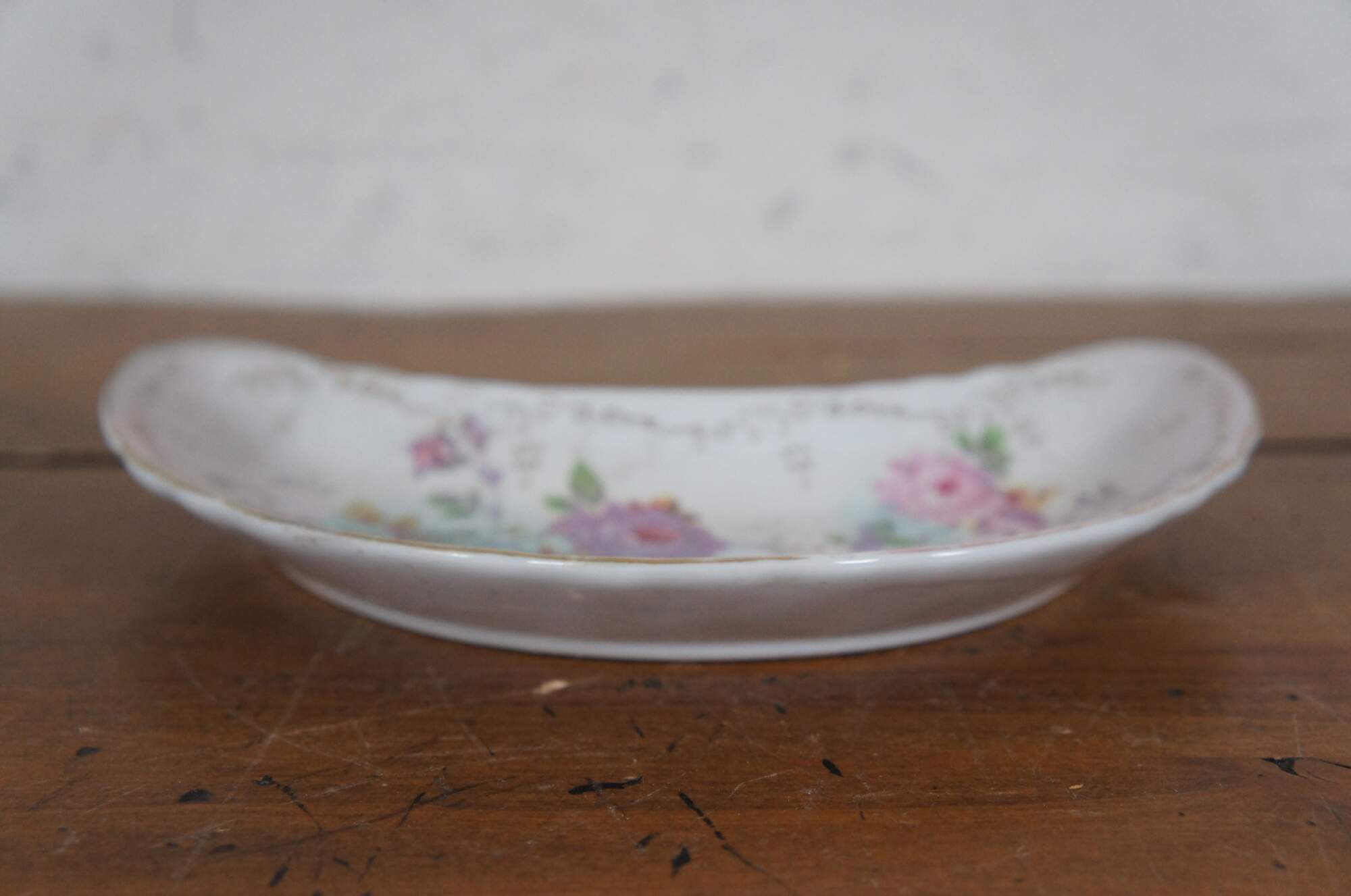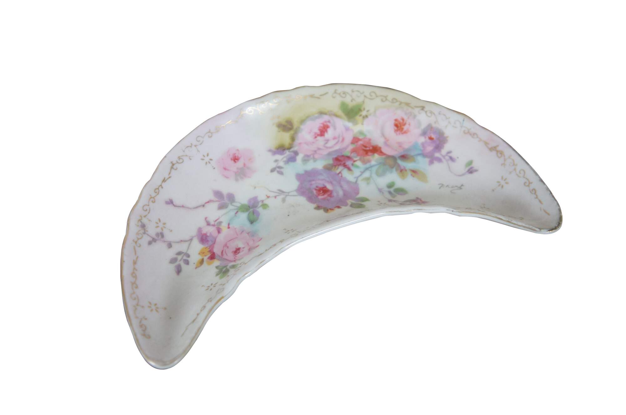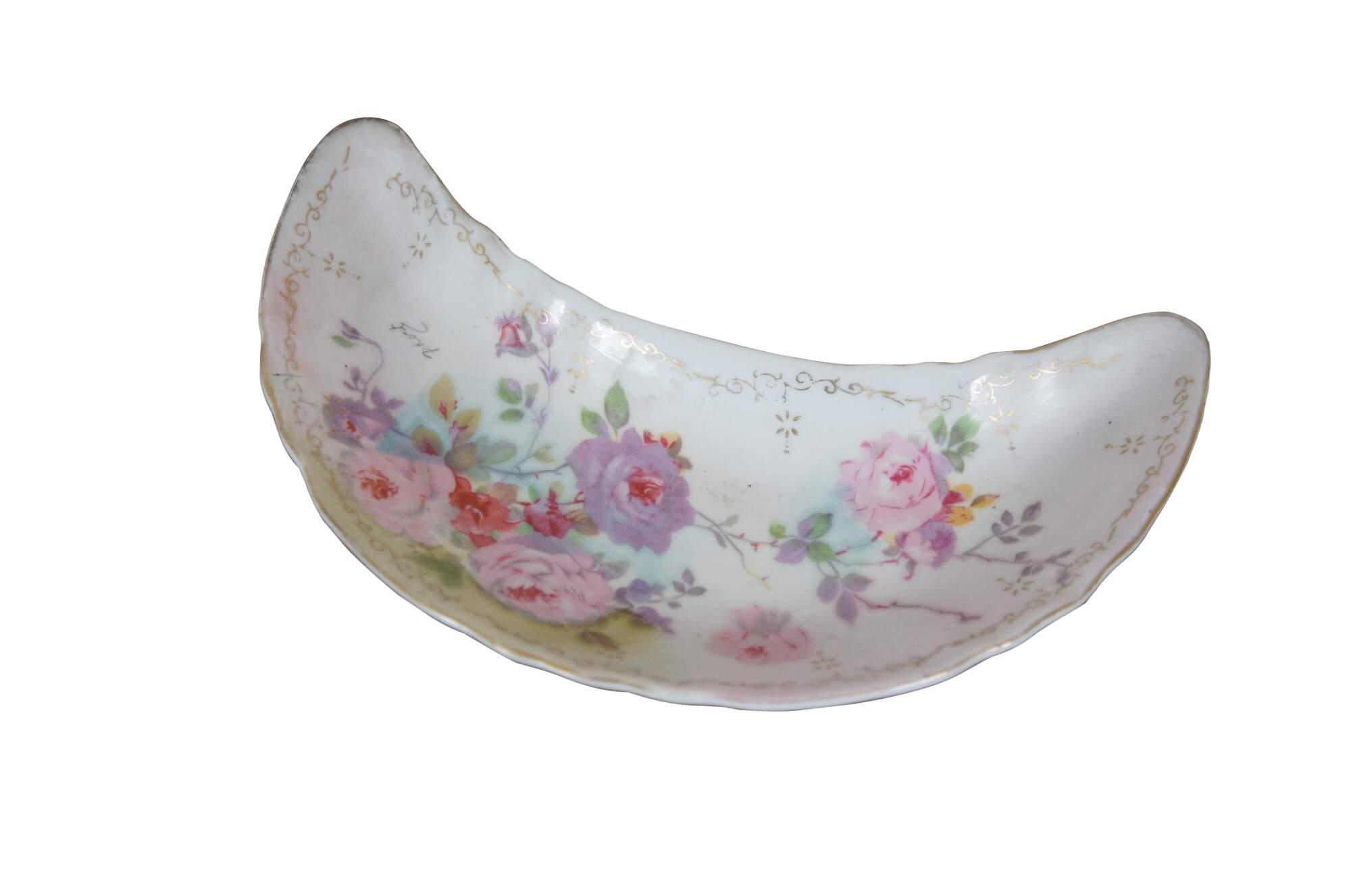 Antique 1946 crescent shaped porcelain salad dish / bone dish / trinket dish by Royal Crown of Japan in the Chantilly Rose pattern. Scalloped edge crescent moon shape, decorated with pink and purple roses in a combination of printed and hand painted details. Signed P. Kent.