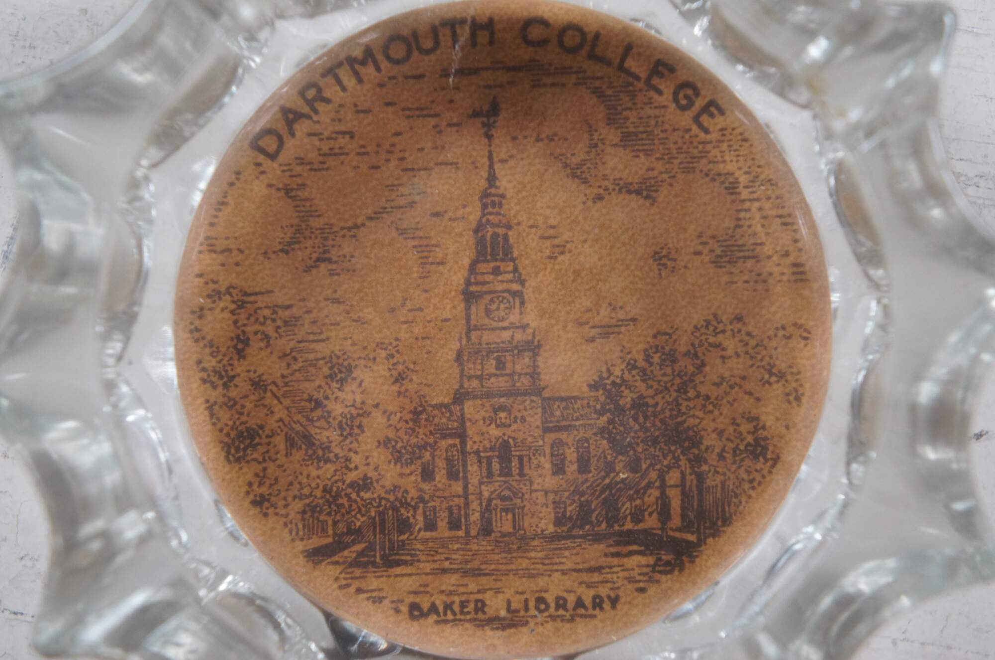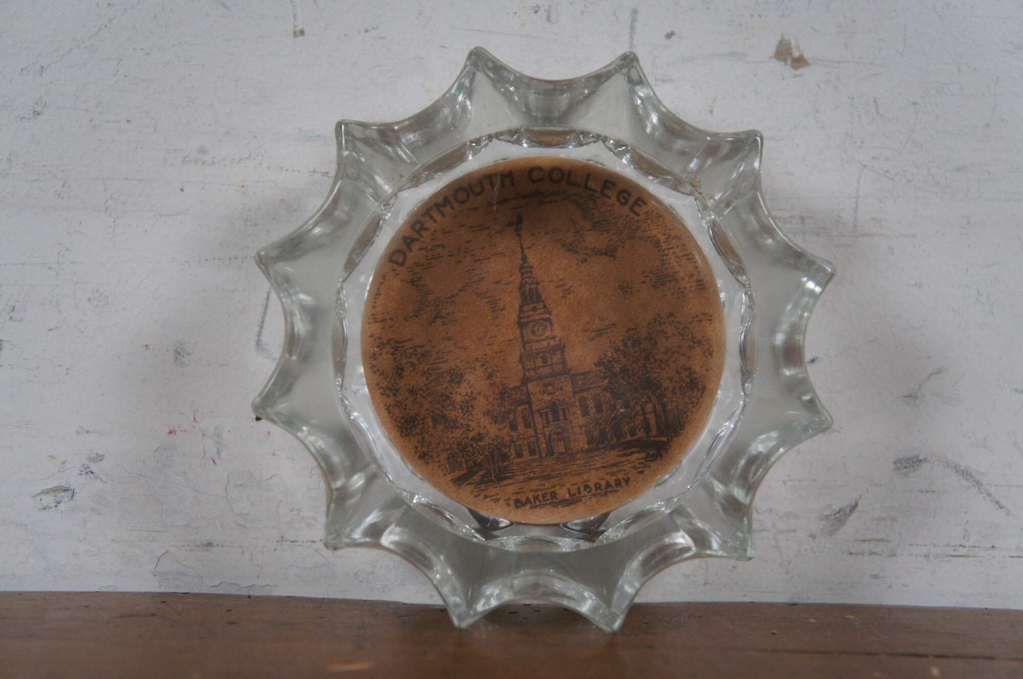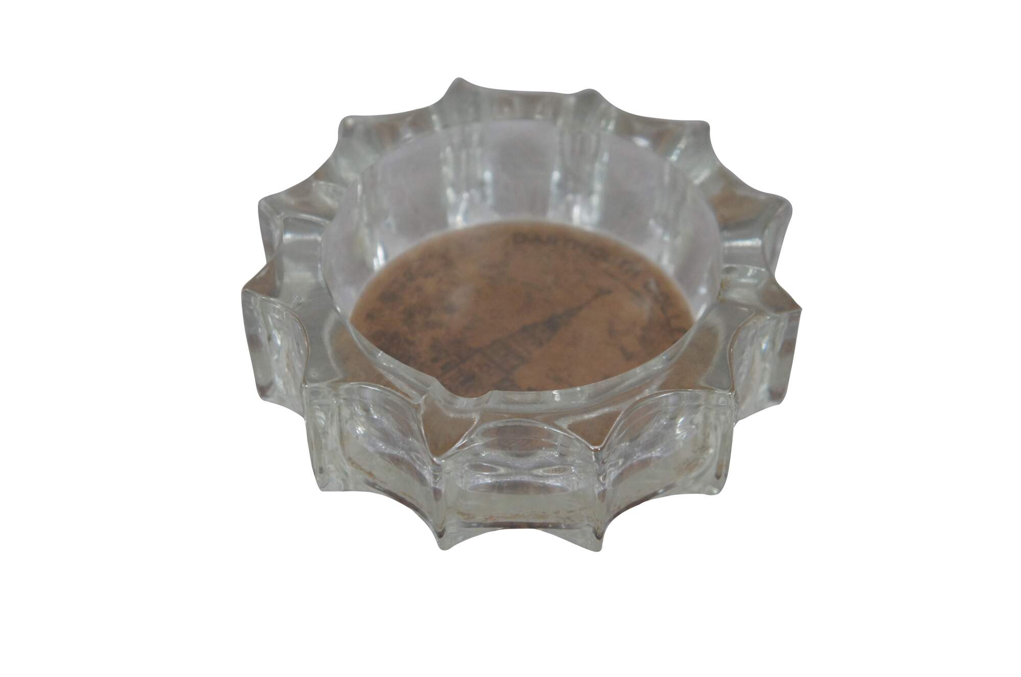 Sturdy vintage 20th century clear glass ashtray or paperweight with a scalloped, sunburst shaped edge and four cigarette rests. Cork base decorated with the sepia toned image of Dartmouth College's Baker Library.