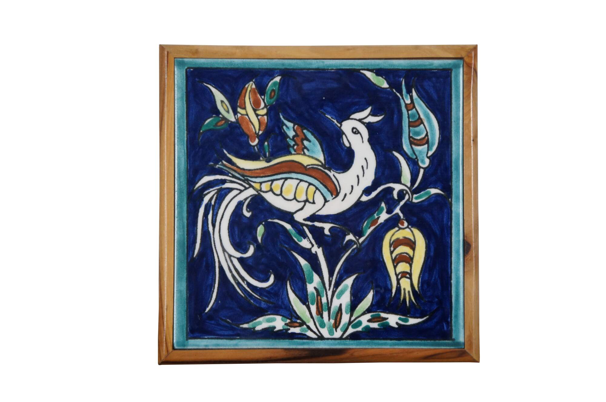 Late 20th cigar-box shaped pine trinket / jewelry box. Square form; lid features a ceramic tile hand painted with an iznik style Middle Eastern / Turskish moftif of a bird on a flowering plant in blues, brown and yellow. Scalloped latch closure. Interior and base lined with red felt.