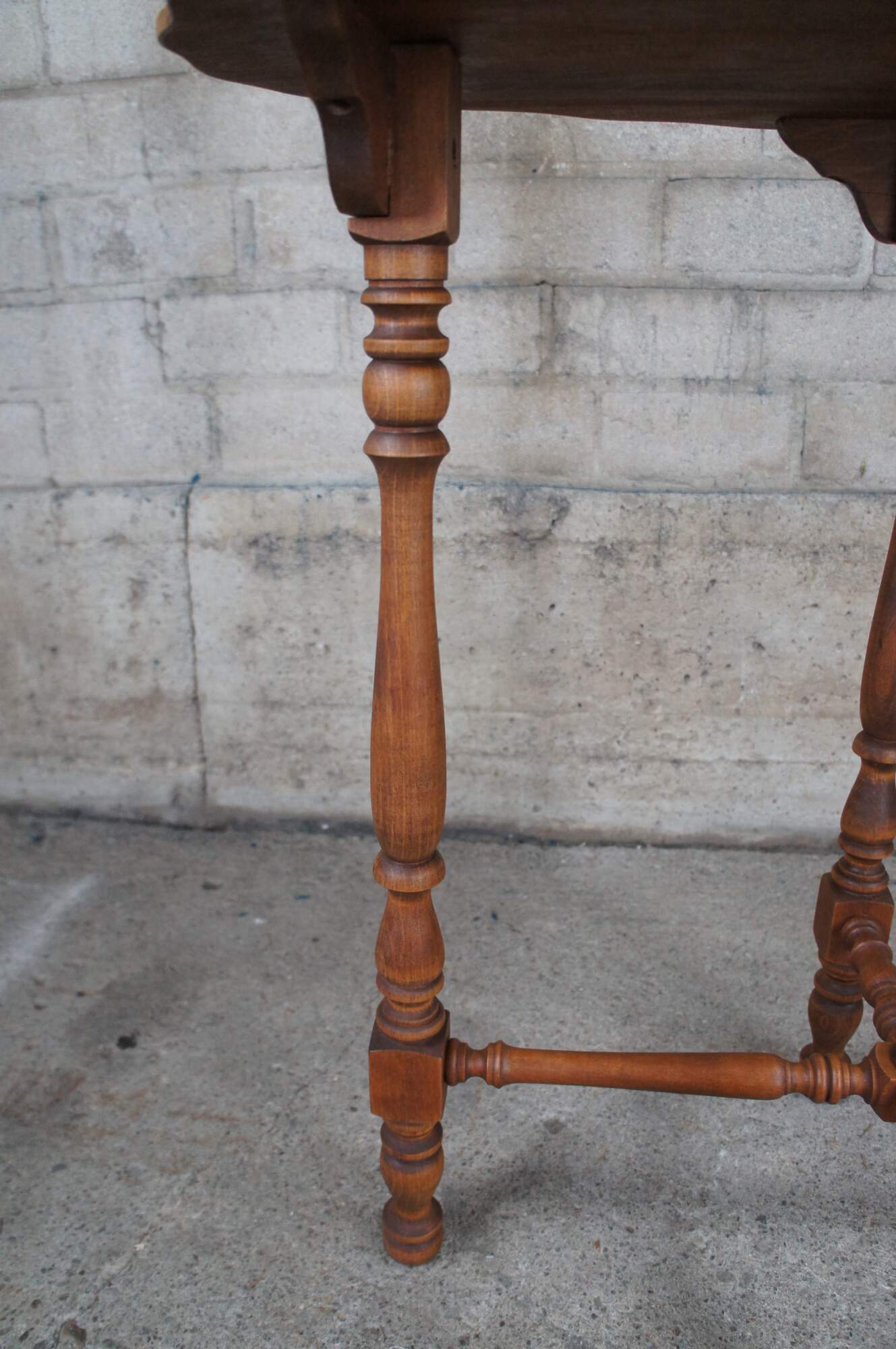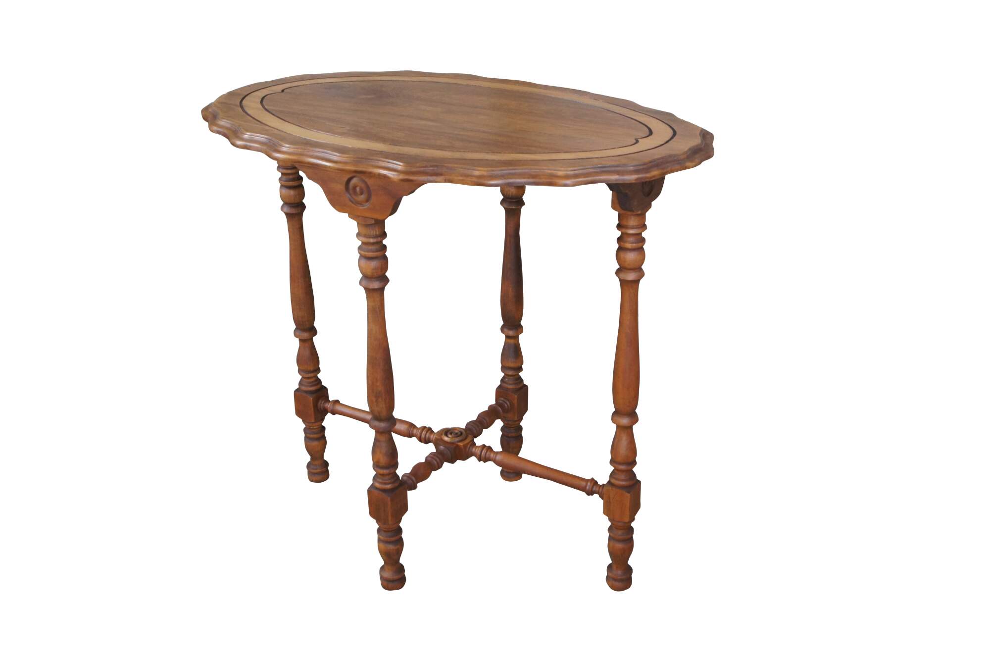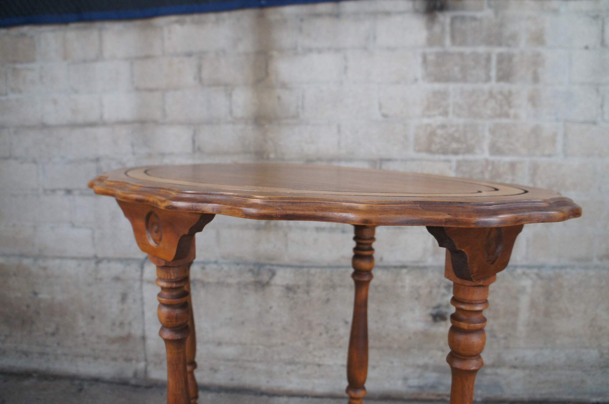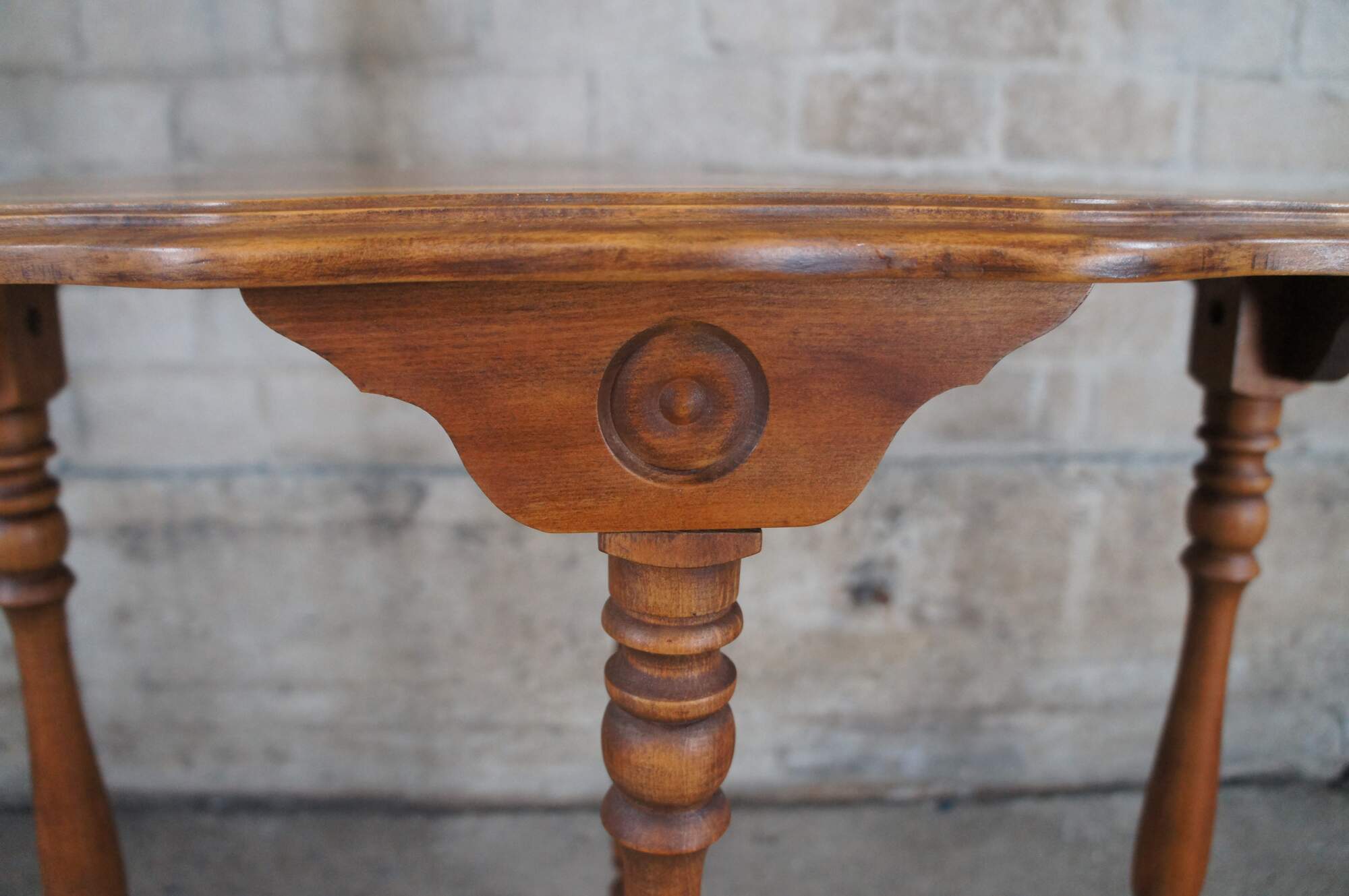 Antique Maple late Victorian parlor console table featuring Eastlake styling with scalloped oval form and turned legs connected by stretcher.