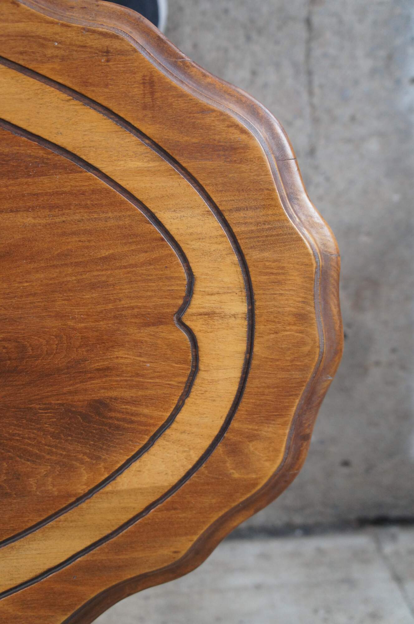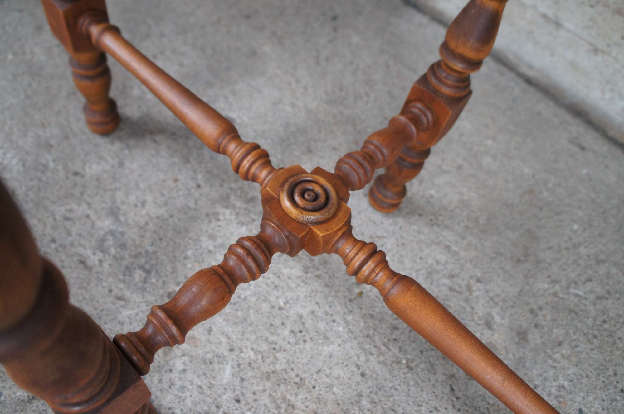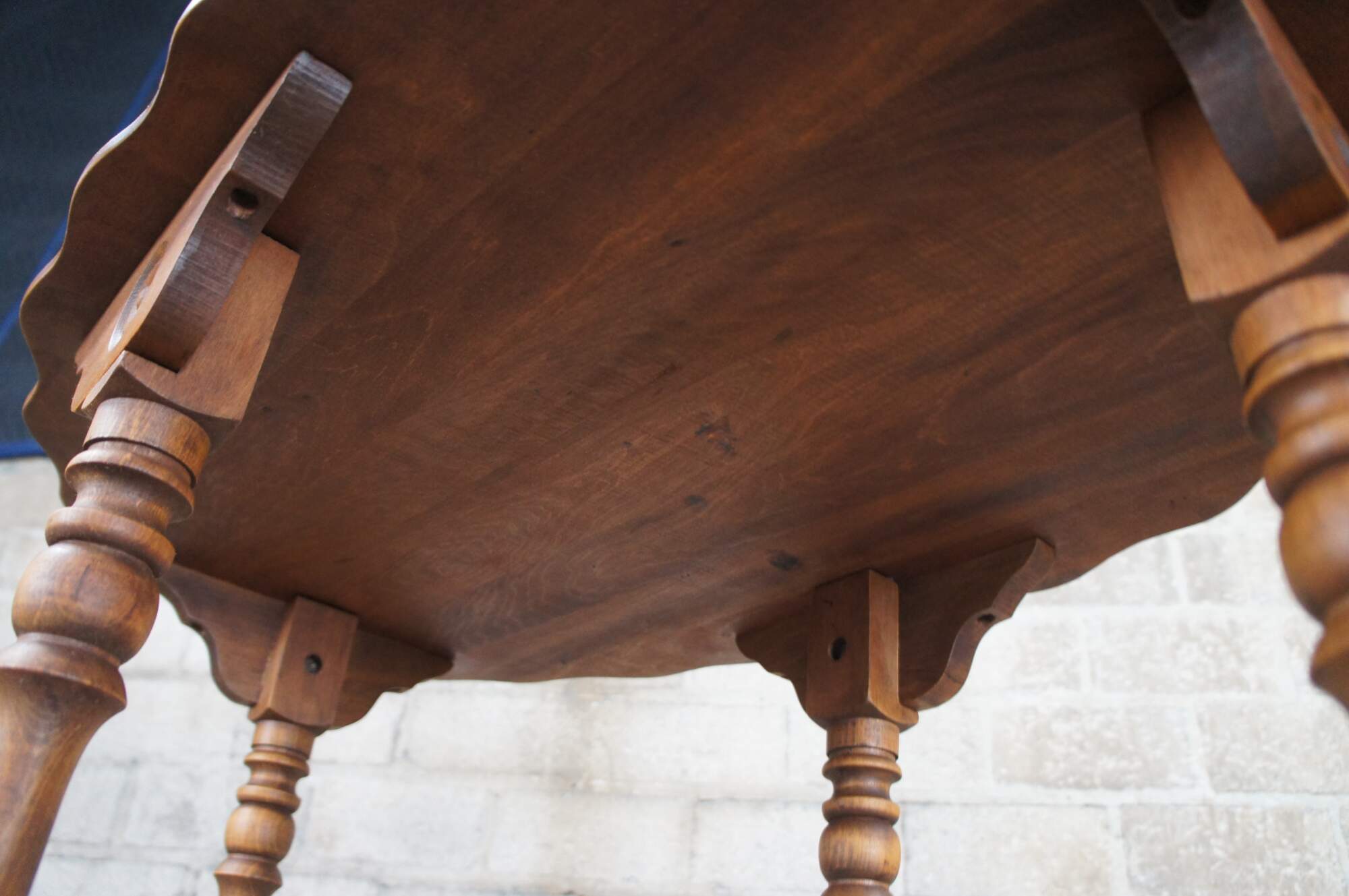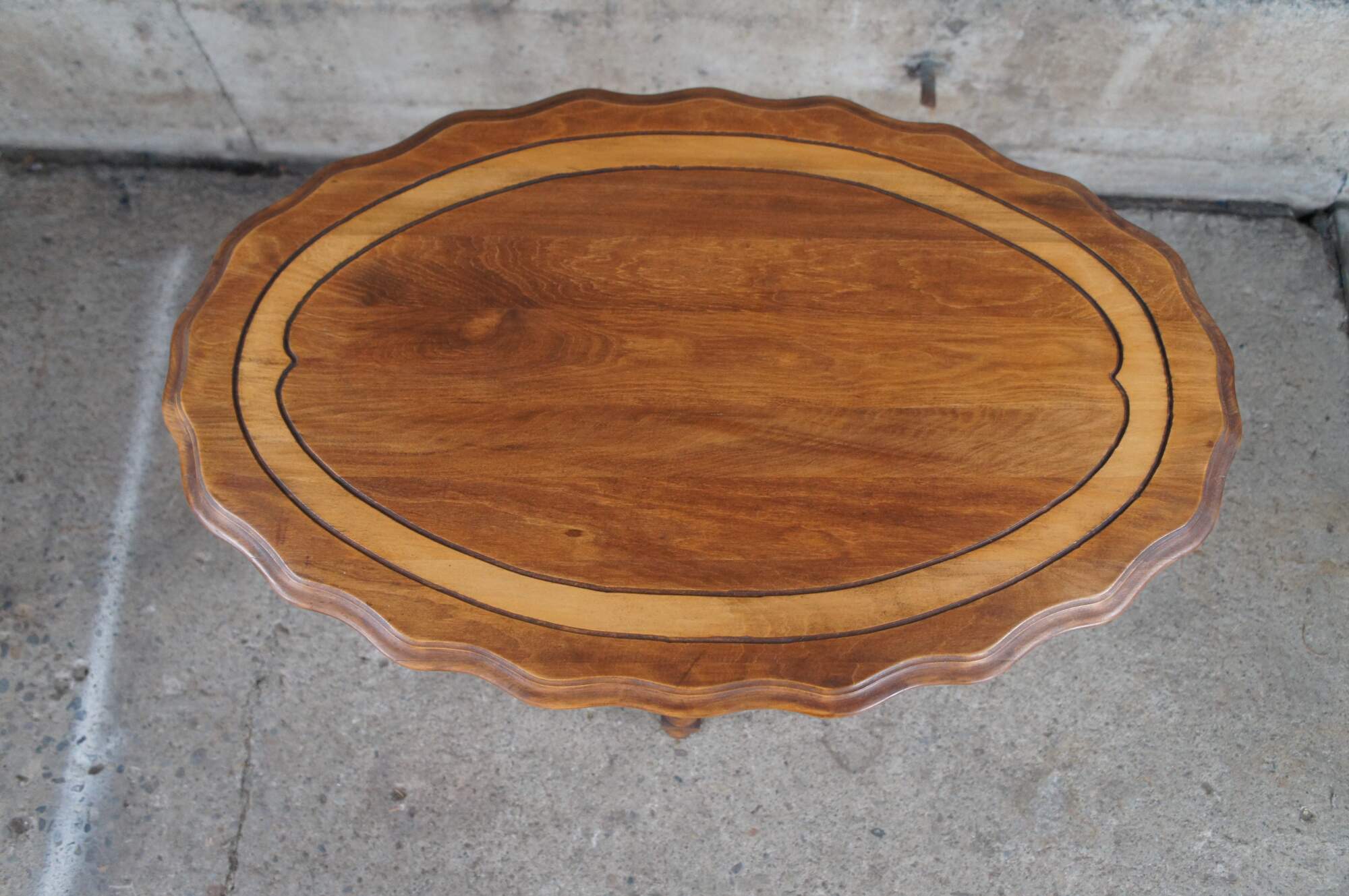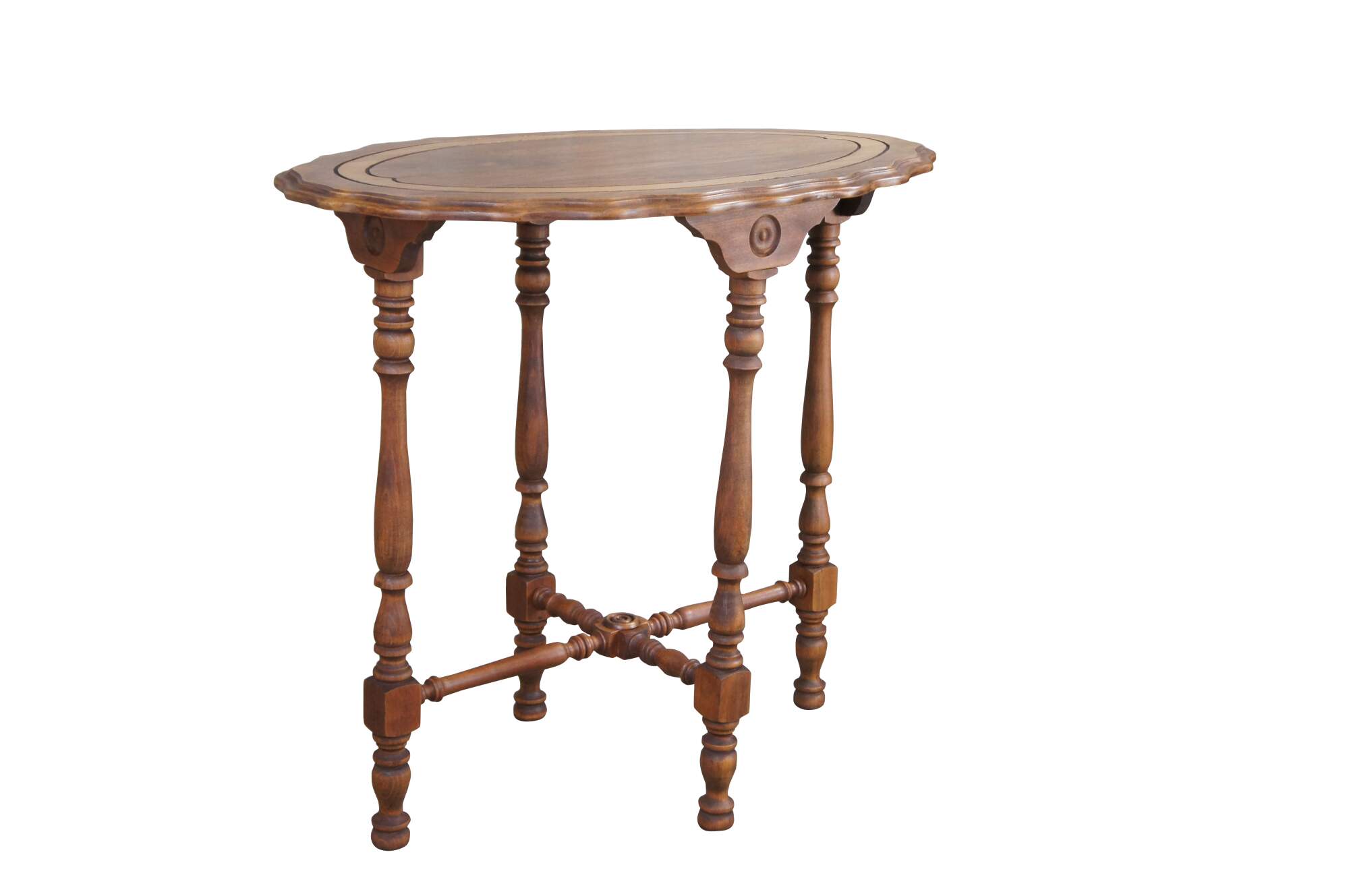 Antique Maple late Victorian parlor console table featuring Eastlake styling with scalloped oval form and turned legs connected by stretcher.