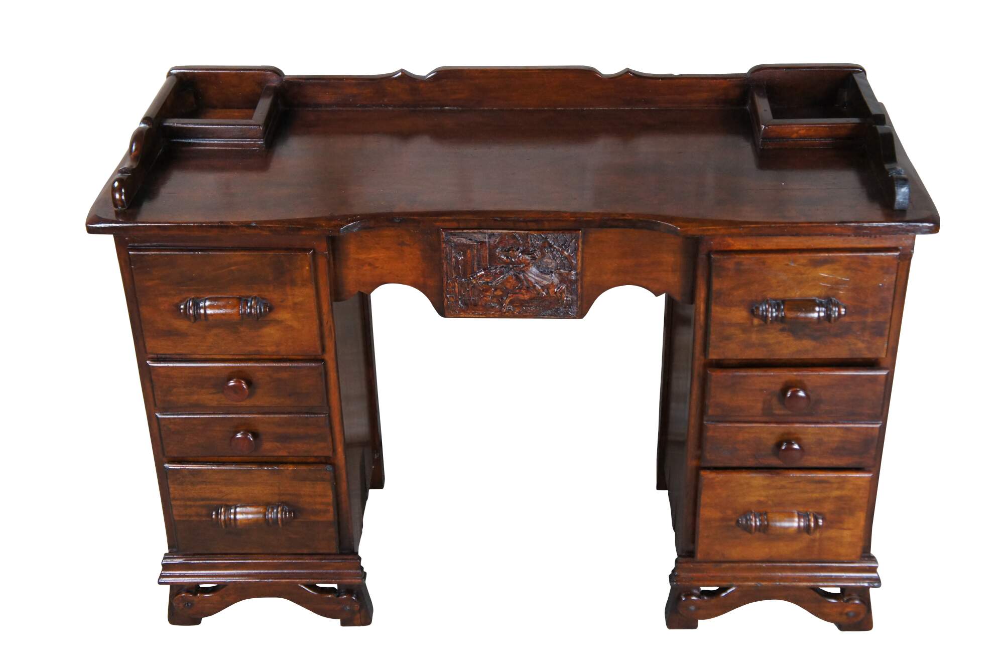 Vintage kneehole library / vanity / writing desk. Made of mahogany featuring traditional styling with upper gallery encasing two cubbies or ink compartments over multiple drawers and carved colonial scene with man on horseback riding past a farmhouse.