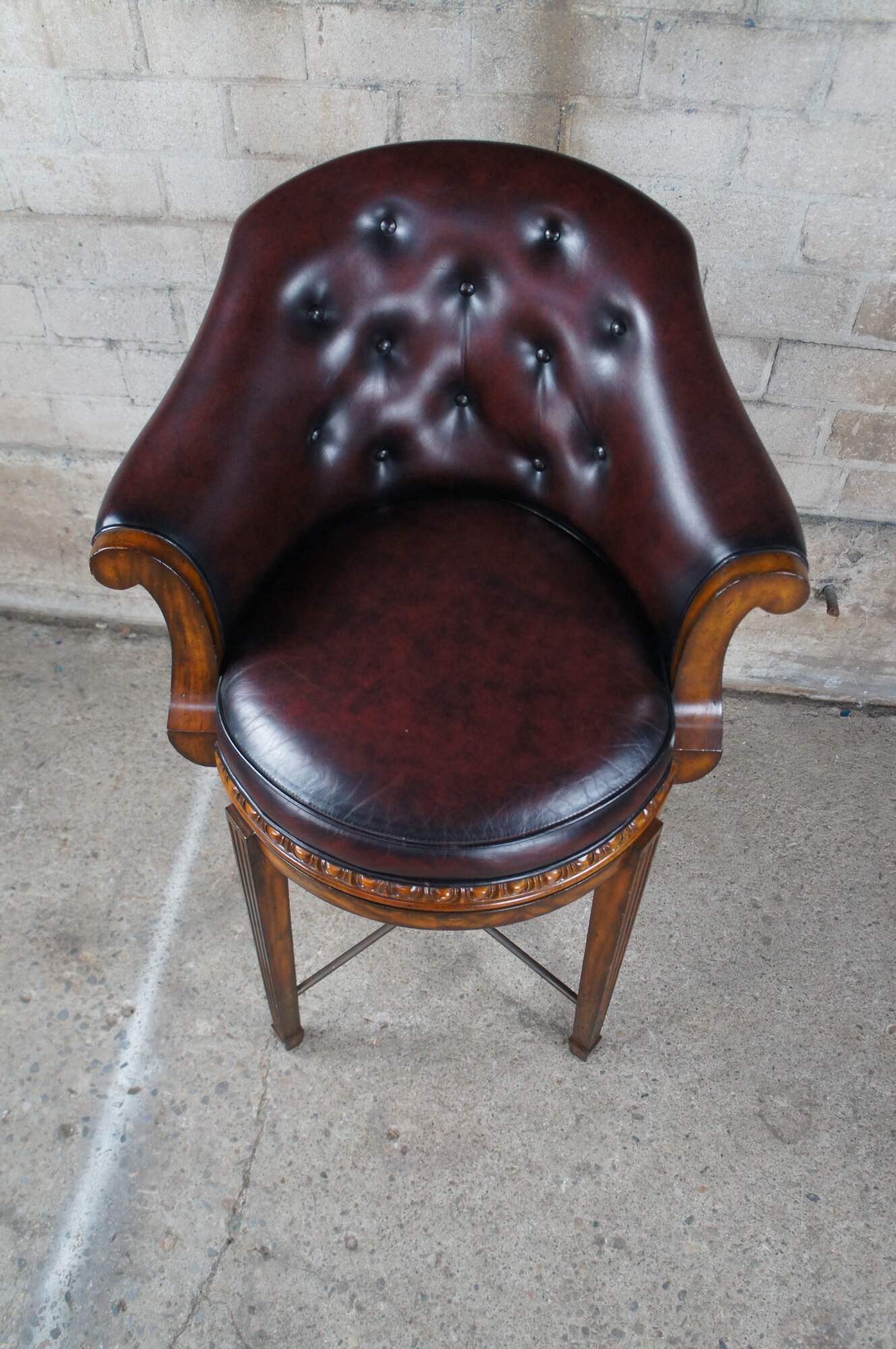 Vintage Theodore Alexander swivel bar or counter stool. Made of flamed mahogany featuring flared arms, domed back and tufted leather.