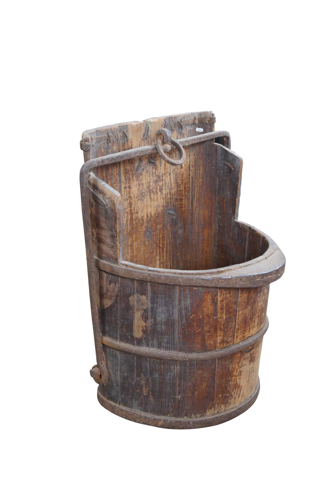 Primitive Chinese water bucket, circa 1890s-1910. Made elm and forged iron. Beautifully worn from years of use. A great decorative piece that could also be re-purposed as a planter, garbage can, cane or umbrella stand.