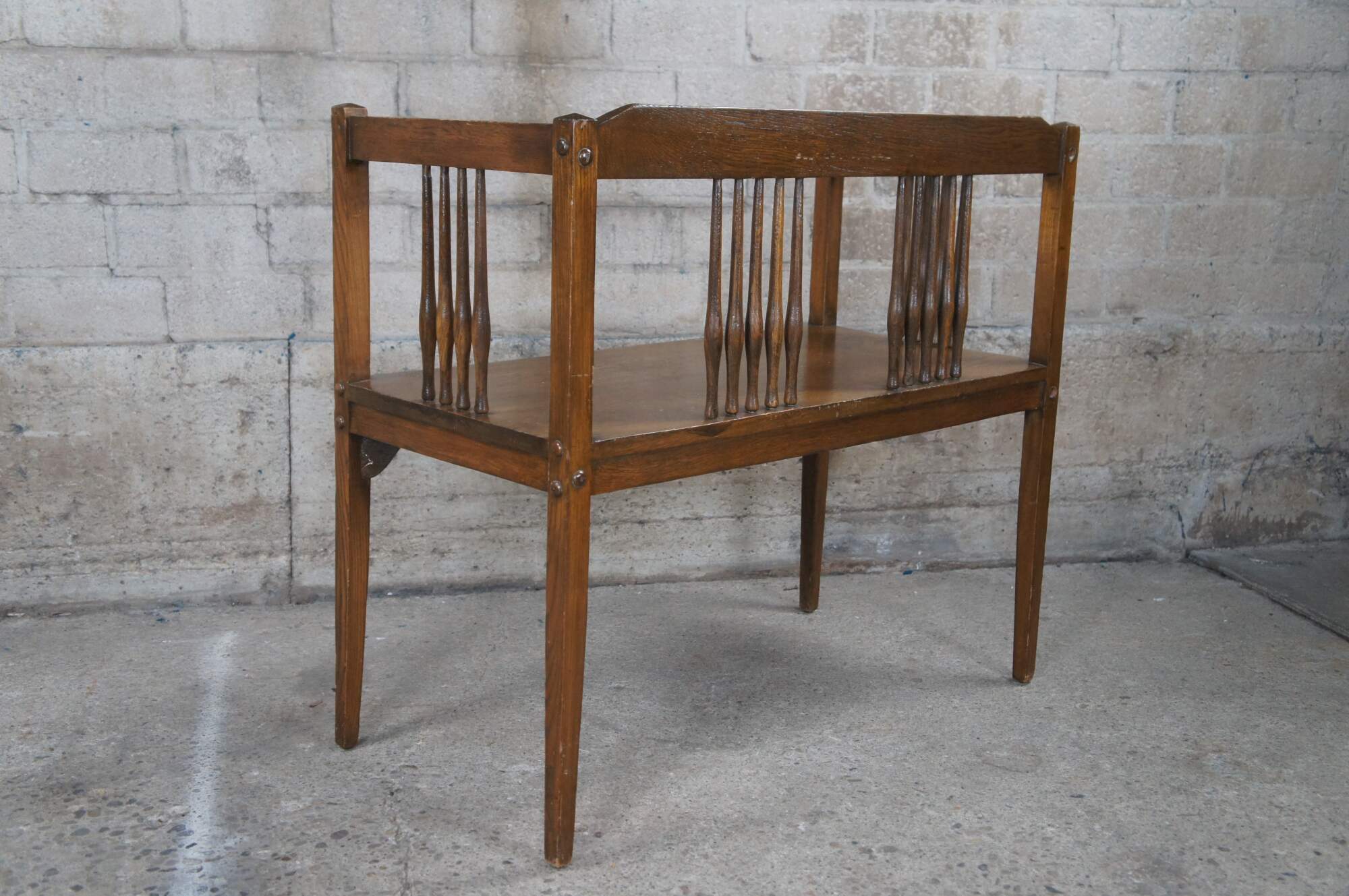 Mid to early 20th century bench / settee and arm chair. Made of oak featuring Mission and arts & crafts styling with squared design, spindles and tapered legs.